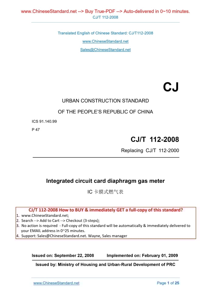 CJ/T 112-2008: Integrated circuit card diaphragm gas meter Delivery: 9 seconds. True-PDF full-copy in English & invoice will be downloaded + auto-delivered via email. See step-by-step procedure Status: Valid CJ/T 112: Historical versions