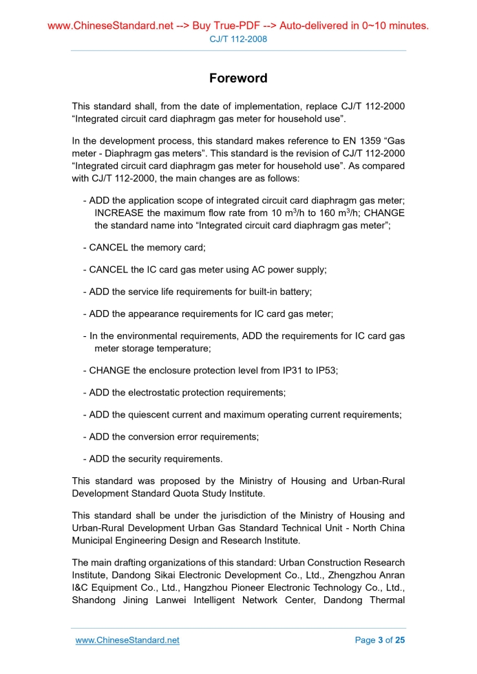 CJ/T 112-2008: Integrated circuit card diaphragm gas meter---This is an excerpt. Full copy of true-PDF in English version (including equations, symbols, images, flow-chart, tables, and figures etc.), auto-downloaded/delivered in 9 seconds, can be purchased online: https://www.ChineseStandard.net/PDF.aspx/CJT112-2008CJ URBAN CONSTRUCTION STANDARD OF THE PEOPLE’S REPUBLIC OF CHINA ICS 91.140.99 P 47 Replacing CJ/T 112-2000 Integrated circuit card diaphragm gas meter IC卡膜式燃气表 Issued on: SEPTEMBER 22, 2008 Implemented on: FEBRUARY 01, 2009 Issued by. Ministry of Housing and Urban-Rural Development of PRC Table of ContentsForeword ... 3 1 Scope ... 5 2 Normative references ... 5 3 Terms and definitions ... 6 4 Model preparation ... 7 5 General requirements ... 7 6 Technical requirements ... 8 7 Test methods ... 13 8 Inspection rules ... 20 9 Marking, packaging, transportation and storage ... 23ForewordThis standard shall, from the date of implementation, replace CJ/T 112-2000 “Integrated circuit card diaphragm gas meter for household use”. In the development process, this standard makes reference to EN 1359 “Gas meter - Diaphragm gas meters”. This standard is the revision of CJ/T 112-2000 “Integrated circuit card diaphragm gas meter for household use”. As compared with CJ/T 112-2000, the main changes are as follows. - ADD the application scope of integrated circuit card diaphragm gas meter; INCREASE the maximum flow rate from 10 m3/h to 160 m3/h; CHANGE the standard name into “Integrated circuit card diaphragm gas meter”; - CANCEL the memory card; - CANCEL the IC card gas meter using AC power supply; - ADD the service life requirements for built-in battery; - ADD the appearance requirements for IC card gas meter; - In the environmental requirements, ADD the requirements for IC card gas meter storage temperature; - CHANGE the enclosure protection level from IP31 to IP53; - ADD the electrostatic protection requirements; - ADD the quiescent current and maximum operating current requirements; - ADD the conversion error requirements; - ADD the security requirements. This standard was proposed by the Ministry of Housing and Urban-Rural Development Standard Quota Study Institute. This standard shall be under the jurisdiction of the Ministry of Housing and Urban-Rural Development Urban Gas Standard Technical Unit - North China Municipal Engineering Design and Research Institute. The main drafting organizations of this standard. Urban Construction Research Institute, Dandong Sikai Electronic Development Co., Ltd., Zhengzhou Anran I&C Equipment Co., Ltd., Hangzhou Pioneer Electronic Technology Co., Ltd., Shandong Jining Lanwei Intelligent Network Center, Dandong Thermal Integrated circuit card diaphragm gas meter1 ScopeThis standard specifies the technical requirements, test methods, inspection rules, marking, packaging, transportation and storage of IC card diaphragm gas meters with a maximum flow of 160 m3/h. This standard is applicable to the design, production, testing and acceptance of IC card diaphragm gas meter (hereinafter referred to as gas meter).2 Normative referencesThe provisions in following documents become the provisions of this Standard through reference in this Standard. For the dated references, the subsequent amendments (excluding corrections) or revisions do not apply to this Standard; however, parties who reach an agreement based on this Standard are encouraged to study if the latest versions of these documents are applicable. For undated references, the latest edition of the referenced document applies. GB/T 2423.17 Environmental testing for electric and electronic products - Part 2. Test method - Test Ka. Salt mist (GB/T 2423.17-1993, eqv IEC 60068-2-11.1981) GB/T 2828.1 Sampling procedures for inspection by attribute - Part 1. Sampling schemes indexed by acceptance quality limit (AQL) for lot-by-lot inspection (GB/T 2828.1-2003, ISO 2859-1.1999, IDT) GB/T 2829 Sampling procedures and tables for periodic inspection by attributes (Apply to inspection of process stability) GB/T 4208-1993 Enclosure protection class (IP code) (eqv IEC 529.1989) GB/T 6968 Diaphragm gas meters GB/T 17626.2-2006 Electromagnetic compatibility (EMC) - Testing and measurement techniques - Electrostatic discharge immunity test (GB/T 17626.2-2006, IEC 61000-4-2.1995, IDT) GB/T 17626.3-2006 Electromagnetic compatibility (EMC) - Testing and measurement techniques - Radiated radio frequency electromagnetic field immunity test (GB/T 17626.3-2006, IEC 61000-4-3.2002, IDT) CJ/T 3074-1998 Electronic controller of household gas burning appliances CJ/T 3075.2-1998 Laboratory of gas burning appliances - Test equipment and device JJG 577 Verification regulation of diaphragm gas meter3 Terms and definitionsThe following terms and definitions apply to this standard. 3.1 IC card diaphragm gas meter It refers to the gas meter which uses the diaphragm gas meter as the basic gas meter and the IC card as the media and is added with controller, having the function of gas pre-purchase. 3.2 Basic gas meter It refers to the diaphragm gas meter used in the IC card diaphragm gas meter. 3.3 Control unit It refers to the device used to read the basic gas meter data, display and control. 3.4 Minimum operating voltage It refers to the minimum set voltage to ensure the normal operation of controller. 3.5 Total pressure loss It refers to, after the gas meter is installed with control valve, the pressure loss between the gas inlet and gas outlet under the specified conditions. 3.6 6.2.1.1 Storage temperature. -25 °C ~ +55 °C, after the restoration of normal temperature, its function shall comply with the requirements of 6.3 and 6.4. 6.2.1.2 Operating temperature. -10 °C ~ +40 °C, AND its function shall comply with the requirements of 6.3, 6.4, and 6.6. 6.2.2 Constant heat and humidity When the relative humidity is 93% and temperature +40 °C, its function shall comply with the requirements of 6.3 and 6.4