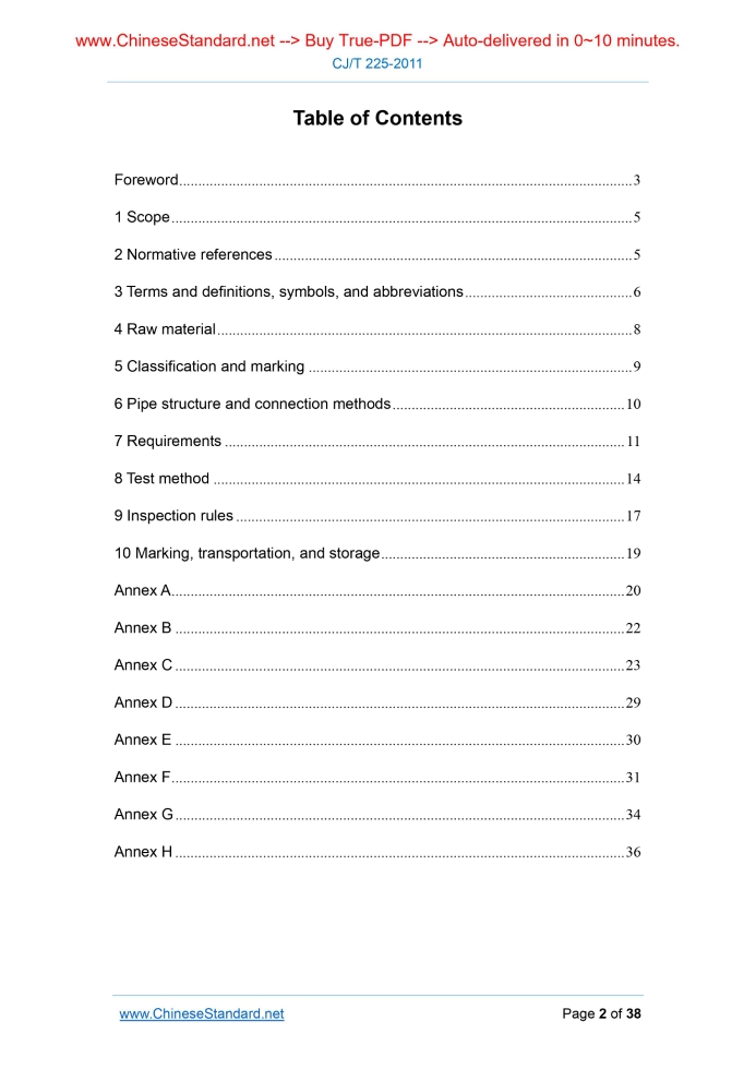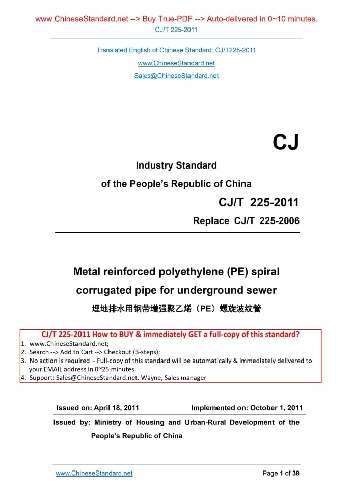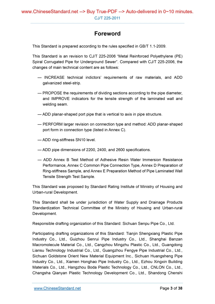 Similar standardsCJ/T 225-2011: Metal reinforced polyethylene (PE) spirally corrugated pipe for underground sewer---This is an excerpt. Full copy of true-PDF in English version (including equations, symbols, images, flow-chart, tables, and figures etc.), auto-downloaded/delivered in 9 seconds, can be purchased online: https://www.ChineseStandard.net/PDF.aspx/CJT225-2011 CJ Industry Standard of the People’s Republic of China Replace CJ/T 225-2006 Metal reinforced polyethylene (PE) spiral corrugated pipe for underground sewer Issued on: APRIL 18, 2011 Implemented on: OCTOBER 1, 2011 Issued by. Ministry of Housing and Urban-Rural Development of the People's Republic of China Table of ContentsForeword ... 3 1 Scope ... 5 2 Normative references ... 5 3 Terms and definitions, symbols, and abbreviations ... 6 4 Raw material ... 8 5 Classification and marking ... 9 6 Pipe structure and connection methods ... 10 7 Requirements ... 11 8 Test method ... 14 9 Inspection rules ... 17 10 Marking, transportation, and storage ... 19 Annex A ... 20 Annex B ... 22 Annex C ... 23 Annex D ... 29 Annex E ... 30 Annex F ... 31 Annex G ... 34 Annex H ... 36ForewordThis Standard is prepared according to the rules specified in GB/T 1.1-2009. This Standard is an revision to CJ/T 225-2006 “Metal Reinforced Polyethylene (PE) Spiral Corrugated Pipe for Underground Sewer”. Compared with CJ/T 225-2006, the changes of main technical content are as follows. — INCREASE technical indictors’ requirements of raw materials, and ADD galvanized steel-strip. — PROPOSE the requirements of dividing sections according to the pipe diameter, and IMPROVE indicators for the tensile strength of the laminated wall and welding seam. — ADD planar-shaped port pipe that is vertical to axis in pipe structure. — PERFORM larger revision on connection type and method. ADD planar-shaped port form in connection type (listed in Annex C). — ADD ring-stiffness SN10 level. — ADD pipe dimensions of 2200, 2400, and 2600 specifications. — ADD Annex B Test Method of Adhesive Resin Water Immersion Resistance Performance, Annex C Common Pipe Connection Type, Annex D Preparation of Ring-stiffness Sample, and Annex E Preparation Method of Pipe Laminated Wall Tensile Strength Test Sample. This Standard was proposed by Standard Rating Institute of Ministry of Housing and Urban-rural Development. This Standard shall be under jurisdiction of Water Supply and Drainage Products Standardization Technical Committee of the Ministry of Housing and Urban-rural Development. Responsible drafting organization of this Standard. Sichuan Senpu Pipe Co., Ltd. Participating drafting organizations of this Standard. Tianjin Shengxiang Plastic Pipe Industry Co., Ltd., Guizhou Senrui Pipe Industry Co., Ltd., Shanghai Banzan Macromolecule Material Co., Ltd., Cangzhou Mingzhu Plastic Co., Ltd., Guangdong Liansu Technology Industrial Co., Ltd., Guangzhou Fengye Pipe Industrial Co., Ltd., Sichuan Goldstone Orient New Material Equipment Inc., Sichuan Huangsheng Pipe Industry Co., Ltd., Xiamen Honghao Pipe Industry Co., Ltd., Ezhou Xingxin Building Materials Co., Ltd., Hangzhou Boda Plastic Technology Co., Ltd., CNLON Co., Ltd., Changsha Qianyan Plastic Technology Development Co., Ltd., Shandong Chenshi Group Co., Ltd., and Huangsheng Pipe Group Co., Ltd. Main drafters of this Standard. Jiang Zepei, Li Zhi, Li Wenquan, Li Xiaomin, Bi Honghai, Jia Xiaohui, Li Xintuan, He Jianxing, Chen Shaojiang, Wu Zhiguo, Zheng Haoyun, Jiang Jinhua, Chen Huasheng, Ye Zhengmao, Fan Gang, Chu Jiangshun, Chen Xiantao, Wu Jinghua, and Shao Taiqing. Previous version of the standard replaced by this Standard are as follows. — CJ/T 225-2006. Metal reinforced polyethylene (PE) spiral corrugated pipe for underground sewer1 ScopeThis Standard specifies the terms and definitions, symbols, abbreviations, raw materials, grading and marking, pipe structure and connection methods, requirements, test methods, inspection rules, marking, transportation and storage of the metal reinforced polyethylene (PE) spiral corrugated pipe. This Standard applies to the rainwater, sewage and other underground drainage pipeline with transmission medium temperature not greater than 45°C.2 Normative referencesThe following documents are essential for the application of this Standard. For dated references, only dated edition applies to this Standard. For undated references, the latest edition (including all amendments) applies. GB/T 228 Metallic materials - Tensile testing at ambient temperature GB/T 1033.1 Plastics - Methods for determining the density of non-cellular plastics - Part 1. Immersion method liquid pyknometer method and titration method GB/T 1633 Plastics - Thermoplastic materials - Determination of Vicat softening temperature (VST) GB/T 1842 Plastics - Test method for environmental stress-cracking of polyethylene GB/T 2828.1-2003 Sampling procedures for inspection by attributes - Part 1. Sampling schemes indexed by acceptance quality limit (AQL) for lot-by-lot inspection GB/T 2918 Plastics - Standard atmospheres for conditioning and testing GB/T 3682 Determination of the melt mass-flow rate (MFR) and the melt volume- flow rate (MVR) of thermoplastics GB/T 5470 Plastics - Determination of the brittleness temperature by impact GB/T 6111 Thermoplastics pipes for the conveyance of fluids - Resistance to internal pressure - Test method GB/T 8840.3 Thermoplastic pipes - Determination of tensile properties - Part 3. Polyolefin pipes GB/T 9341 Plastics - Determination of flexural properties GB/T 9345.1 Plastics - Determination of ash - Part 1. General methods GB/T 9647 Thermoplastics pipes - Determination of ring-stiffness GB/T 14152-2001 Thermoplastics pipes - Determination of resistance to external blows - Round-the-clock method GB/T 17391 Test method for thermal stability of polyethylene pipes and fittings GB/T 13021 Determination for the carbon-black content of polyethylene pipes and fittings by calcin
