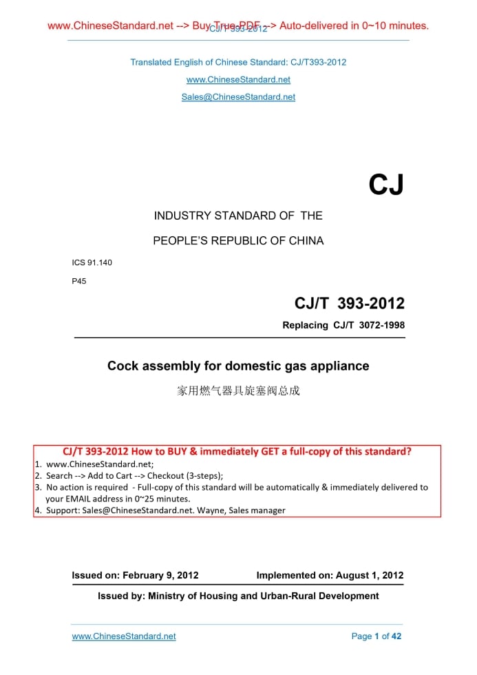 CJ/T 393-2012: Cock assembly for domestic gas appliance Delivery: 9 seconds. True-PDF full-copy in English & invoice will be downloaded + auto-delivered via email. See step-by-step procedure Status: Valid
