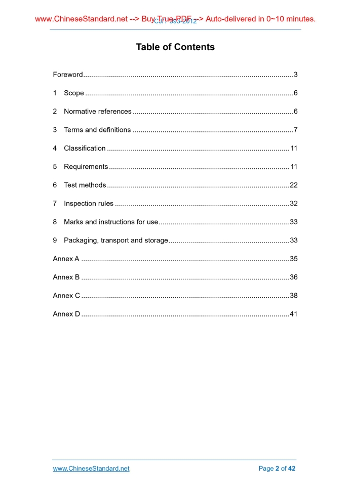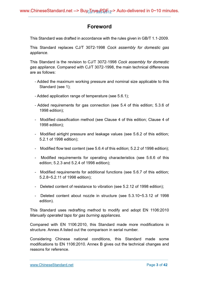 Similar standardsCJ/T 393-2012: Cock assembly for domestic gas appliance---This is an excerpt. Full copy of true-PDF in English version (including equations, symbols, images, flow-chart, tables, and figures etc.), auto-downloaded/delivered in 9 seconds, can be purchased online: https://www.ChineseStandard.net/PDF.aspx/CJT393-2012CJ INDUSTRY STANDARD OF THE PEOPLE’S REPUBLIC OF CHINA ICS 91.140 P45 Replacing CJ/T 3072-1998 Cock assembly for domestic gas appliance Issued on: FEBRUARY 9, 2012 Implemented on: AUGUST 1, 2012 Issued by. Ministry of Housing and Urban-Rural Development Table of ContentsForeword ... 3 1 Scope ... 6 2 Normative references ... 6 3 Terms and definitions ... 7 4 Classification ... 11 5 Requirements ... 11 6 Test methods ... 22 7 Inspection rules ... 32 8 Marks and instructions for use ... 33 9 Packaging, transport and storage ... 33 Annex A ... 35 Annex B ... 36 Annex C ... 38 Annex D ... 41ForewordThis Standard was drafted in accordance with the rules given in GB/T 1.1-2009. This Standard replaces CJ/T 3072-1998 Cock assembly for domestic gas appliance. This Standard is the revision to CJ/T 3072-1998 Cock assembly for domestic gas appliance. Compared with CJ/T 3072-1998, the main technical differences are as follows. - Added the maximum working pressure and nominal size applicable to this Standard (see 1); - Added application range of temperature (see 5.6.1); - Added requirements for gas connection (see 5.4 of this edition; 5.3.6 of 1998 edition); - Modified classification method (see Clause 4 of this edition; Clause 4 of 1998 edition); - Modified airtight pressure and leakage values (see 5.6.2 of this edition; 5.2.1 of 1998 edition); - Modified flow test content (see 5.6.4 of this edition; 5.2.2 of 1998 edition); - Modified requirements for operating characteristics (see 5.6.6 of this edition; 5.2.3 and 5.2.4 of 1998 edition); - Modified requirements for additional functions (see 5.6.7 of this edition; 5.2.8~5.2.11 of 1998 edition); - Deleted content of resistance to vibration (see 5.2.12 of 1998 edition); - Deleted content about nozzle in structure (see 5.3.10~5.3.12 of 1998 edition). This Standard uses redrafting method to modify and adopt EN 1106.2010 Manually operated taps for gas burning appliances. Compared with EN 1106.2010, this Standard made more modifications in structure. Annex A listed out the comparison in serial number. Considering Chinese national conditions, this Standard made some modifications to EN 1106.2010. Annex B gives out the technical changes and reasons for reference. Cock assembly for domestic gas appliance1 ScopeThis Standard specifies terms and definitions, classification, requirements, test methods, inspection rules, marks and instructions for use, packaging, transport and storage of cock assembly for domestic gas appliance (hereafter abbreviated as cock assembly). This Standard is applicable to cock assembly used for urban gas appliance stipulated in GB/T 13611, of which the maximum working pressure is less than 10 kPa, nominal size is not greater than DN25.2 Normative referencesThe following referenced documents are indispensable for the application of this document. For dated references, only the edition cited applies. For undated references, the latest edition of the referenced document (including any amendments) applies. GB/T 191-2008 Packaging - Pictorial Marking for Handling of Goods (ISO 780.1997, MOD) GB/T 3091 Welded Steel Tubes for Low Pressure Liquid Delivery GB/T 7306 (All parts) Tube threads with 55 degree thread angle where pressure-tight joints are made on the threads (ISO 7-1.1994) GB/T 7307 Food safety management system - Requirements for quick frozen fruits and vegetable product establishments (GB/T 7307-2001, eqv ISO 228-1.1994) GB/T 8733 Aluminum alloy ingots for casting GB/T 9114 Hubbed screwed steel tube flanges GB/T 9144 General purpose metric screw threads - Preferable plan (GB/T 9114-2003, ISO 262.1998, MOD) GB/T 13611 Classification and essential property of city gas GB 14536.1-2008 Automatic electrical controls for household and similar use [IEC 60730-1.2003 (Ed3.1), IDT] GB 15092.1 Switches for appliances - Part 1. General requirements GB/T 15530 (All parts) Copper alloy welding neck flanges GB 16470 Palletized unit loads GB/T 16411-2008 Universal test methods of gas burning appliances for domestic use GB/T 17241 (All parts) Hubbed threaded cast iron tube flanges CJ 30 Thermocouple electromagnetic protector of extinguishment for gas appliance CJ/T 222-2006 Quality assessment procedures and test rules for gas- burning appliances for domestic use3 Terms and definitionsFor the purposes of this document, the following terms and definitions apply. 3.1 cock assembly for domestic gas appliance An integral control device which takes manual adjustable cock with off-function as main body, equipped with corresponding additional device in accordance with applicable special function requirements for domestic gas appliance. Schematic diagrams of common components on cock assembly are shown in Figure 1 ~ Figure 3. 3.2 additional device device that meets special function of domestic gas appliance, including piezoelectric igniter, micro switch, thermoelectric flameout protection device, mechanical thermostat, etc. 3.3 mechanical thermostat a temperature control device of which the temperature is adjusted by temperature sensor so as to make temperature remained in specified range, including temperature-setting adjustable type and temperature-setting fixed type. 3.4 closure member movable part to cut off gas flow in cock assembly.4 Classification4.1 Classify in accordance with number of operations Classify according to predictable number of operations within period of use of gas appliance. - 5000 times (e.g. cock assembly for outdoor gas appliance); - 10000 times (e.g. cock assembly for small heating stove); - 40000 times (e.g. cock assembly for domestic gas appliance). 4.2 Classify in accordance with bending stress In acco