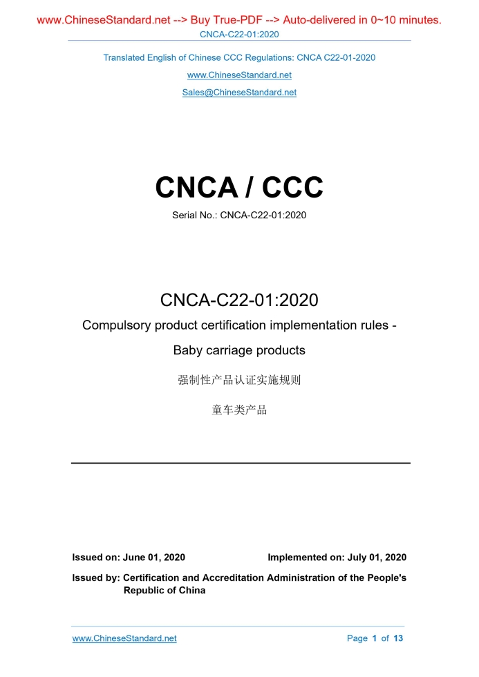 CNCA C22-01-2020: Compulsory product certification implementation rules - Baby carriage products Delivery: 9 seconds. True-PDF full-copy in English & invoice will be downloaded + auto-delivered via email. See step-by-step procedure Status: Valid CNCA C22-01: Historical versions