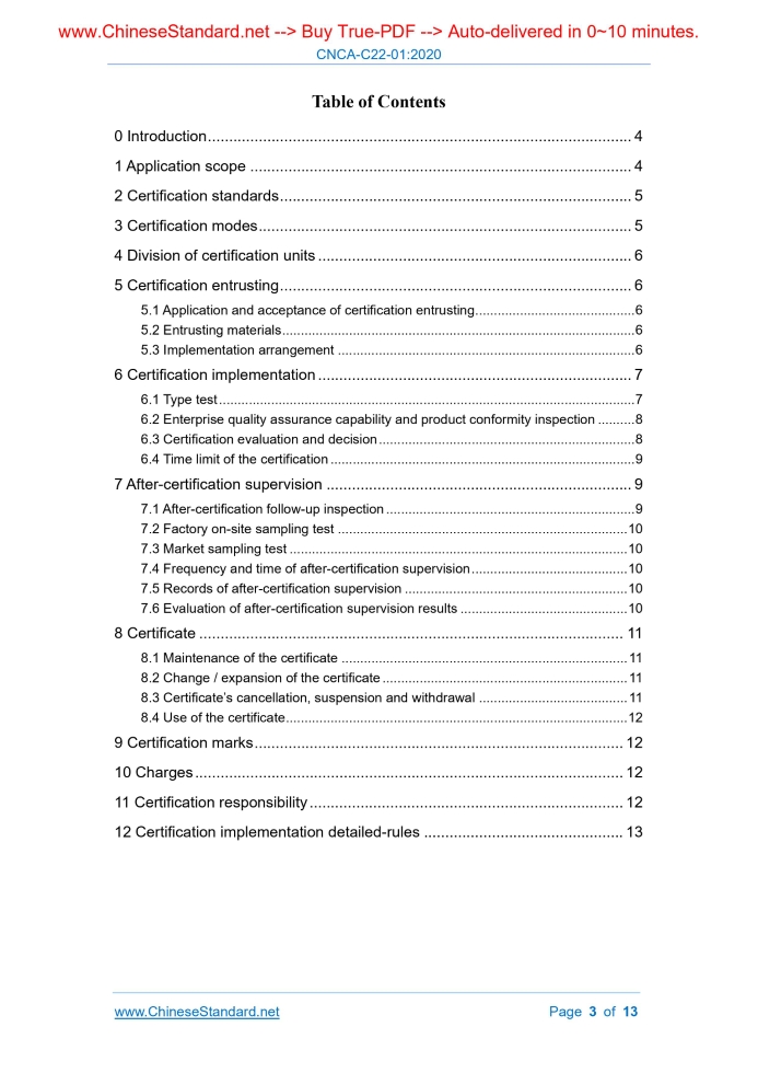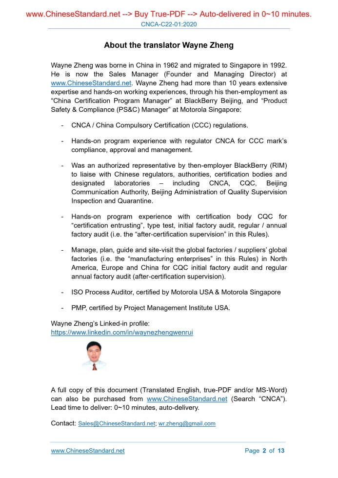 Similar standardsCNCA C22-01-2020: Compulsory product certification implementation rules - Baby carriage products---This is an excerpt. Full copy of true-PDF in English version (including equations, symbols, images, flow-chart, tables, and figures etc.), auto-downloaded/delivered in 9 seconds, can be purchased online: https://www.ChineseStandard.net/PDF.aspx/CNCAC22-01-2020Serial No.. CNCA-C22-01.2020 Compulsory product certification implementation rules - Baby carriage products Issued on: JUNE 01, 2020 Implemented on: JULY 01, 2020 Issued by. Certification and Accreditation Administration of the People's Republic of China He is now the Sales Manager (Founder and Managing Director) at expertise and hands-on working experiences, through his then-employment as “China Certification Program Manager” at BlackBerry Beijing, and “Product Safety & Compliance (PS&C) Manager” at Motorola Singapore. - CNCA / China Compulsory Certification (CCC) regulations. - Hands-on program experience with regulator CNCA for CCC mark’s compliance, approval and management. - Was an authorized representative by then-employer BlackBerry (RIM) to liaise with Chinese regulators, authorities, certification bodies and designated laboratories – including CNCA, CQC, Beijing Communication Authority, Beijing Administration of Quality Supervision Inspection and Quarantine. - Hands-on program experience with certification body CQC for “certification entrusting”, type test, initial factory audit, regular / annual factory audit (i.e. the “after-certification supervision” in this Rules). - Manage, plan, guide and site-visit the global factories / suppliers’ global factories (i.e. the “manufacturing enterprises” in this Rules) in North America, Europe and China for CQC initial factory audit and regular annual factory audit (after-certification supervision). - ISO Process Auditor, certified by Motorola USA & Motorola Singapore - PMP, certified by Project Management Institute USA. Lead time to deliver. 0~10 minutes, auto-delivery. Table of Contents0 Introduction... 4 1 Application scope... 4 2 Certification standards... 5 3 Certification modes... 5 4 Division of certification units... 6 5 Certification entrusting... 6 5.1 Application and acceptance of certification entrusting... 6 5.2 Entrusting materials... 6 5.3 Implementation arrangement... 6 6 Certification implementation... 7 6.1 Type test... 7 6.2 Enterprise quality assurance capability and product conformity inspection... 8 6.3 Certification evaluation and decision... 8 6.4 Time limit of the certification... 9 7 After-certification supervision... 9 7.1 After-certification follow-up inspection... 9 7.2 Factory on-site sampling test... 10 7.3 Market sampling test... 10 7.4 Frequency and time of after-certification supervision... 10 7.5 Records of after-certification supervision... 10 7.6 Evaluation of after-certification supervision results... 10 8 Certificate... 11 8.1 Maintenance of the certificate... 11 8.2 Change / expansion of the certificate... 11 8.3 Certificate’s cancellation, suspension and withdrawal... 11 8.4 Use of the certificate... 12 9 Certification marks... 12 10 Charges... 12 11 Certification responsibility... 12 12 Certification implementation detailed-rules... 130 IntroductionThis Rules is established based on the safety risk and certification risk of baby carriage products. It stipulates the basic principles and requirements for the implementation of compulsory product certification for baby carriage products. When baby carriage products are used in a predetermined or predictable manner, they must not endanger the safety or health of users or third parties. When baby carriage products are used only by children of a certain age, the ability of the user and, where appropriate, his or her guardian shall be considered. In order to meet the above basic safety requirements, the certification client shall ensure that, baby carriage products entering the Chinese market can meet the certification standards; obtain compulsory product certification certificates; and be applied the CCC mark. [TRNASLATOR NOTE is not part of this Rules. Translator note. “certification client”, the counterpart of certification body, refers to the Applicant / Manufacturer or its proxy (Power of Attorney). For ease of reading, hereinafter abbreviated as “CLIENT”]. This Rules is used in conjunction with the general implementation rules issued by Certification and Accreditation Administration (CNCA), such as “China Compulsory Certification Implementation Rules - Manufacturing Enterprise Classification Management, Certification Mode Selection and Determination”, “China Compulsory Certification Implementation Rules - Utilization of Manufacturing Enterprise Testing Resource and Other Certification Results”, “China Compulsory Certification Implementation Rules - Factory Inspection General Requirements”. According to the general implementation rules and the requirements of this Rules, the certification body shall prepare the certification implementation detailed-rules; and, implement it together with the general implementation rules and this Rules.1 Application scopeThis Rules applies to baby carriage products, including child bicycles, child tricycles, wheeled child conveyances, and baby walking frames. Due to the changes in the law, regulations or related product standards, technology, industry policies and other causes which may change the applicable scope, the announcement released by CNCA shall be final and conclusive.4 Division of certification unitsIn principle, according to the difference in the main material, load-bearing structure, etc. of the baby carriage products, the certification unit shall be divided. In the certification implementation detailed-rules, the certification body shall specify the specific requirements for the division of certification units. The same product produced by the same manufacturer and different manufacturing en