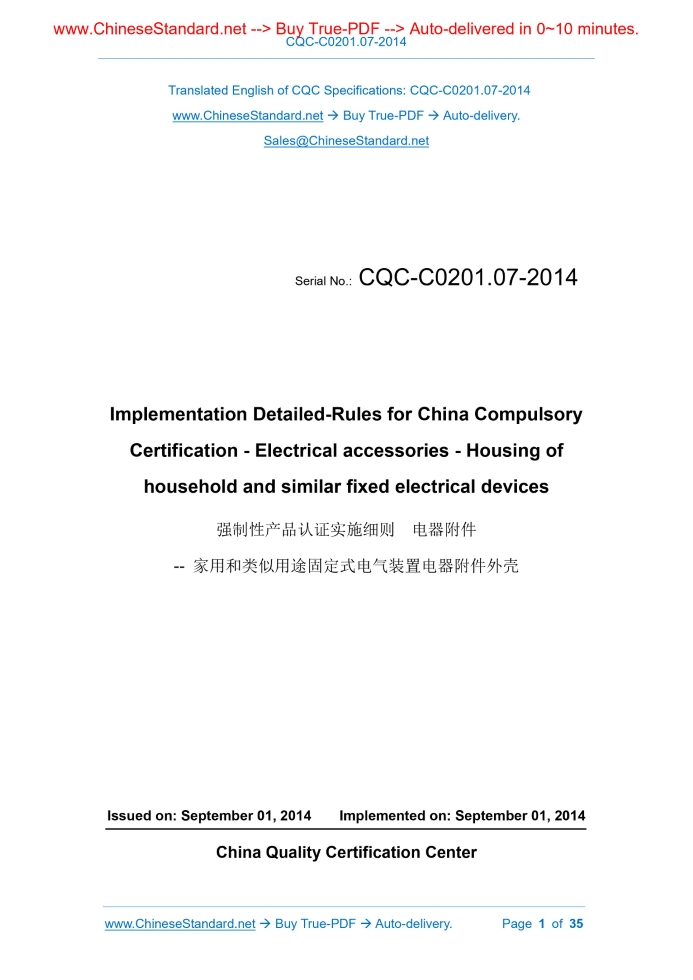 CQC-C0201.07-2014: [2019-Edition, 2020-Enforced] China Compulsory Certification Implementation Rules--Electrical Accessories--Housing of household and similar fixed electrical devices Delivery: 9 seconds. True-PDF full-copy in English & invoice will be downloaded + auto-delivered via email. See step-by-step procedure