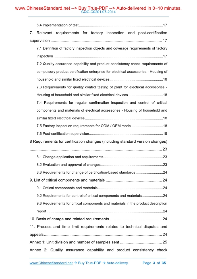 Similar standardsCQC-C0201.07-2014: [2019-Edition, 2020-Enforced] China Compulsory Certification Implementation Rules--Electrical Accessories--Housing of household and similar fixed electrical devices---This is an excerpt. Full copy of true-PDF in English version (including equations, symbols, images, flow-chart, tables, and figures etc.), auto-downloaded/delivered in 9 seconds, can be purchased online: https://www.ChineseStandard.net/PDF.aspx/CQC-C0201.07-2014 Serial No.. CQC-C0201.07-2014 Implementation Detailed-Rules for China Compulsory Certification - Electrical accessories - Housing of household and similar fixed electrical devices Issued on: SEPTEMBER 01, 2014 Implemented on: SEPTEMBER 01, 2014 China Quality Certification Center Table of ContentsForeword... 5 0.General requirements... 6 0.1 Foreword... 6 0.2 Definition of terms... 6 1.Classification management requirements of manufacturers... 7 2.Selection of certification mode and related requirements... 9 2.1 Basic selection mode... 9 2.2 Refinement of certification mode... 9 2.3 Applicability of certification mode... 9 3.Division of certification unit... 10 3.1 Basic principles of division of certification units... 10 3.2 Principles of product coverage in the same certification unit... 11 3.3 Principles for the division of certification units of products by different certification clients, different producers, different manufacturers... 11 4.Certification process and time limit requirements... 11 4.1 Submission and acceptance of certification application... 11 4.2 Certification scheme... 12 4.3 Review of application data... 12 4.4 Type test... 13 4.5 Enterprise’s quality assurance capability and product consistency check (initial factory inspection)... 13 4.6 Evaluation and approval of certification results... 14 4.7 Other issues... 14 5.Certification application data and related requirements... 15 6.Sample testing requirements (number of samples sent, testing items, test scheme)... 15 6.1 Requirements for sample delivery (sampling)... 15 6.2 Requirements for test item... 16 6.3 Requirements for test sample... 16 6.4 Implementation of test... 17 7.Relevant requirements for factory inspection and post-certification supervision... 17 7.1 Definition of factory inspection objects and coverage requirements of factory inspection... 17 7.2 Quality assurance capability and product consistency check requirements of compulsory product certification enterprise for electrical accessories - Housing of household and similar fixed electrical devices... 18 7.3 Requirements for quality control testing of plant for electrical accessories - Housing of household and similar fixed electrical devices... 18 7.4 Requirements for regular confirmation inspection and control of critical components and materials of electrical accessories - Housing of household and similar fixed electrical devices... 18 7.5 Factory inspection requirements for ODM / OEM mode... 18 7.6 Post-certification supervision... 19 8 Requirements for certification changes (including standard version changes) ... 23 8.1 Change application and requirements... 23 8.2 Evaluation and approval of changes... 23 8.3 Requirements for change of certification-based standards... 24 9.List of critical components and materials... 24 9.1 Critical components and materials... 24 9.2 Requirements for control of critical components and materials... 24 9.3 Requirements for critical components and materials in the product description report... 24 10.Basis of charge and related requirements... 24 11.Process and time limit requirements related to technical disputes and appeals... 24 Annex 1.Unit division and number of samples sent... 25 Annex 2.Quality assurance capability and product consistency check requirements for enterprise of electrical accessories - Housing of household and similar fixed electrical devices... 26 Annex 3.Quality control test requirements for factory of electrical accessories - Housing of household and similar fixed electrical devices... 27 Annex 4.Control requirements for regular confirmation inspection for critical components and materials... 29 Annex 5.Critical components and materials of electrical accessories - Housing of household and similar fixed electrical devices and the declaration requirements... 30 Annex 6.Types of electrical accessories - Housing of household and similar fixed electrical devices for supervision sampling inspection... 31 Annex 7 Operational requirements for using manufacturer’s testing resources to implement testing (or witness testing)... 32 0.General requirements 0.1 Foreword The Implementation Detailed-Rules for China Compulsory Certification of Electrical accessories - Housing of household and similar fixed electrical devices (hereinafter referred to as the Detailed-Rules) are compiled in accordance with the requirements of the “Implementation Detailed-Rules for China Compulsory Certification - Electrical Accessories" (CNCA-C02-01.2014) (hereinafter referred to as the Implementation Rules), as a supporting document for the implementation Detailed-Rules. According to the Implementation Rules and the relevant requirements of the China Quality Certification Center (hereinafter referred to as CQC)’s quality manuals, program files, operating instructions, etc., based on the principles of maintaining the effectiveness of product certification, improving product quality, serving certification companies, controlling certification risks, the Detailed-Rules are formulated and published. The Detailed-Rules are a detailed refinement of the Implementation Rules and shall be used in conjunction with the Implementation Rules. The product scope to which the Detailed-Rules are applicable and the certification basis are consistent with the relevant provisions in the Implementation Rules; meanwhile adjustments are implemented in accordance with the announcement of catalog definition and catalog adjustment as issued by the Certification and Accreditation Administ