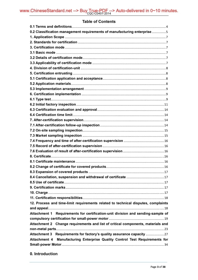 Similar standardsCQC-C0401-2014: China Compulsory Certification Implementation Detailed-Rules - Small power motors---This is an excerpt. Full copy of true-PDF in English version (including equations, symbols, images, flow-chart, tables, and figures etc.), auto-downloaded/delivered in 9 seconds, can be purchased online: https://www.ChineseStandard.net/PDF.aspx/CQC-C0401-2014 Serial No.. CQC-C0401.2014 Detailed Implementation Rules for China Compulsory Certification Small-power Motor Issued on: SEPTEMBER 1, 2014 Implemented on: SEPTEMBER 1, 2014 China Quality Certification Center ForewordThis Detailed Implementation Rules is formulated on the basis of Implementation Rules for China Compulsory Certification – Small-power Motor (CNCA-C04-01.2014). It is issued by China Quality Certification Center. Copyright is owned by China Quality Certification Center. No organization or individual shall use in whole or part of this Detailed Implementation Rules in any form without the permission from China Quality Certification Center. Formulating organization. China Quality Certification CenterTable of Contents0.1 Terms and definitions... 4 0.2 Classification management requirements of manufacturing enterprise... 5 1.Application Scope... 7 2.Standards for certification... 7 3.Certification mode... 7 3.1 Basic mode... 7 3.2 Details of certification mode... 7 3.3 Applicability of certification mode... 7 4.Division of certification-unit... 8 5.Certification entrusting... 8 5.1 Certification application and acceptance... 8 5.2 Application materials... 8 5.3 Implementation arrangement... 9 6.Certification implementation... 9 6.1 Type test... 9 6.2 Initial factory inspection... 11 6.3 Certification evaluation and approval... 14 6.4 Certification time limit... 14 7.After-certification supervision... 14 7.1 After-certification follow-up inspection... 14 7.2 On-site sampling inspection... 15 7.3 Market sampling inspection... 15 7.4 Frequency and time of after-certification supervision... 16 7.5 Record of after-certification supervision... 16 7.6 Evaluation of result of after-certification supervision... 16 8.Certificate... 16 8.1 Certificate maintenance... 16 8.2 Change of certificate for covered products... 16 8.3 Expansion of covered products... 17 8.4 Cancellation, suspension and withdrawal of certificate... 17 8.5 Use of certificate... 17 9.Certification marks... 17 10.Charge... 17 11.Certification responsibilities... 18 12.Process and time-limit requirements related to technical disputes, complaints and appeal... 18 Attachment 1 Requirements for certification-unit division and sending-sample of compulsory certification for small-power motor... 19 Attachment 2 Change requirements and list of critical components, materials and non-metal parts... 23 Attachment 3 Requirements for factory’s quality assurance capacity... 27 Attachment 4 Manufacturing Enterprise Quality Control Test Requirements for Small-power Motor... 34 0.Introduction Detailed Implementation Rules for China Compulsory Certification - Small- power Motor (hereafter referred to as Detailed-Rules) is formulated according to the provisions of Implementation Rules for China Compulsory Certification - Small-power Motor (CNCA-C04-01.2014) (hereafter referred to as Implementation Rules). Detailed-Rules is used together with Implementation Rules as a supportive document. The product scope, certification basis and all other contents of this Detailed- Rules shall comply with relevant provisions of Implementation Rules. It shall also be adjusted according to the Notices such as defined directory and directory adjustment that are issued by Certification and Accreditation Administration of China (hereafter referred as to CNCA). In accordance with the provisions of Implementation Rules, following the principles of maintaining the effectiveness of product certification, improving quality of product, serving certification companies, and controlling risk of certification, CQC formulates and issues this Detailed-Rules. Through establishing the classification management requirements of manufacturing enterprises, and combining the classification of manufacturing enterprises, this Detailed-Rules determines the implementation requirements for China Compulsory Certification of small-power motor. 0.1 Terms and definitions 0.1.1 Testing at Manufacturer’s Premises (abbreviated as TMP mode) It means that the engineers of designated laboratory use the testing equipment in the factory laboratory to conduct testing. The factory shall dispatch test personnel to provide assistance. The designated laboratory will examine, approve and issue the test report. 0.1.2 Witnessed Manufacturer’s Testing (abbreviated as WMT mode) It means that the engineer of designated laboratory witnesses the factory laboratory’s test conditions and all tests completed by using the laboratory’s equipment or according to the test plan submitted; or witnesses part of the test conditions and the test items. Test personnel of the factory laboratory shall provide the original records and draft up the test report together with the engineer of designated laboratory according to relevant provisions. The designated laboratory shall audit, approve and issue the test report. 0.1.3 ODM (Original Design Manufacturer) manufacturing enterprise The factory that utilizes the same-quality assurance capability requirements, same-product design, same-production process control, and same inspection requirements etc., to design, process, manufacture the same-product for a manufacturer or multiple manufacturers. 0.1.4 Holder of ODM initial certificate The organization that holds the initial product certificate of ODM product. 0.1.5 OEM (Original Equipment Manufacturer) manufacturing enterprise The manufacturing factory that manufactures the certification product in accordance with the entrusting party’s design, process control and inspection requirements. The entrusting party can be the c... ......Source: Above 