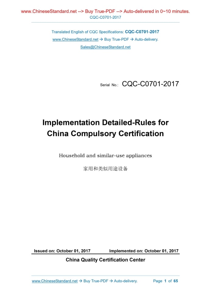 CQC-C0701-2017: China Compulsory Certification Implementation Detailed-Rules - Household and similar equipment Delivery: 9 seconds. True-PDF full-copy in English & invoice will be downloaded + auto-delivered via email. See step-by-step procedure CQC-C0701: Historical versions