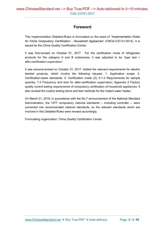 Similar standardsCQC-C0701-2017: China Compulsory Certification Implementation Detailed-Rules - Household and similar equipment---This is an excerpt. Full copy of true-PDF in English version (including equations, symbols, images, flow-chart, tables, and figures etc.), auto-downloaded/delivered in 9 seconds, can be purchased online: https://www.ChineseStandard.net/PDF.aspx/CQC-C0701-2017 Serial No.. CQC-C0701-2017 Implementation Detailed-Rules for China Compulsory Certification Household and similar-use appliances Issued on. OCTOBER 01, 2017 Implemented on. OCTOBER 01, 2017 China Quality Certification Center ForewordThis Implementation Detailed-Rules is formulated on the basis of “Implementation Rules for China Compulsory Certification - Household Appliances” (CNCA-C07-01.2014). It is issued by the China Quality Certification Center. It was first-revised on October 01, 2017.For the certification mode of refrigerator products for the category A and B enterprises, it was adjusted to be “type test + after-certification supervision”. It was second-revised on October 31, 2017.Added the relevant requirements for electric blanket products, which involve the following clauses. 1.Application scope; 2. Certification-basis standards; 3.Certification mode (2); 6.1.2 Requirements for sample quantity; 7.4 Frequency and time for after-certification supervision; Appendix 2 Factory quality control testing requirements of compulsory certification of household appliances. It also revised the routine testing items and test methods for the instant water heater. On March 01, 2018, in accordance with the No.7 announcement of the National Standard Administration, the 1077 compulsory national standards -- including controller -- were converted into recommended national standards, so the relevant standards which are involved in this Detailed-Rules were revised accordingly. Formulating organization. China Quality Certification Center.Table of Contents0.General requirements... 5 1.Application scope... 7 2.Certification-basis standards... 7 3.Certification modes... 9 4.Division of certification units... 10 5.Certification entrusting... 10 6.Certification implementation... 11 7.After-certification supervision... 15 8.Certificate... 18 9.Certification mark... 20 10 Charges... 21 11 Certification responsibility... 21 12 Technical disputes and complaints... 21 Appendix 1 Factory quality assurance capability requirements for compulsory certification of household and similar-use appliance... 22 Appendix 2 Factory quality control testing requirements for compulsory certification of household and similar-use appliances... 29 Appendix 3 Technical decision on relevant requirements for critical components and materials for compulsory product for household and similar-use appliances... 38 1.Application scope This Detailed-Rules is applicable to household appliances, including the following product types. household refrigerators and food freezers; electric fans; air conditioners; electric motors - compressors; household electric washing machines; electric water heaters; indoor heaters; vacuum cleaners; skin and hair care appliances; electric iron; Induction cooker; electric oven (portable grill, bread roaster and similar cooking utensils); electric food processing appliance (food processing machine (kitchen machinery)); microwave oven; electric range, cooktop, oven and similar appliances (standing electric oven, fixed grill and similar cooking utensils); range hood; liquid heater and Hot-cold water dispenser; rice cooker; electric blanket, electric heating mat and similar flexible heating appliance. Due to the adjustment of the scope of application caused by changes in laws, regulations, relevant product standards, technologies, industrial policies, etc., the announcement issued by the CNCA shall prevail. 2.Certification-basis standards No. Product type Standard basis for certification Safety standard Electromagnetic compatibility standard 3.Certification modes The optional certification modes for household and similar application appliance are. Mode 1.Type test + after-certification supervision. Mode 2.Type test + initial factory inspection + after-certification supervision. After-certification supervision refers to one or a combination of three methods. after-certification follow-up inspection, production on-site sampling testing or inspection, market sampling testing or inspection. (1) For the manufacturers of air conditioners, electric motors-compressors and refrigerators. Category A and category B manufacturing enterprises. it may use the mode 1 to perform certification; Category C and category D manufacturing enterprises. it may use the mode 2 to perform certification. (2) For electric fans, household electric washing machines, electric water heaters - storage water heaters, electric water heaters - instant water heaters, indoor heaters, vacuum cleaners, skin and hair care appliances, electric irons, Induction cookers, electric ovens (portable grill, bread toaster and similar cooking utensils), electric food processing appliance (food processing machine (kitchen machinery)), microwave oven, electric range cooker, cooktop, oven and similar appliances (standing electric oven, stationary grill and similar cooking appliances), range hoods, liquid heaters, hot-cold water dispensers, rice cookers, electric blankets, electric heating pads and similar flexible heating products manufacturers, in principle. 4.Division of certification units In principle, the application unit is divided in accordance with product category, type, specification, working principle, safety structure, etc. The same product produced by the same manufacturer and different manufacturing enterprises [Translator Note. OEM case], or the same product produced by different manufacturers and the same manufacturing enterprise [Translator Note. ODM case], is a different application unit. However, it can be type-tested on the samples of one unit. 5.Certificati