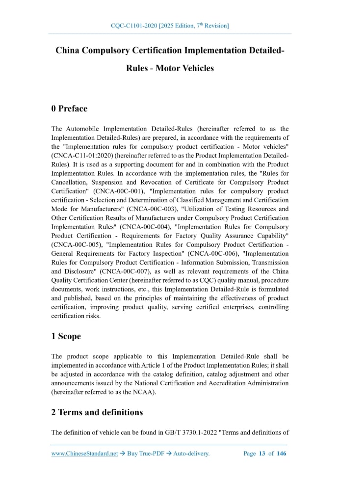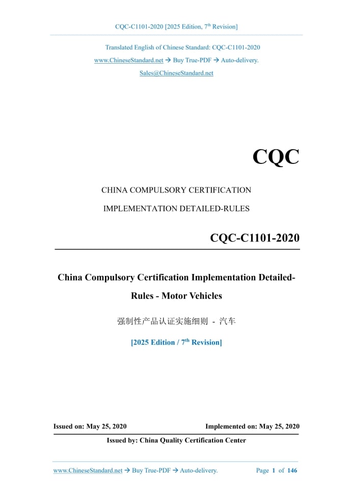 CQC-C1101-2020: [2025 Edition] China Compulsory Certification Implementation Detailed-Rules - Motor vehicle Delivery: 9 seconds. True-PDF full-copy in English & invoice will be downloaded + auto-delivered via email. See step-by-step procedure CQC-C1101: Historical versions