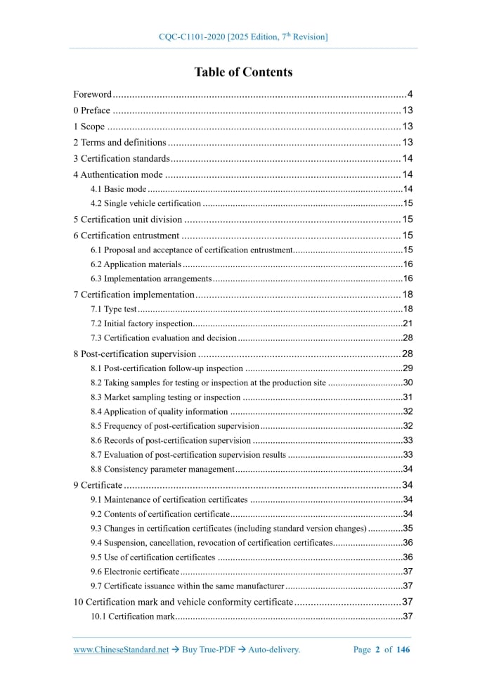 Similar standardsCQC-C1101-2020: [2025 Edition] China Compulsory Certification Implementation Detailed-Rules - Motor vehicle---This is an excerpt. Full copy of true-PDF in English version (including equations, symbols, images, flow-chart, tables, and figures etc.), auto-downloaded/delivered in 9 seconds, can be purchased online: https://www.ChineseStandard.net/PDF.aspx/CQC-C1101-2020 CQC CHINA COMPULSORY CERTIFICATION IMPLEMENTATION DETAILED-RULES CQC-C1101-2020 China Compulsory Certification Implementation Detailed- Rules - Motor Vehicles [2025 Edition / 7th Revision] Issued on. MAY 25, 2020 Implemented on. MAY 25, 2020 Issued by. China Quality Certification Center Table of ContentsForeword... 4 0 Preface... 13 1 Scope... 13 2 Terms and definitions... 13 3 Certification standards... 14 4 Authentication mode... 14 5 Certification unit division... 15 6 Certification entrustment... 15 7 Certification implementation... 18 8 Post-certification supervision... 28 9 Certificate... 34 10 Certification mark and vehicle conformity certificate... 37 11 Charges... 38 12 Processes and time limit requirements related to technical disputes, complaints, appeals... 38 Appendix 1 Certification items and requirements... 39 Appendix 2 Principles for classification of manufacturing enterprises... 82 Appendix 3 Information required for compulsory certification of automotive products ... 84 Appendix 5 Technical judgment conditions for modified automobile products... 113 Appendix 6 Production consistency review requirements for on-mass produced vehicle ... 115 Appendix 7 Sampling test basis item list... 122 Appendix 8 Vehicle conformity certificate format... 1261 ScopeThe product scope applicable to this Implementation Detailed-Rule shall be implemented in accordance with Article 1 of the Product Implementation Rules; it shall be adjusted in accordance with the catalog definition, catalog adjustment and other announcements issued by the National Certification and Accreditation Administration (hereinafter referred to as the NCAA).2 Terms and definitionsThe definition of vehicle can be found in GB/T 3730.1-2022 "Terms and definitions of motor vehicles, trailers and combination vehicle - Part 1.Types", GB/T 17350-2009 "Terms marks and designation for special purpose vehicles and special trailers", GB 7258-2017 "Technical specifications for safety of power-driven vehicles operating on roads". The classification of vehicles can be found in GB/T 15089-2001 "Classification of power-driven vehicles and trailers". Other terms shall be implemented in accordance with Article 2 of the Product Implementation Rules.3 Certification standardsThe standards, year number, Clause number based on which the certification is carried out are shown in Annex 1 of this Implementation Detailed-Rules. Manufacturing enterprises shall fully implement the national standards and regulations on automobile and trailer product safety, environmental protection, energy conservation, and anti-theft; meanwhile meet the requirements. In principle, the standards based for certification testing shall implement the latest version issued by the national standardization administrative department. When adding or subtracting standards or using other versions of standards, the announcements issued by the CNCA shall be followed; when the standards based for certification testing are updated, it shall follow the technical decisions of the Automobile and Components Technical Expert Group (TC11) of the CNCA.4 Authentication modeThe certification model for automotive products is implemented in accordance with Article 4 of the Product Implementation Rules. CQC has formulated the "Production Enterprise Classification Principles" (see Appendix 2) based on the product implementation rules and the "Compulsory Product Certification Implementation Rules -- Selection and Determination of Classified Management and Certification Mode for Manufacturers" (CNCA-00C-003) and other relevant requirements. In the specific implementation of tests, initial factory inspections, post-certification follow-up inspections, differentiated certification models are adopted based on differences in production methods, corporate management levels, product characteristics. 4.1 Basic mode Type test + initial factory inspection (enterprise quality assurance capability and product consistency inspection) + post-certification supervision Mass-produced vehicles. Type test + initial factory inspection (enterprise quality assurance capability and product consistency inspection) + post-certification supervision, in which quality assurance capability and product consistency inspection are conducted according to the production consistency inspection method. Non-mass production vehicles. Type test + initial factory inspection (enterprise quality assurance capability and product consistency inspection) + post-certification supervision. Parallel imported vehicles are generally non-mass production vehicles. On the basis of quality assurance capabilities and product consistency inspection, non-mass production vehicle enterprises will add on-site sampling testing or inspection at the production site or port.5 Certification unit divisionThe division of vehicle model series, units, models shall be carried out in accordance with Article 5 of the Product Implementation Rules. The certification client can submit a certification commission based on the model series or unit. Products applied for using the single-vehicle certification model will not be divided into units. Certificates will be issued based on the model and specific vehicle identification number, with one certificate per vehicle.6 Certification entrustment6.1 Proposal and acceptance of certification entrustment The certification client needs to submit the certification entrustment to CQC in an appropriate manner. CQC will review the certification entrustment and provide feedback on acceptance or rejection, in accordance with the time limit requirements 