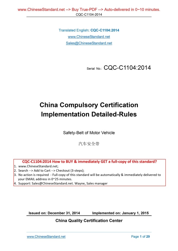 CQC-C1104-2014: China Compulsory Certification Implementation Detailed-Rules - Motor vehicle safety-belts Delivery: 9 seconds. True-PDF full-copy in English & invoice will be downloaded + auto-delivered via email. See step-by-step procedure