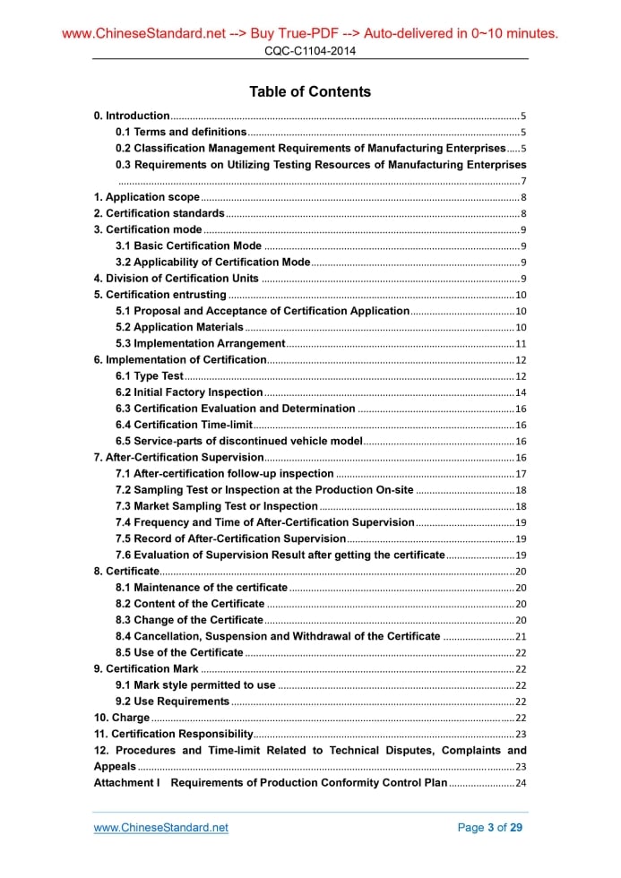 Similar standardsCQC-C1104-2014: China Compulsory Certification Implementation Detailed-Rules - Motor vehicle safety-belts---This is an excerpt. Full copy of true-PDF in English version (including equations, symbols, images, flow-chart, tables, and figures etc.), auto-downloaded/delivered in 9 seconds, can be purchased online: https://www.ChineseStandard.net/PDF.aspx/CQC-C1104-2014 Serial No.. CQC-C1104.2014 China Compulsory Certification Implementation Detailed-Rules Safety-Belt of Motor Vehicle Issued on: DECEMBER 31, 2014 Implemented on: JANUARY 1, 2015 China Quality Certification Center ForewordThis Implementation Detailed-Rules is formulated on the basis of “Implementing Rules for China Compulsory Certification - Safety-Belt of Motor Vehicle” (CNCA-C11-04.2014). It is issued by the China Quality Certification Center. The copyright belongs to the China Quality Certification Center. Any organization or individual shall not use it in whole or in part in any form without permission of the China Quality Certification Center. Formulating organization. China Quality Certification CenterTable of Contents0.Introduction... 5 0.1 Terms and definitions... 5 0.2 Classification Management Requirements of Manufacturing Enterprises... 5 0.3 Requirements on Utilizing Testing Resources of Manufacturing Enterprises ... 7 1.Application scope... 8 2.Certification standards... 8 3.Certification mode... 9 3.1 Basic Certification Mode... 9 3.2 Applicability of Certification Mode... 9 4.Division of Certification Units... 9 5.Certification entrusting... 10 5.1 Proposal and Acceptance of Certification Application... 10 5.2 Application Materials... 10 5.3 Implementation Arrangement... 11 6.Implementation of Certification... 12 6.1 Type Test... 12 6.2 Initial Factory Inspection... 14 6.3 Certification Evaluation and Determination... 16 6.4 Certification Time-limit... 16 6.5 Service-parts of discontinued vehicle model... 16 7.After-Certification Supervision... 16 7.1 After-certification follow-up inspection... 17 7.2 Sampling Test or Inspection at the Production On-site... 18 7.3 Market Sampling Test or Inspection... 18 7.4 Frequency and Time of After-Certification Supervision... 19 7.5 Record of After-Certification Supervision... 19 7.6 Evaluation of Supervision Result after getting the certificate... 19 8.Certificate... 20 8.1 Maintenance of the certificate... 20 8.2 Content of the Certificate... 20 8.3 Change of the Certificate... 20 8.4 Cancellation, Suspension and Withdrawal of the Certificate... 21 8.5 Use of the Certificate... 22 9.Certification Mark... 22 9.1 Mark style permitted to use... 22 9.2 Use Requirements... 22 10.Charge... 22 11.Certification Responsibility... 23 12.Procedures and Time-limit Related to Technical Disputes, Complaints and Appeals... 23 Attachment I Requirements of Production Conformity Control Plan... 24 Attachment II Certification implementation of service parts for after-sales maintenance for discontinued vehicle model... 27 0.Introduction “China Compulsory Certification Implementing Detailed-Rules - Safety-Belt of Motor Vehicle” (hereinafter referred to as Detailed-Rules) is compiled based on the requirements of “Implementation Rules for China Compulsory Certification - Safety-Belt of Motor Vehicle” (CNCA-C11-04.2014) (hereinafter referred to as Implementation-Rules). This Detailed-Rules is used together with the Implementation-Rules as supportive document. The product scope, certification basis and all other contents of this Detailed-Rules shall comply with relevant provisions of Implementation Rules. It shall also be adjusted according to the Notices such as defined directory and directory adjustment that are issued by Certification and Accreditation Administration of China (hereafter referred to as CNCA). In accordance with the provisions of Implementation Rules, following the principles of maintaining the effectiveness of product certification, improving quality of product, serving certification companies, and controlling risk of certification, CQC formulates and issues this Detailed-Rules. Through establishing the classification management requirements of manufacturing enterprises, and combining the classification of manufacturing enterprises, this Detailed-Rules determines the implementation requirements for China Compulsory Certification of Door locks and door retention components for motor vehicles” (hereinafter referred to as Door-locks). 0.1 Terms and definitions 0.0.1 Testing at Manufacturer’s Premises (abbreviated as TMP mode) It means that the engineers of designated laboratory use the testing equipment in the factory laboratory to conduct testing. The factory shall dispatch test personnel to provide assistance. The designated laboratory will examine, approve and issue the test report. 0.1.2 Witnessed Manufacturer’s Testing (abbreviated as WMT mode) It means that the engineer of designated laboratory witnesses the factory laboratory’s test conditions and all tests completed by using the laboratory’s equipment or according to the test plan submitted; or witnesses part of the test conditions and the test items. Test personnel of the factory laboratory shall provide the original records and draft up the test report together with the engineer of designated laboratory according to relevant provisions. The designated laboratory shall audit, approve and issue the test report. 0.2 Classification Management Requirements of Manufacturing Enterprises CQC collects and sorts-out all the information related to certification products and quality related to manufacturing enterprises; and uses dynamic classification management for manufacturing enterprises. certification entrusting client [hereafter abbreviated as CLIENT], manufacturer and manufacturing enterprise shall make cooperation with it. CQC classifies the manufacturing enterprises into 4 categories - A, B, C and D. Quality information that is based to classify the manufacturing enterprises shall at le