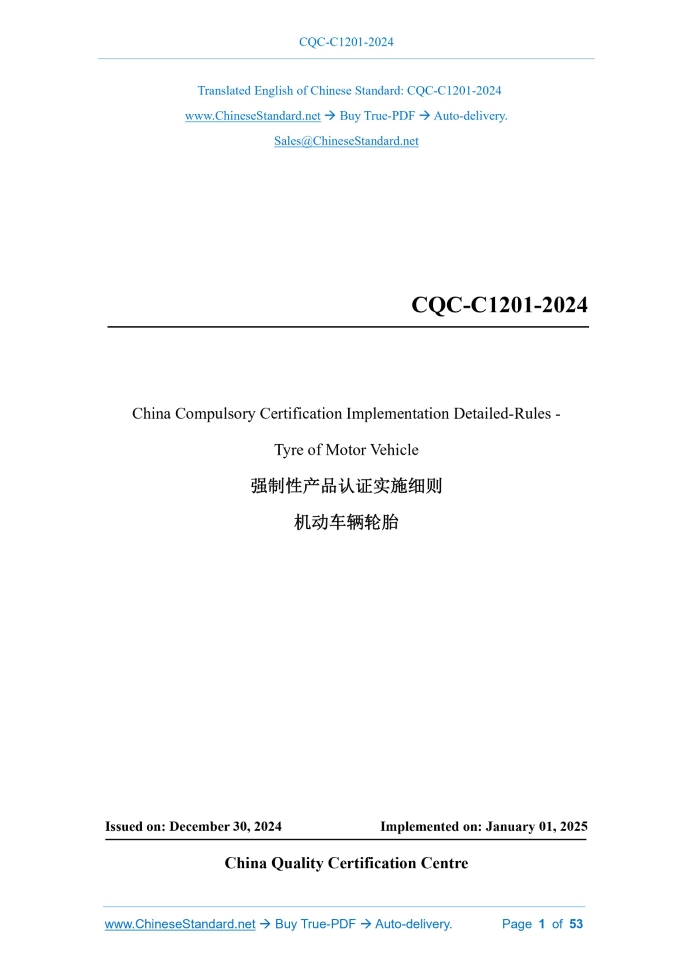CQC-C1201-2024: Mandatory product certification Implementation detail rules -- Motor vehicle tires Delivery: 9 seconds. True-PDF full-copy in English & invoice will be downloaded + auto-delivered via email. See step-by-step procedure CQC-C1201: Historical versions
