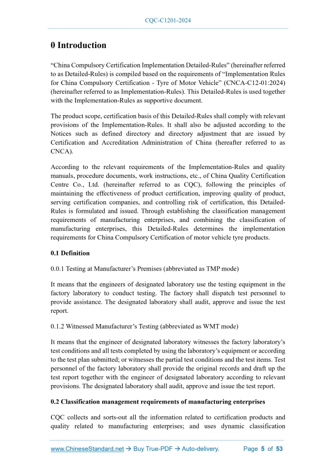CQC-C1201-2024: Mandatory product certification Implementation detail rules -- Motor vehicle tires---This is an excerpt. Full copy of true-PDF in English version (including equations, symbols, images, flow-chart, tables, and figures etc.), auto-downloaded/delivered in 9 seconds, can be purchased online: https://www.ChineseStandard.net/PDF.aspx/CQC-C1201-2024 China Compulsory Certification Implementation Detailed-Rules - Tyre of Motor Vehicle Issued on. DECEMBER 30, 2024 Implemented on. JANUARY 01, 2025 China Quality Certification Centre ForewordThis document is formulated on the basis of “Implementation Rules for China Compulsory Certification - Tyre of Motor Vehicle” (CNCA-C12-01.2024). It is issued by the China Quality Certification Centre Co., Ltd. (hereinafter referred to as China Quality Certification Centre).Table of ContentsForeword... 2 0 Introduction... 5 0.1 Definition... 5 0.2 Classification management requirements of manufacturing enterprises... 5 0.3 Requirements for utilizing test resources of manufacturing enterprises... 8 1 Application scope... 8 2 Terms and definitions... 8 3 Certification standards... 9 4 Certification mode... 9 5 Division of certification units... 10 6 Certification entrusting... 10 7 Implementation of certification... 11 8 After-certification supervision... 18 9 Certification certificate... 24 10 Certification mark... 28 11 Charge basis and requirements... 29 12 Procedures and time-limit related to technical disputes, complaints and appeals. 29 13 Certification applied by ODM mode... 29 Attachment 1 Materials to be submitted during certification entrusting... 30 Attachment 2 Table of technical parameters... 31 Attachment 3 Tread list... 37 Attachment 4 Technical review of documents... 38 Attachment 5 Requirements for conformity of production control document... 40 Attachment 6 Tyres’ worst conditions (TWC, The Worse Case)... 46 Attachment 7 Type test items and test methods for motor vehicle tyre products... 48 Attachment 8 Requirements for the content of conformity of production control document implementation report... 501 Application scopeThis Detailed-Rules apply to new pneumatic tyres for motor vehicles, including passenger car tyres, truck tyres and motorcycle tyres. The original design was for motor vehicle tyres used in motor vehicles of M, N, O, and L categories (refer to GB/T 15089 for definition of vehicle categories). This Detailed-Rules does not apply to retreaded tyres and tyres specifically designed for racing. Scope adjustment due to change of relevant laws or regulations, relevant product standards, technologies and industry policies and other factors shall be subject to the notice issued by CNCA and CQC.2 Terms and definitionsFor the purpose of This Detailed-Rules, terms and definitions in the relevant regulations for China compulsory certification, as well as the following terms and definitions, apply. 2.1 ODM (Original Design Manufacturer) A factory that designs, processes and produces the same products for one or more certification entrusting clients or producers (manufacturers) using the same quality assurance capability requirements, the same product design, production process control and inspection requirements.3 Certification standards“Passenger car tyres” (GB 9743-2024), “Truck tyres” (GB 9744-2024), “Motorcycle tyres” (GB 518-2020).4 Certification mode4.1 Basic certification mode Enterprise quality assurance capability and product consistency inspection (initial inspection) + type test + after-certification supervision; 4.2 Applicability of certification mode CQC implements classification management on manufacturing enterprises in accordance with the requirements of “China Compulsory Certification Implementation Rules - Manufacturing Enterprise Classification Management, Certification Mode Selection and Determination” and, based on the results of the classification management, adds relevant elements such as production on-site sampling test or inspection, market sampling test or inspection, etc.5 Division of certification unitsIn principle, the product produced by the same producer (manufacturer), by the same manufacturing enterprise (site), of the same category [Note 1], of the same structure6 Certification entrusting6.1 Proposal and acceptance of certification application The certification entrusting client shall fill in the required enterprise information and product details, and submit to CQC for certification entrusting via the Internet requirements and issue a notice of acceptance or rejection within 2 working days, or require the certification entrusting client to make corrections and resubmit the certification entrusting again. 6.2 Implementation arrangement CQC shall formulate the certification plan after acceptance, and notice the certification entrusting client. Certification plan usually includes. 6.3 Rejection circumstances The certification entrusting will be rejected under any of the following circumstances.7 Implementation of certification7.1 Initial inspection 7.1.1 Basic requirements for initial inspection The initial inspection is an evaluation by the certification body on whether the factory's conformity of production control meets the certification requirements. It is carried out through technical review of documents and factory on-site inspection for conformity of production. 7.1.2 Technical review of documents CQC shall conduct a technical review of the certification entrusting documents, test reports, conformity of production control plans and confirmatory materials submitted by the certification entrusting client in accordance with the requirements of Attachment 4 of this document, and formulate a certification plan based on the review conclusions. 7.1.3 Factory on-site inspection for conformity of production Factory on-site inspection for conformity of production is carried out by the producers and/or manufacturing enterprises after the conformity of production control document h