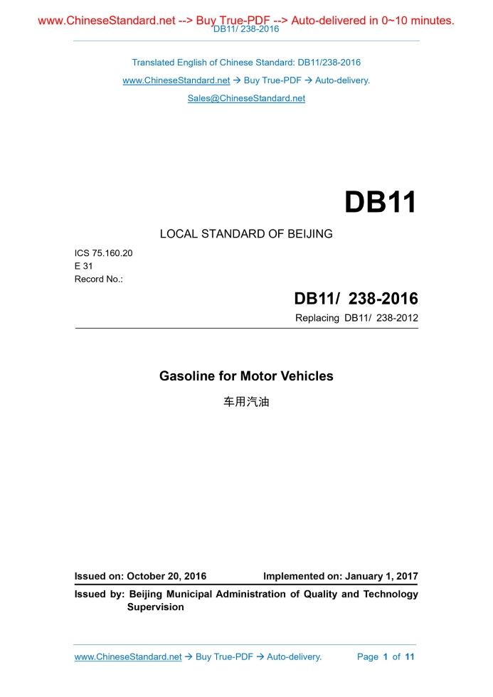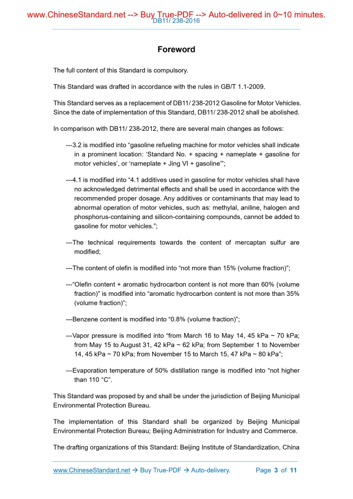 DB11238-2016: Gasoline for Motor Vehicles---This is an excerpt. Full copy of true-PDF in English version (including equations, symbols, images, flow-chart, tables, and figures etc.), auto-downloaded/delivered in 9 seconds, can be purchased online: https://www.ChineseStandard.net/PDF.aspx/DB11238-2016LOCAL STANDARD OF BEIJING ICS 75.160.20 E 31 Record No.. Replacing DB11/ 238-2012 Gasoline for Motor Vehicles Issued on: OCTOBER 20, 2016 Implemented on: JANUARY 1, 2017 Issued by. Beijing Municipal Administration of Quality and Technology Supervision Table of ContentsForeword... 3 Introduction... 5 1 Scope... 6 2 Normative References... 6 3 Product Classification and Labeling... 8 4 Technical Requirements and Test Methods... 8 5 Sampling... 11 6 Packaging, Marking, Transportation and Storage... 11 7 Safety... 11ForewordThe full content of this Standard is compulsory. This Standard was drafted in accordance with the rules in GB/T 1.1-2009. This Standard serves as a replacement of DB11/ 238-2012 Gasoline for Motor Vehicles. Since the date of implementation of this Standard, DB11/ 238-2012 shall be abolished. In comparison with DB11/ 238-2012, there are several main changes as follows. ---3.2 is modified into “gasoline refueling machine for motor vehicles shall indicate in a prominent location. ‘Standard No. + spacing + nameplate + gasoline for motor vehicles’, or ‘nameplate + Jing VI + gasoline’”; ---4.1 is modified into “4.1 additives used in gasoline for motor vehicles shall have no acknowledged detrimental effects and shall be used in accordance with the recommended proper dosage. Any additives or contaminants that may lead to abnormal operation of motor vehicles, such as. methylal, aniline, halogen and phosphorus-containing and silicon-containing compounds, cannot be added to gasoline for motor vehicles.”; ---The technical requirements towards the content of mercaptan sulfur are modified; ---The content of olefin is modified into “not more than 15% (volume fraction)”; ---“Olefin content + aromatic hydrocarbon content is not more than 60% (volume fraction)” is modified into “aromatic hydrocarbon content is not more than 35% (volume fraction)”; ---Benzene content is modified into “0.8% (volume fraction)”; ---Vapor pressure is modified into “from March 16 to May 14, 45 kPa ~ 70 kPa; from May 15 to August 31, 42 kPa ~ 62 kPa; from September 1 to November 14, 45 kPa ~ 70 kPa; from November 15 to March 15, 47 kPa ~ 80 kPa”; ---Evaporation temperature of 50% distillation range is modified into “not higher than 110 °C”. This Standard was proposed by and shall be under the jurisdiction of Beijing Municipal Environmental Protection Bureau. The implementation of this Standard shall be organized by Beijing Municipal Environmental Protection Bureau; Beijing Administration for Industry and Commerce. The drafting organizations of this Standard. Beijing Institute of Standardization, China Gasoline for Motor Vehicles1 ScopeThis Standard stipulates the product classification, labeling, technical requirements, test methods, sampling, packaging, marking, transportation, storage and safety of gasoline for motor vehicles. This Standard is applicable to gasoline for motor vehicles, which is constituted of liquid hydrocarbon, or, liquid hydrocarbon and additives that improve the performance.2 Normative ReferencesThe following documents are indispensable to the application of this document. In terms of references with a specific date, only versions with the specific date are applicable to this document. In terms of references without a specific date, the latest versions (including all the modification orders) are applicable to this document. GB/T 259 Petroleum Products - Determination of Water-soluble Acids and Alkalis GB/T 260 Petroleum Products - Determination of Water GB/T 503 Determination of the Gasoline Octane Number - Test Method for Motor Octane Number GB/T 511 Petroleum, Petroleum Products and Additives - Method for Determination of Mechanical Admixtures GB/T 1884 Crude Petroleum and Liquid Petroleum Products - Laboratory Determination of Density - Hydrometer Method GB/T 1885 Petroleum Measurement Tables GB/T 4756 Method for Manual Sampling of Petroleum Liquids GB/T 5096 Test Method for Corrosiveness to Copper from Petroleum Products by Copper Strip Test GB/T 5487 Determination of the Gasoline Octane Number - Test Method for Research Octane Number GB/T 6536 Standard Test Method for Distillation of Petroleum Products at Atmospheric Pressure GB/T 8017 Standard Test Method for Vapor Pressure of Petroleum Products - Reid SH/T 0713 Standard Test Method for Determination of Benzene and Toluene in Finished Motor and Aviation Gasoline by Gas Chromatography SH/T 0720 Standard Test Method for Determination of Oxygenates in Gasoline by Gas Chromatography and Oxygen Selective Flame Ionization Detection NB/SH/T 0741 Standard Test Method for Determination of Hydrocarbon Types Composition in Gasoline by Multidimensional Gas Chromatography SH/T 0794 Standard Test Method for Vapor Pressure of Petroleum Products (mini method) NB/SH/T 0842 Standard Test Method for Sulfur in Light Liquid Fuels by Monochromatic Wavelength Dispersive X-ray Fluorescence Spectrometry3 Product Classification and Labeling3.1 Product Classification In accordance with research octane number, gasoline for motor vehicles shall be divided into three nameplates, namely. 89#, 92# and 95#. 3.2 Labeling Gasoline refueling machine for motor vehicles shall indicate in a prominent location. “Standard No. + spacing + nameplate + gasoline for motor vehicles”, or “nameplate + Jing VI + gasoline”. Example. “DB11/ 238 92# gasoline for motor vehicles” or “92# Jing VI gasoline”.4 Technical Requirements and Test Methods4.1 Additives used in gasoline for motor vehicles shall have no acknowledged detrimental effects and shall be used in accordance with the recommended proper dosage. Any additives or contaminants 