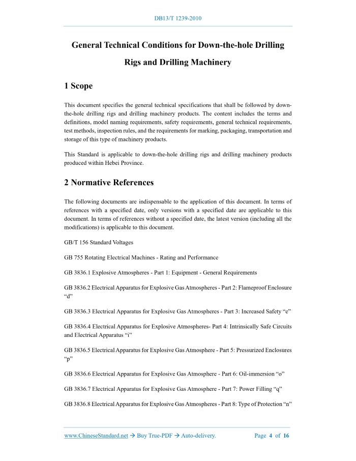 Similar standardsDB13T1239-2010: Drilling rig and drilling machinery general technical conditions---This is an excerpt. Full copy of true-PDF in English version (including equations, symbols, images, flow-chart, tables, and figures etc.), auto-downloaded/delivered in 9 seconds, can be purchased online: https://www.ChineseStandard.net/PDF.aspx/DB13T1239-2010DB13 LOCAL STANDARD OF HEBEI PROVINCE ICS 21 J 10 General Technical Conditions for Down-the-hole Drilling Rigs and Drilling Machinery Issued on: JULY 20, 2010 Implemented on: AUGUST 10, 2010 Issued by. Hebei Provincial Bureau of Quality and Technical Supervision Table of ContentsForeword... 3 1 Scope... 4 2 Normative References... 4 3 Terms and Definitions... 6 4 Requirements for Model Naming... 6 5 Safety Requirements... 7 6 General Technical Requirements... 10 7 Test Methods... 13 8 Inspection Rules... 15 9 Marking, Packaging, Transportation and Storage... 16 General Technical Conditions for Down-the-hole Drilling Rigs and Drilling Machinery1 ScopeThis document specifies the general technical specifications that shall be followed by down- the-hole drilling rigs and drilling machinery products. The content includes the terms and definitions, model naming requirements, safety requirements, general technical requirements, test methods, inspection rules, and the requirements for marking, packaging, transportation and storage of this type of machinery products. This Standard is applicable to down-the-hole drilling rigs and drilling machinery products produced within Hebei Province.2 Normative ReferencesThe following documents are indispensable to the application of this document. In terms of references with a specified date, only versions with a specified date are applicable to this document. In terms of references without a specified date, the latest version (including all the modifications) is applicable to this document. GB/T 156 Standard Voltages GB 755 Rotating Electrical Machines - Rating and Performance GB 3836.1 Explosive Atmospheres - Part 1.Equipment - General Requirements GB 3836.2 Electrical Apparatus for Explosive Gas Atmospheres - Part 2.Flameproof Enclosure “d” GB 3836.3 Electrical Apparatus for Explosive Gas Atmospheres - Part 3.Increased Safety “e” GB 3836.4 Electrical Apparatus for Explosive Atmospheres- Part 4.Intrinsically Safe Circuits and Electrical Apparatus “i” GB 3836.5 Electrical Apparatus for Explosive Gas Atmosphere - Part 5.Pressurized Enclosures “p” GB 3836.6 Electrical Apparatus for Explosive Gas Atmosphere - Part 6.Oil-immersion “o” GB 3836.7 Electrical Apparatus for Explosive Gas Atmosphere - Part 7.Power Filling “q” GB 3836.8 Electrical Apparatus for Explosive Gas Atmospheres - Part 8.Type of Protection “n” GB 3836.9 Electrical Apparatus for Explosive Gas Atmospheres - Part 9.Encapsulation “m” GB 4351.1 Portable Fire Extinguishers - Part 1.Performance and Construction GB 5226.1 Electrical Safety of Machinery - Electrical Equipment of Machines - Part 1.General Requirements GB/T 6921 Determination of the Concentration of Airborne Particulate Matters GB/T 7679.1 Mining Machinery Terminology - Part 1.Mining Equipment GB/T 8196 Safety of Machinery - Guards - General Requirements for the Design and Construction of Fixed and Movable Guards GB/T 10095.1 Cylindrical Gears - System of Accuracy - Part 1.Definitions and Allowable Values of Deviations Relevant to Corresponding Flanks of Gear Teeth GB/T 10095.2 Cylindrical Gears - System of Accuracy - Part 2.Definitions and Allowable Values of Deviations Relevant to Radial Composite Deviations and Runout Information GB/T 13306 Plates GB/T 13325 Noise Emitted by Machinery and Equipment - Guidelines for the Preparation of Test Codes of Engineering Grade Requiring Noise Measurements at the Operator’s or Bystander’s Position GB/T 13344 Downhole Drill Hammers and Bits GB/T 13384 General Specifications for Packing of Mechanical and Electrical Product GB/T 15706.2 Safety of Machinery - Basic Concepts, General Principles for Design - Part 2. Technical Principles GB 16754 Safety of Machinery - Emergency Stop - Principles for Design GB/T 16855.1 Safety of Machinery - Safety-related Parts of Control Systems - Part 1.General Principles for Design JB/T 1604 Code of Designations for Mining Machinery Products JB/T 3249 Engineering Machinery Fender and Hood JB/T 7161 General Specification of Heat-treatment for Rock Drilling Machines and Pneumatic Tools JB/T 7164 Rock Drilling Machines and Pneumatic Tools - General Specifications for Machined Parts JB/T 7165 Rock Drilling Machines and Pneumatic Tools - General Specifications for Assembly danger. 5.2 Basic Safety Requirements for Situations without Driver’s Cab 5.2.1 The control mechanisms shall have plates indicating their actions. 5.2.2 The operator’s operating position setting shall comply with ergonomic principles. 5.2.3 The control platform shall be set up in a location that is convenient for observation. 5.2.4 Under working conditions, when the ambient noise in the operator’s control area is greater than 85 dB(A), a noise reduction device (earplugs or headset) shall be provided. 5.2.5 Under working conditions, when there are splashing objects in the control area or when the dust concentration is excessively high, the operator shall wear a helmet and dust mask. 5.3 General Safety Requirements 5.3.1 All slewing and moving parts, except for the drill rod, propulsion mechanism and traveling mechanism, shall be equipped with protective measures if they are dangerous to the operator. Any dangerous areas or components, such as. transmission, high temperature, circuits and fragile parts, that may be touched by the operator shall be isolated with protective devices (such as. protective covers and protective plates, etc.). The design of the product protective devices shall comply with the requirements of GB/T 8196. 5.3.2 The rated pressure of pipes, hoses and pipe joints shall be not less than the d