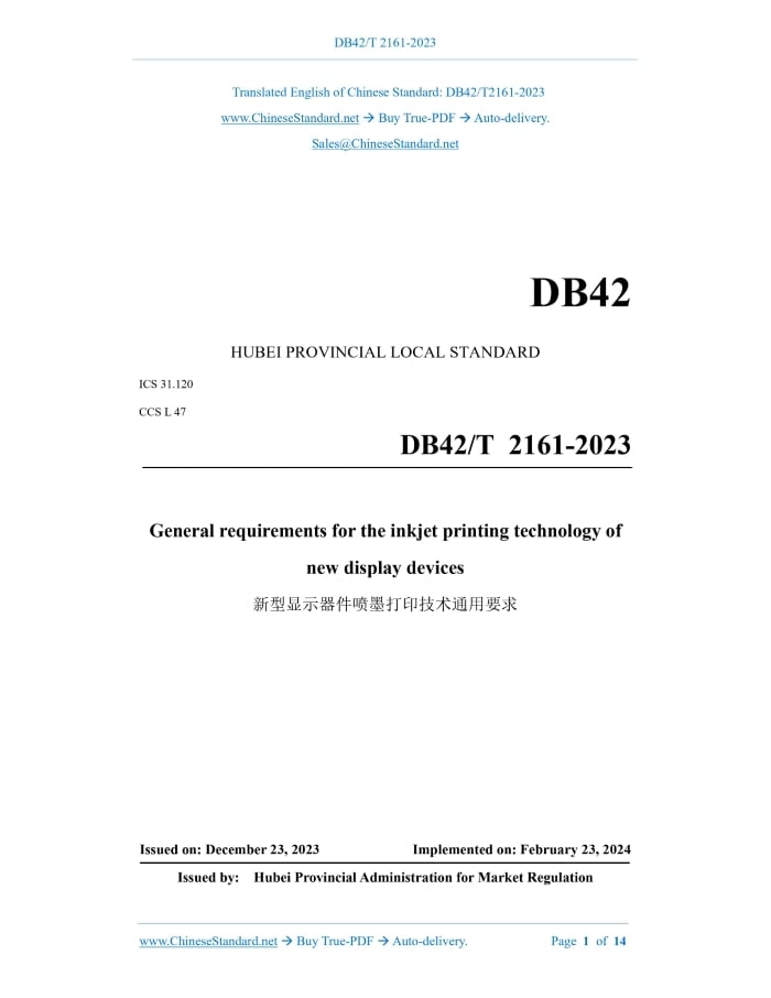 DB42T2161-2023: General requirements for the inkjet printing technology of new display devices Delivery: 9 seconds. True-PDF full-copy in English & invoice will be downloaded + auto-delivered via email. See step-by-step procedure
