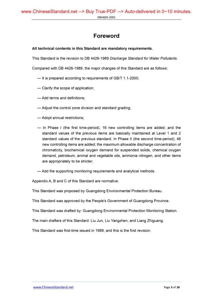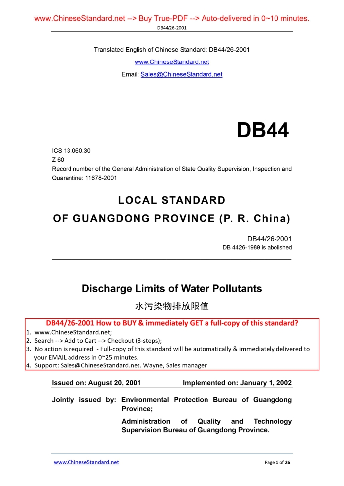 DB4426-2001: Discharge limits of water pollutants (GuangdDong Provincial Standard) Delivery: 9 seconds. True-PDF full-copy in English & invoice will be downloaded + auto-delivered via email. See step-by-step procedure