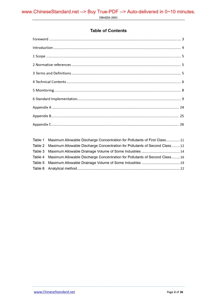 Similar standardsDB44/26-2001: Discharge limits of water pollutants (GuangdDong Provincial Standard)---This is an excerpt. Full copy of true-PDF in English version (including equations, symbols, images, flow-chart, tables, and figures etc.), auto-downloaded/delivered in 9 seconds, can be purchased online: https://www.ChineseStandard.net/PDF.aspx/DB4426-2001DB44 ICS 13.060.30 Z 60 Record number of the General Administration of State Quality Supervision, Inspection and Quarantine. 11678-2001 LOCAL STANDARD OF GUANGDONG PROVINCE (P. R. China) DB 4426-1989 is abolished Discharge Limits of Water Pollutants Issued on: AUGUST 20, 2001 Implemented on: JANUARY 1, 2002 Jointly issued by. Environmental Protection Bureau of Guangdong Province; Administration of Quality and Technology Supervision Bureau of Guangdong Province. Table of ContentsForeword... 3 Introduction... 4 1 Scope... 5 2 Normative references... 5 3 Terms and Definitions... 5 4 Technical Contents... 6 5 Monitoring... 8 6 Standard Implementation... 9 Appendix A... 24 Appendix B... 25 Appendix C... 26 Table 1 Maximum Allowable Discharge Concentration for Pollutants of First Class... 11 Table 2 Maximum Allowable Discharge Concentration for Pollutants of Second Class... 12 Table 3 Maximum Allowable Drainage Volume of Some Industries... 14 Table 4 Maximum Allowable Discharge Concentration for Pollutants of Second Class... 16 Table 5 Maximum Allowable Drainage Volume of Some Industries... 19 Table 6 Analytical method... 22ForewordAll technical contents in this Standard are mandatory requirements. This Standard is the revision to DB 4426-1989 Discharge Standard for Water Pollutants. Compared with DB 4426-1989, the major changes of this Standard are as follows. — It is prepared according to requirements of GB/T 1.1-2000; — Clarify the scope of application; — Add terms and definitions; — Adjust the control zone division and standard grading; — Adopt annual restrictions; — In Phase I (the first time-period), 16 new controlling items are added; and the standard values of the previous items are basically maintained at Level 1 and 2 standard values of the previous standard. In Phase II (the second time-period), 46 new controlling items are added; the maximum allowable discharge concentration of chromaticity, biochemical oxygen demand for suspended solids, chemical oxygen demand, petroleum, animal and vegetable oils, ammonia nitrogen, and other items are appropriately to be stricter; — Add the supporting monitoring requirements and analytical methods. Appendix A, B and C of this Standard are normative. This Standard was proposed by Guangdong Environmental Protection Bureau. This Standard was approved by the People's Government of Guangdong Province. This Standard was drafted by. Guangdong Environmental Protection Monitoring Station. The main drafters of this Standard. Liu Jun, Liu Yangzhen, and Liang Zhiguang. This Standard was first-time issued in 1989; and this is the first revision.IntroductionIn order to control the water pollution; protect the water quality; guarantee the human health; maintain the ecological balance; and promote the economic and social development, this Standard is drafted with consideration of the actual situation in Guangdong Province, according to the Environmental Protection Law of the People's Republic of China; Water Pollution Prevention and Control Law of the People's Republic of China; Marine Environment Protection Law of the People's Republic of China; and other relevant provisions. This Standard replaces DB 4426-1989 Discharge Standard for Water Pollutants. Since the implementation date of this Standard, DB 4426-1989 shall be abolished. Discharge Limits of Water Pollutants1 ScopeThis Standard stipulates the discharge limits of 74 water pollutants, in year-limit; and also stipulates a variety of requirements in the implementation standard. This Standard is applicable to Guangdong Province’s existing units’ [Translator. “unites” is defined in 3.3 / 3.4 of Chapter 3.However, it should be replaced with “existing organizations / enterprises”. Hereinafter it is marked as “UNIT/UNITS”] discharge management of water pollutants from; environmental impact assessment on the construction project, design, completion and acceptance of environmental protection facilities for the construction project; and discharge management after acceptance and production - except those industries such as shipping, shipping industry, offshore petroleum development industry, aerospace propellant use, weapon industry, sewage marine disposal engineering.2 Normative referencesThe articles contained in the following documents have become part of this Standard when they are quoted herein. For the dated documents so quoted, all the modifications (excluding corrections) or revisions made thereafter shall not be applicable to this Standard. For the undated documents so quoted, the latest editions shall be applicable to this Standard. GB 3097 Marine water quality standard GB 8703 Regulations for radiation protection GB 12997 Water quality - Technical regulation on the design of sampling programs GB 12999 Water quality sampling - Technical regulation of the preservation and handling of samples GHZB 1 Environmental quality standard for surface water Technical requirements for completion inspection and acceptance of construction project environment protection installations (on trial) 74 items and 83 detection and analysis methods are shown Table 63 Terms and DefinitionsFor the purpose of this Standard, the following terms and definitions apply. 3.1 5.2.2 For the routine monitoring on the industrial wastewater, the monitoring frequency shall be determined according to the production cycle. For production cycle is shorter than 8, the wastewater shall be sampled every 2 hours. For production cycle is longer 8, the wastewater shall be sampled every 4 hours. Other wastewater sampling. at least twice in 24 hours. The maximum allowable