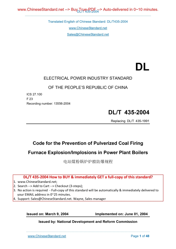 DL/T 435-2004: Code for the prevention of pulverized coal firing furnace explosions/implosions in power plant boilers Delivery: 9 seconds. True-PDF full-copy in English & invoice will be downloaded + auto-delivered via email. See step-by-step procedure Status: Obsolete DL/T 435: Historical versions