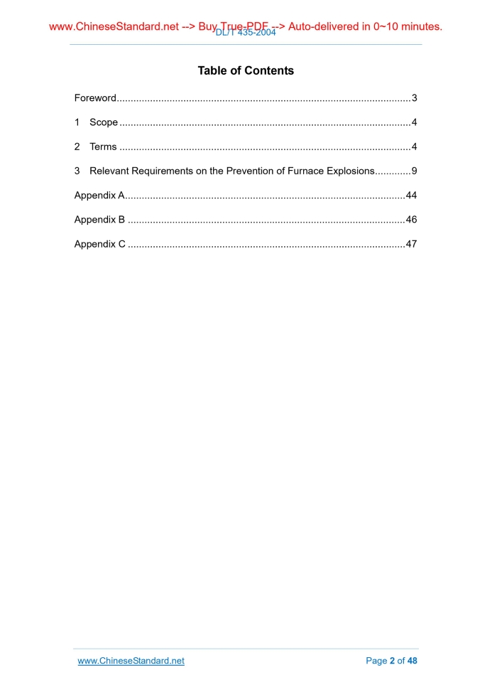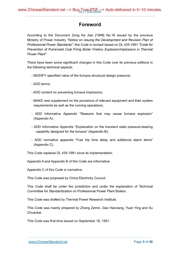Similar standardsDL/T 435-2004: Code for the prevention of pulverized coal firing furnace explosions/implosions in power plant boilers---This is an excerpt. Full copy of true-PDF in English version (including equations, symbols, images, flow-chart, tables, and figures etc.), auto-downloaded/delivered in 9 seconds, can be purchased online: https://www.ChineseStandard.net/PDF.aspx/DLT435-2004 DL ELECTRICAL POWER INDUSTRY STANDARD ICS 27.100 F 23 Recording number. 13556-2004 Replacing DL/T 435-1991 Code for the Prevention of Pulverized Coal Firing Furnace Explosion/Implosions in Power Plant Boilers Issued on: MARCH 9, 2004 Implemented on: JUNE 01, 2004 Issued by. National Development and Reform Commission Table of ContentsForeword... 3 1 Scope... 4 2 Terms... 4 3 Relevant Requirements on the Prevention of Furnace Explosions... 9 Appendix A... 44 Appendix B... 46 Appendix C... 47ForewordAccording to the Document Zong Ke Jiao [1998] No.18 issued by the previous Ministry of Power Industry "Notice on issuing the Development and Revision Plan of Professional Power Standards", this Code is revised based on DL 435-1991 "Code for Prevention of Pulverized Coal Firing Boiler Firebox Explosion/implosions in Thermal Power Plant". There have been some significant changes in this Code over its previous editions in the following technical aspects. - MODIFY specified value of the furnace structural design pressure; - ADD terms; - ADD content on preventing furnace implosions; - MAKE new supplement on the provisions of relevant equipment and their system requirements as well as the running operations; - ADD Informative Appendix “Reasons that may cause furnace explosion” (Appendix A); - ADD Informative Appendix “Explanation on the transient state pressure-bearing capability designed for the furnace” (Appendix B); - ADD normative appendix “Fuel trip time delay and additional alarm items” (Appendix C). This Code replaces DL 435-1991 since its implementation. Appendix A and Appendix B of this Code are informative. Appendix C of this Code is normative. This Code was proposed by China Electricity Council. This Code shall be under the jurisdiction and under the explanation of Technical Committee for Standardization on Professional Power Plant Boilers. This Code was drafted by Thermal Power Research Institute. This Code was mainly prepared by Zheng Zemin, Gao Hanxiang, Yuan Ying and Xu Chuankai. This Code was first-time issued on September 18, 1991. Code for the Prevention of Pulverized Coal Firing Furnace Explosion/Implosions in Power Plant Boilers1 ScopeThis Code specifies basic requirements on relevant equipment and system aspects for prevention of pulverized coal firing furnace explosions/implosions in power plant boilers, shows out guide for the on/off sequence and operation of equipment. This Code is applicable to pulverized coal firing furnace in power plant boiler.2 TermsFor the purposes of this Standard, the following terms apply. 2.1 main primary air shut off gate It is a kind of main air gate which can be closed tightly and prevent the primary air entering the burners; generally, it shall be mounted on the pulverized coal-free airflow, such as primary air fan outlet of positive pressure direct-blow pulverized-coal system or coal pulverizer inlet of negative pressure direct-blow pulverized-coal system and storage pulverized-coal system. 2.2 flame detector The equipment to detect the flame-free and provide signal. 2.3 directional blocking A sort of interlock system moves to the likely-to-be enlarged deviation direction and all the relevant final control elements must be prohibited when the furnace pressure is tested to deviate from the normal value significantly. 2.4 fan test block capability 2.11 ignitor It can provide adequate ignition energy for igniting the permanent devices (including sparker, igniting oil and popgun) of the main burner fuel for an instant. The capacity of the ignitor as close relationship with the fire behavior of the main fuel, burner type and requirement for the ignitor function, generally, it consists of Class-I and Class-II ignitors. Class-I ignitor. used to ignite the gas-pulverizer mixture entering the furnace from the main burner in any operating condition. This type of ignitor requires large capacity; generally, it shall be over 20% of the heat quantity of the main burner under full-load. Class-II ignitor. can only be used to ignite the gas-pulverizer mixture entering the furnace from the main burner according to the air volume and pulverized coal volume when igniting, its capacity is generally 10%~20% of the heat quantity of the main burner under full-load. The above two ignitors are both be used for combustion-supporting under low-load or when the burning is instable, however, it may not be used as means for saving extinguishment when the furnace has been fire-extinguishing but not yet been purged according to the requirements. 2.12 warm-up oil gun It is the oil gun for warming up boiler, lifting pressure, washing pipe and with low-load, while its thermal power hereof is larger than that of the ignitor (usually, its total thermal power is about 30% of the thermal power for the full-loaded boiler). 2.13 furnace safety supervisory system (“FSSS” for short) It is a kind of security protection and sequential control equipment that ensures that the equipment of the boiler combustion system is safety on/off according to the specified working order and conditions, and that can rapidly cut off all the fuel (including igniting fuel) entering the furnace in critical operating conditions, so as to prevent destructive emergencies like deflagration and explosions. Note. The primary functions of the international so-called “burner management system”, “fuel-firing safety system” or “burner control system” are identical to FSSS defined by this Code. 2.14 logic portion stable flame In the range of operation, and in the process of changing the load with the specifi