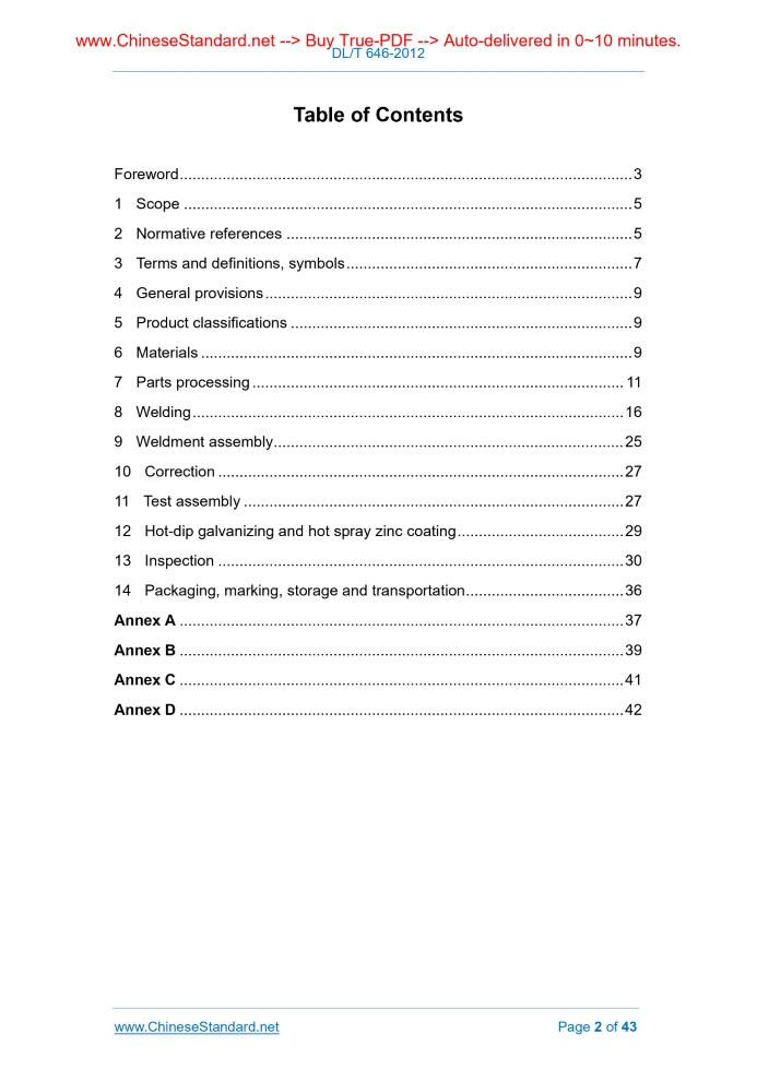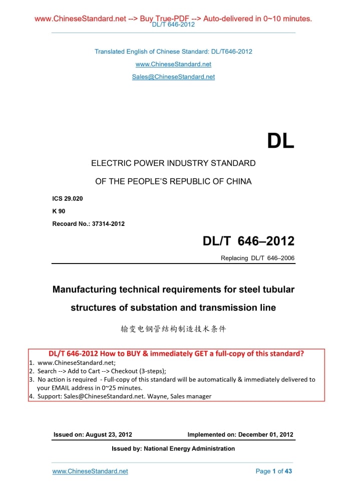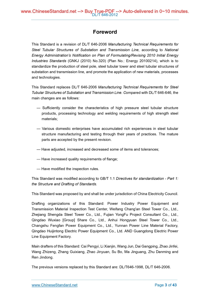 Similar standardsDL/T 646-2012: Manufacturing technical requirements for steel tubular structures of substation and transmission line---This is an excerpt. Full copy of true-PDF in English version (including equations, symbols, images, flow-chart, tables, and figures etc.), auto-downloaded/delivered in 9 seconds, can be purchased online: https://www.ChineseStandard.net/PDF.aspx/DLT646-2012 DL ELECTRIC POWER INDUSTRY STANDARD ICS 29.020 K 90 Recoard No.. 37314-2012 DL/T 646–2012 Replacing DL/T 646–2006 Manufacturing technical requirements for steel tubular structures of substation and transmission line Issued on: AUGUST 23, 2012 Implemented on: DECEMBER 01, 2012 Issued by. National Energy Administration Table of ContentsForeword... 3 1 Scope... 5 2 Normative references... 5 3 Terms and definitions, symbols... 7 4 General provisions... 9 5 Product classifications... 9 6 Materials... 9 7 Parts processing... 11 8 Welding... 16 9 Weldment assembly... 25 10 Correction... 27 11 Test assembly... 27 12 Hot-dip galvanizing and hot spray zinc coating... 29 13 Inspection... 30 14 Packaging, marking, storage and transportation... 36 Annex A... 37 Annex B... 39 Annex C... 41 Annex D... 42ForewordThis Standard is a revision of DL/T 646-2006 Manufacturing Technical Requirements for Steel Tubular Structures of Substation and Transmission Line, according to National Energy Administration’s Notification on Plan of Formulating/Revising 2010 Initial Energy Industries Standards (GNKJ (2010) No.320) (Plan No.. Energy 20100214), which is to standardize the production of steel pole, steel tubular tower and steel tubular structures of substation and transmission line, and promote the application of new materials, processes and technologies. This Standard replaces DL/T 646-2006 Manufacturing Technical Requirements for Steel Tubular Structures of Substation and Transmission Line. Compared with DL/T 646-646, the main changes are as follows. — Sufficiently consider the characteristics of high pressure steel tubular structure products, processing technology and welding requirements of high strength steel materials; — Various domestic enterprises have accumulated rich experiences in steel tubular structure manufacturing and testing through their years of practices. The mature parts are accepted by the present revision. — Have adjusted, increased and decreased some of items and tolerances; — Have increased quality requirements of flange; — Have modified the inspection rules. This Standard was modified according to GB/T 1.1 Directives for standardization - Part 1. the Structure and Drafting of Standards. This Standard was proposed by and shall be under jurisdiction of China Electricity Council. Drafting organizations of this Standard. Power Industry Power Equipment and Transmission Material Inspection Test Center, Weifang Chang'an Steel Tower Co., Ltd., Zhejiang Shengda Steel Tower Co., Ltd., Fujian YongFu Project Consultant Co., Ltd., Qingdao Wuxiao [Group] Share Co., Ltd., Anhui Hongyuan Steel Tower Co., Ltd., Changshu Fengfan Power Equipment Co., Ltd., Yunnan Power Line Material Factory, Qingdao Huijintong Electric Power Equipment Co., Ltd. AND Guangdong Electric Power Line Equipment Factory. Main drafters of this Standard. Cai Pengyi, Li Xianjin, Wang Jun, Dai Gangping, Zhao Jinfei, Wang Zhizeng, Zhang Guixiang, Zhao Jinyuan, Su Bo, Ma Jinguang, Zhu Danming and Ren Jindong. The previous versions replaced by this Standard are. DL/T646-1998, DL/T 646-2006. Manufacturing technical requirements for steel tubular structures of substation and transmission line1 ScopeThis Standard specifies the requirements for materials, process, inspection, packaging, marking, storage, transportation and so on during manufacturing steel pole, steel tubular tower and steel tubular structures of substation-and-transmission line. This Standard applies to steel tubular structures of substation-and-transmission line, whose components mainly adopt polygonal and circular steel tubes and antiseptic treatment by hot-dip-galvanized or hot-zinc-spray (zinc alloy) coatings. Other similar steel tubular structure may reference to this Standard.2 Normative referencesThe articles contained in the following documents have become part of this Standard when they are quoted herein. For the dated documents so quoted, all the modifications (including all corrections) or revisions made thereafter shall be applicable to this Standard. GB/T 41 Hexagon nuts, type 1 (GB/T 41-2000, ISO 4034.1999, IDT) GB/T 95 Plain washers - Product grade C (GB/T 95-2002, ISO 7091.2000, IDT) GB/T 470 Zinc ingots (GB/T 470-2008, ISO 752.2004, MOD) GB/T 699 Quality carbon structural steels GB/T 700 Carbon structural steels (GB/T 700-2006, ISO 630.1995, NEQ) GB/T 702 Hot-rolled steel bars - Dimensions, shape, weight and tolerances (GB/T 702- 2008, ISO 1035-1~4.1980, MOD) GB/T 706 Hot rolled section steel GB/T 709 Dimension shape weight and tolerances for hot-rolled steel plates and sheets (GB/T 709-2006, ISO 7452.2002, ISO 16160.2000, NEQ) GB/T 805 Tight nuts GB/T 985.1 Recommended joint preparation for gas welding manual metal arc welding gas-shield arc welding and beam welding (GB/T 985.1-2008, ISO 9692-1.2003, MOD) GB/T 985.2 Recommended joint preparation for submerged arc welding (GB/T 985.2- 2008, ISO 9692-2.1998, MOD) GB/T 1591 High strength low alloy structural steels GB/T 2694 Specification of manufacturing for transmission line tower GB/T 2828.1 Sampling procedures for inspection by attributes - Part 1.Sampling schemes indexed by acceptance quality limit (AQL) for lot-by-lot inspection (GB/T 2828.1-2003, ISO 2859-1.1999, IDT) GB/T 2829 Sampling procedures and tables for periodic inspection by attributes (Apply to inspection of process stability) GB/T 3091 Welded steel pipes for low pressure liquid delivery (GB/T 3091-2008, ISO 559.1991, NEQ) GB/T 3098.1 Mechanical properties of fasteners - Bolts, screws and studs (GB/T 3098.1-2010, ISO 898-1.2009, MOD) GB/T 309
