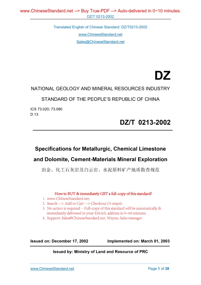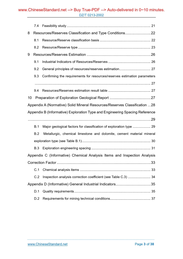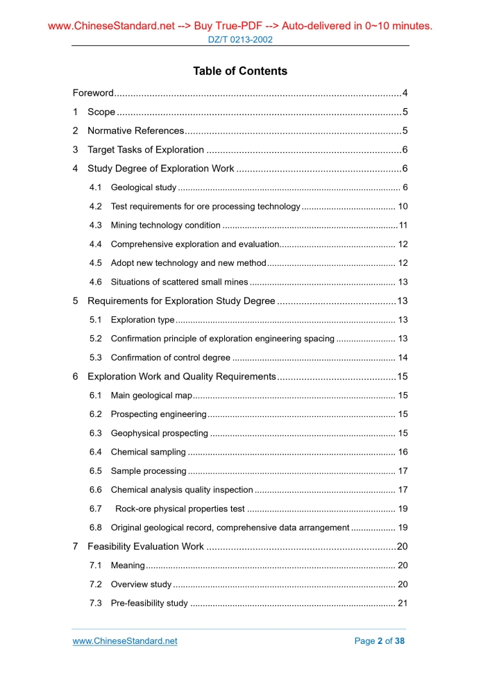 Similar standardsDZ/T 0213-2002: Specifications for metallurgic, chemical limestone and dolomite, cement-materials mineral exploration---This is an excerpt. Full copy of true-PDF in English version (including equations, symbols, images, flow-chart, tables, and figures etc.), auto-downloaded/delivered in 9 seconds, can be purchased online: https://www.ChineseStandard.net/PDF.aspx/DZT0213-2002 DZ NATIONAL GEOLOGY AND MINERAL RESOURCES INDUSTRY ICS 73.020; 73.080 D 13 Specifications for Metallurgic, Chemical Limestone and Dolomite, Cement-Materials Mineral Exploration Issued on: DECEMBER 17, 2002 Implemented on: MARCH 01, 2003 Issued by. Ministry of Land and Resource of PRC 3.No action is required - Full-copy of this standard will be automatically & immediately delivered to your EMAIL address in 0~60 minutes. Table of ContentsForeword... 4 1 Scope... 5 2 Normative References... 5 3 Target Tasks of Exploration... 6 4 Study Degree of Exploration Work... 6 4.1 Geological study... 6 4.2 Test requirements for ore processing technology... 10 4.3 Mining technology condition... 11 4.4 Comprehensive exploration and evaluation... 12 4.5 Adopt new technology and new method... 12 4.6 Situations of scattered small mines... 13 5 Requirements for Exploration Study Degree... 13 5.1 Exploration type... 13 5.2 Confirmation principle of exploration engineering spacing... 13 5.3 Confirmation of control degree... 14 6 Exploration Work and Quality Requirements... 15 6.1 Main geological map... 15 6.2 Prospecting engineering... 15 6.3 Geophysical prospecting... 15 6.4 Chemical sampling... 16 6.5 Sample processing... 17 6.6 Chemical analysis quality inspection... 17 6.7 Rock-ore physical properties test... 19 6.8 Original geological record, comprehensive data arrangement... 19 7 Feasibility Evaluation Work... 20 7.1 Meaning... 20 7.2 Overview study... 20 7.3 Pre-feasibility study... 21 7.4 Feasibility study... 21 8 Resources/Reserves Classification and Type Conditions... 22 8.1 Resource/Reserve classification basis... 22 8.2 Resource/Reserve type... 23 9 Resources/Reserves Estimation... 26 9.1 Industrial Indicators of Resources/Reserves... 26 9.2 General principles of resources/reserves estimation... 27 9.3 Confirming the requirements for resources/reserves estimation parameters ... 27 9.4 Resources/Reserves estimation result table... 27 10 Preparation of Exploration Geological Report... 27 Appendix A (Normative) Solid Mineral Resources/Reserves Classification... 28 Appendix B (Informative) Exploration Type and Engineering Spacing Reference ... 29 B.1 Major geological factors for classification of exploration type... 29 B.2 Metallurgic, chemical limestone and dolomite, cement material mineral exploration type (see Table B.1)... 30 B.3 Exploration engineering spacing... 31 Appendix C (Informative) Chemical Analysis Items and Inspection Analysis Correction Factor... 33 C.1 Chemical analysis items... 33 C.2 Inspection analysis correction coefficient (see Table C.3)... 34 Appendix D (Informative) General Industrial Indicators... 35 D.1 Quality requirements... 35 D.2 Requirements for mining technical conditions... 37 Specifications for Metallurgic, Chemical Limestone and Dolomite, Cement-Materials Mineral Exploration1 ScopeThis Standard specifies the degree of exploration study, exploration quality, classification and type condition of resources/reserves, estimation of resources/reserves, etc. for metallurgical, chemical limestone and dolomite, cement- material mineral (calcareous material, clay material, and siliceous material)1); and provides the deposit exploration type for analogy, and exploration engineering spacing for reference. This Standard is applicable to the metallurgic, chemical limestone and dolomite, cement-materials mineral exploration, resource/reserves estimation; applicable to the acceptance and review for the exploration design and exploration result report of metallurgic, chemical limestone and dolomite, cement-material mineral; can also serve as the basis for assessing and estimating the mineral resources/reserves during the financing and the like activities of mining rights transferring, and mineral exploration and mining.2 Normative ReferencesThe provisions in following documents become the provisions of this Standard through reference in this Standard. For dated references, the subsequent amendments (excluding corrigendum) or revisions do not apply to this Standard, however, parties who reach an agreement based on this Standard are encouraged to study if the latest versions of these documents are applicable. For undated references, the latest edition of the referenced document applies. GB/T 13908-2002 General Requirements for Solid Mineral Exploration GB/T 17766-1999 Classification for Resources/Reserves of Solid Fuels and Mineral Commodities GB/T 12719-91 Exploration Specification of hydrogeology and Engineering Geology in Mining Areas 1) Cement-material mineral generally includes. calcareous material – limestone, argillaceous limestone, marble; clay material – clay, loess, mudstone, silt rock, shale, phyllite; siliceous material – sand, sandstone.3 Target Tasks of ExplorationThe exploration work can be divided into four phases, namely, pre-survey, general survey, detailed survey, and prospecting. The target tasks in each phase are as follows. 3.1 Pre-survey phase. through comprehensive study of geological data in the area, preliminary field observation, very small amount of engineering verification, analogy and prediction of the known deposit with the similar geological characteristics, propose the area with larger mineral resources potentials for the general survey. 3.2 General survey phase. through adopting outcrop inspection, geological mapping, limited number of sampling work, and the like field work against the area with larger mineral source potentials confirmed in the pre-survey phase, generally find out the geology and tectonics in the general survey area; generally understand th