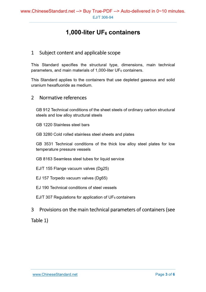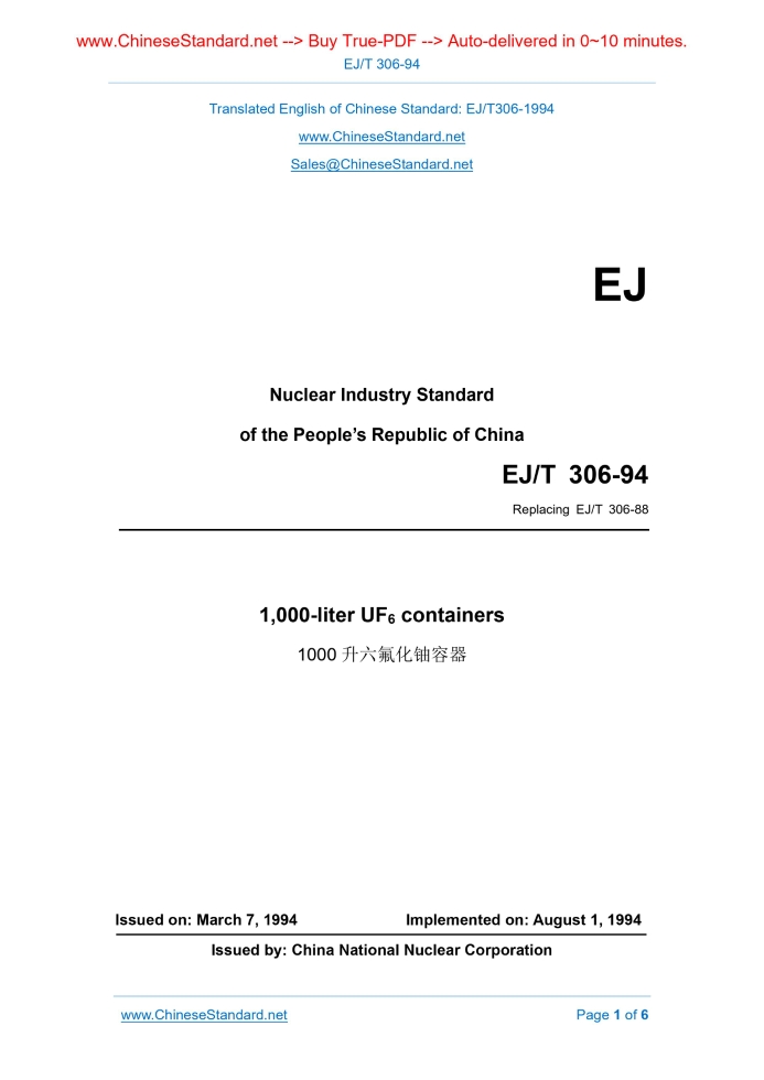 EJ/T 306-1994: 1000-liter UF6 containers Delivery: 9 seconds. True-PDF full-copy in English & invoice will be downloaded + auto-delivered via email. See step-by-step procedure