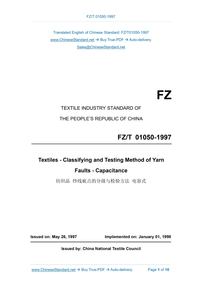 FZ/T 01050-1997: Textiles. Classifying and testing method of yarn faults. Capacitance Delivery: 9 seconds. True-PDF full-copy in English & invoice will be downloaded + auto-delivered via email. See step-by-step procedure FZ/T 01050: Historical versions