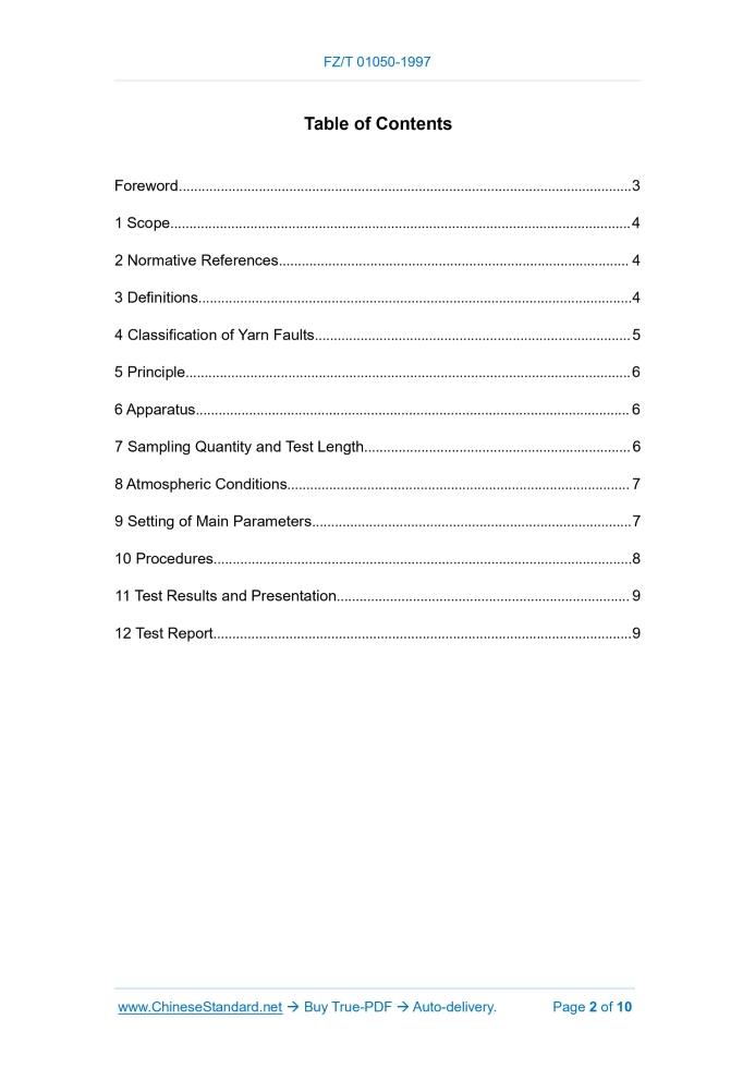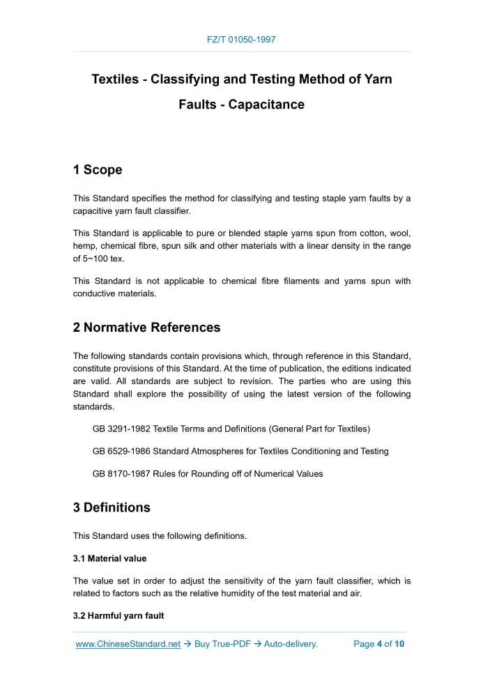 Similar standardsFZ/T 01050-1997: Textiles. Classifying and testing method of yarn faults. Capacitance---This is an excerpt. Full copy of true-PDF in English version (including equations, symbols, images, flow-chart, tables, and figures etc.), auto-downloaded/delivered in 9 seconds, can be purchased online: https://www.ChineseStandard.net/PDF.aspx/FZT01050-1997FZ TEXTILE INDUSTRY STANDARD OF THE PEOPLE’S REPUBLIC OF CHINA Textiles - Classifying and Testing Method of Yarn Faults - Capacitance Issued on: MAY 26, 1997 Implemented on: JANUARY 01, 1998 Issued by. China National Textile Council Table of ContentsForeword...3 1 Scope...4 2 Normative References... 4 3 Definitions...4 4 Classification of Yarn Faults...5 5 Principle...6 6 Apparatus... 6 7 Sampling Quantity and Test Length...6 8 Atmospheric Conditions... 7 9 Setting of Main Parameters...7 10 Procedures...8 11 Test Results and Presentation... 9 12 Test Report...9 Textiles - Classifying and Testing Method of Yarn Faults - Capacitance1 ScopeThis Standard specifies the method for classifying and testing staple yarn faults by a capacitive yarn fault classifier. This Standard is applicable to pure or blended staple yarns spun from cotton, wool, hemp, chemical fibre, spun silk and other materials with a linear density in the range of 5~100 tex. This Standard is not applicable to chemical fibre filaments and yarns spun with conductive materials.2 Normative ReferencesThe following standards contain provisions which, through reference in this Standard, constitute provisions of this Standard. At the time of publication, the editions indicated are valid. All standards are subject to revision. The parties who are using this Standard shall explore the possibility of using the latest version of the following standards. GB 3291-1982 Textile Terms and Definitions (General Part for Textiles) GB 6529-1986 Standard Atmospheres for Textiles Conditioning and Testing GB 8170-1987 Rules for Rounding off of Numerical Values3 DefinitionsThis Standard uses the following definitions. 3.1 Material value The value set in order to adjust the sensitivity of the yarn fault classifier, which is related to factors such as the relative humidity of the test material and air. 3.2 Harmful yarn fault 7.2 The taken samples shall be evenly distributed on each detector. 7.3 In daily inspections, a set of test lengths shall be no less than 100,000m, of which woollen yarns can be appropriately reduced, but at least 50,000m. For arbitration inspections, more than four sets of tests shall be carried out.8 Atmospheric Conditions8.1 The conditioning of the specimen shall adopt the secondary standard atmosphere specified in GB 6529, that is, equilibrate at a temperature of 20°C±2°C and a relative humidity of 65%±3% for more than 24h. When the large and tight sample package or one package needs to be tested for more than once, it shall be equilibrated for more than 48h. The standard atmosphere shall be kept constant during the conditioning and test process until the end of the test. 8.2 The specimen shall be adjusted and balanced under moisture absorption. If necessary, it can be pre-conditioned according to GB 6529. 8.3 If the factory test room does not have the above conditions, the test can be carried out under the following stable temperature and humidity conditions, after the specimen reaches the humidity balance (the mass change of continuous weighing every 30min does not exceed 0.1%). The average temperature is 18~28°C, and the average relative humidity is 55%~70% during the conditioning and test period. At the same time, it shall be ensured that the temperature change does not exceed an average temperature within the above range ±3°C; the relative humidity change does not exceed an average relative humidity within the above range ± 3%. The product acceptance and arbitration inspection shall be implemented in accordance with 8.1 and 8.2.9 Setting of Main Parameters9.1 Linear density. Set according to the nominal linear density. 9.2 Winding speed. 600m/min is recommended. At the same time, it shall be ensured that the difference between the setting speed of the instrument and the winding speed does not exceed ±10%. 9.2.1 The method of measuring the winding speed can be measured by a friction wheel tachometer in the middle of a half-full bobbin, or it can be estimated by weighing the yarn mass within a certain period of time to convert the length. 10.4.2 The measuring tank shall be cleaned before the test. After the yarn breaks or yarn faults are cut off during the test, the residual yarn in the measuring tank shall be removed immediately, and the splicing shall be continued for the test after at least 1min. 10.4.3 During the test, the area around the measuring tank shall be cleaned frequently to prevent flying from entering the measuring tank. 10.4.4 After each splicing, it shall be put into the measuring tank after the yarn speed reaches normal speed. 10.4.5When the sample is unwound to the last few turns of the package, it is prone to unloop, and false yarn fault signals appear. Therefore, the last few turns of yarn shall be discarded during operation.11 Test Results and Presentation11.1 The test results can generally be expressed in two ways, namely, the number of yarn faults at various levels of 100,000m, and the number of harmful yarn faults of 100,000m. The range of harmful yarn faults is determined according to product standards or relevant agreements. 11.2 During product acceptance and arbitration inspection, take the average of the four groups of specimens, and calculate the standard deviation (or coefficient of variation) if necessary. 11.3 The test results shall be rounded off according to the method specified in GB 8170.The number of yarn faults of 100,000 meters shall be kept in integer, and the remaining parts shall be retained for three significant figures.12 Test ReportExplain that the test is carried out in accordance with this Standard, and report 