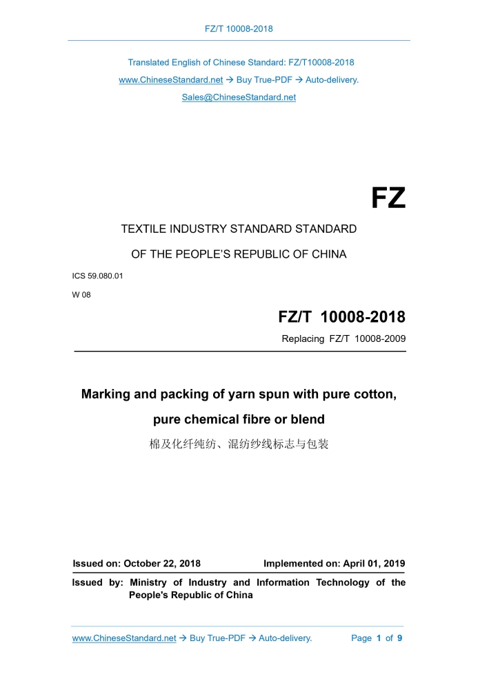 FZ/T 10008-2018: Marking and packing of yarn spun with pure cotton, pure chemical fibre or blend Delivery: 9 seconds. True-PDF full-copy in English & invoice will be downloaded + auto-delivered via email. See step-by-step procedure Status: Valid FZ/T 10008: Historical versions