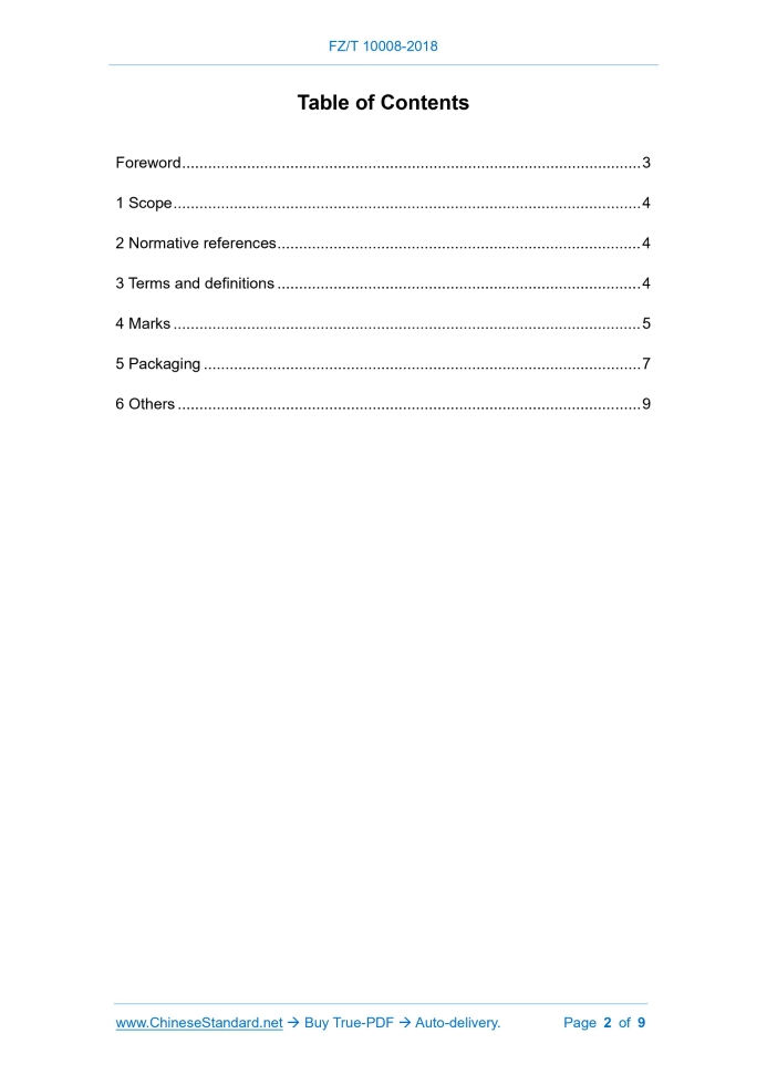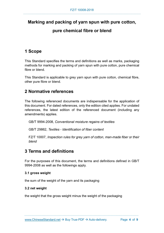 Similar standardsFZ/T 10008-2018: Marking and packing of yarn spun with pure cotton, pure chemical fibre or blend---This is an excerpt. Full copy of true-PDF in English version (including equations, symbols, images, flow-chart, tables, and figures etc.), auto-downloaded/delivered in 9 seconds, can be purchased online: https://www.ChineseStandard.net/PDF.aspx/FZT10008-2018FZ TEXTILE INDUSTRY STANDARD STANDARD OF THE PEOPLE’S REPUBLIC OF CHINA ICS 59.080.01 W 08 Replacing FZ/T 10008-2009 Marking and packing of yarn spun with pure cotton, pure chemical fibre or blend ISSUED ON: OCTOBER 22, 2018 IMPLEMENTED ON: APRIL 01, 2019 Issued by: Ministry of Industry and Information Technology of the People's Republic of China Table of ContentsForeword ... 3 1 Scope ... 4 2 Normative references ... 4 3 Terms and definitions ... 4 4 Marks ... 5 5 Packaging ... 7 6 Others ... 9 Marking and packing of yarn spun with pure cotton, pure chemical fibre or blend1 ScopeThis Standard specifies the terms and definitions as well as marks, packaging methods for marking and packing of yarn spun with pure cotton, pure chemical fibre or blend. This Standard is applicable to grey yarn spun with pure cotton, chemical fibre, other pure fibre or blend.2 Normative referencesThe following referenced documents are indispensable for the application of this document. For dated references, only the edition cited applies. For undated references, the latest edition of the referenced document (including any amendments) applies. GB/T 9994-2008, Conventional moisture regains of textiles GB/T 29862, Textiles - Identification of fiber content FZ/T 10007, Inspection rules for grey yarn of cotton, man-made fiber or their blend3 Terms and definitionsFor the purposes of this document, the terms and definitions defined in GB/T 9994-2008 as well as the followings apply. 3.1 gross weight the sum of the weight of the yarn and its packaging 3.2 net weight the weight that the gross weight minus the weight of the packaging 5.4 Packaging specifications 5.4.1 Packaging specifications of cheese yarn 5.4.1.1 The packaging specifications of cheese yarn are divided into fixed weight packaging and fixed number packaging. 5.4.1.2 The fixed-weight packaging of cheese yarn is divided into fixed-weight packaged and fixed-weight boxed. 5.4.1.3 Fixed-weight packaged cheese yarn: Determined according to the net weight at the regular moisture regain. The net weight of each package is 25kg or 20kg. It can also be stipulated in agreement. 5.4.1.4 Fixed-weight boxed cheese yarn: Determined according to the net weight at the regular moisture regain. The net weight of each box is in accordance with the agreement. 5.4.1.5 Fixed-number packaged cheese yarn: According to the size of the package and the size of the bobbin, the specified number of cheese yarns per package is packed and weighed. The receipt and payment are conducted based on the net weight converted at the regular moisture regain. 5.4.2 Packaging specifications of skein yarn 5.4.2.1 The packaging of skein yarn is divided into three types: small package, medium package and large package. 5.4.2.2 The net weight of each small package is 5kg. Each small package is divided into 100 single twists. For each single-strand, the nominal weight is 50g. However, according to different linear density, it can be spun into 1/4-strand weight 12.5g, 1/2-strand weight 25g, double-strand weight 100g, quadruple- strand weight 200g, or other small strands with different weights. The volume of small package is not more than 0.012m3. The size of each side is basically controlled at 30.5cm in length and 23.5cm in width, higher than about 16cm in height. The skein yarn shall be twisted by the horns, in orderly rows, into small packages. If the conditions are not met, manual twisting can be used temporarily. The skein yarns shall be neatly arranged and tied into small packages. 5.4.2.3 Every 20 small packages form a medium package. The weight is 100kg. The volume is not more than 0.22m3. The size of each side is basically controlled at 97cm in length, 34cm in width and 68cm in height. 5.4.2.4 Every 40 small packages form a large package. The weight is 200kg. 5.4.2.5 The nominal weight of the skein yarn package is determined according to the nominal linear density and the regular moisture regain. Its volume can be ......Source: Above contents are excerpted from the full-copy PDF -- translated/reviewed by: www.ChineseStandard.net / Wayne Zheng et al. Tips & Frequently Asked Questions:Question 1: How long will the true-PDF of English version of FZ/T 10008-2018 be delivered?Answer: The full copy PDF of English version of FZ/T 10008-2018 can be downloaded in 9 seconds, and it will also be emailed to you in 9 seconds (double mechanisms to ensure the delivery reliably), with PDF-invoice.Question 2: Can I share the purchased PDF of FZ/T 10008-2018_English with my colleagues?Answer: Yes. The purchased PDF of FZ/T 10008-2018_English will be deemed to be sold to your employer/organization who actually paid for it, including your colleagues and your employer's intranet.Question 3: Does the price include tax/VAT?Answer: Yes. Our tax invoice, downloaded/delivered in 9 seconds, includes all tax/VAT and complies with 100+ countries' tax regulations (tax exempted in 100+ countries) -- See Avoidance of Double Taxation Agreements (DTAs): List of DTAs signed between Singapore and 100+ countriesQuestion 4: Do you accept my currency other than USD?Answer: Yes. www.ChineseStandard.us -- FZ/T 10008-2018 -- Click this link and select your country/currency to pay, the exact amount in your currency will be printed on the invoice. Full PDF will also be downloaded/emailed in 9 seconds.Question 5: Should I purchase the latest version FZ/T 10008-2018?Answer: Yes. Unless special scenarios such as technical constraints or academic study, you should always prioritize to purchase the latest version FZ/T 10008-2018 even if the enforcement date is in future. Comp