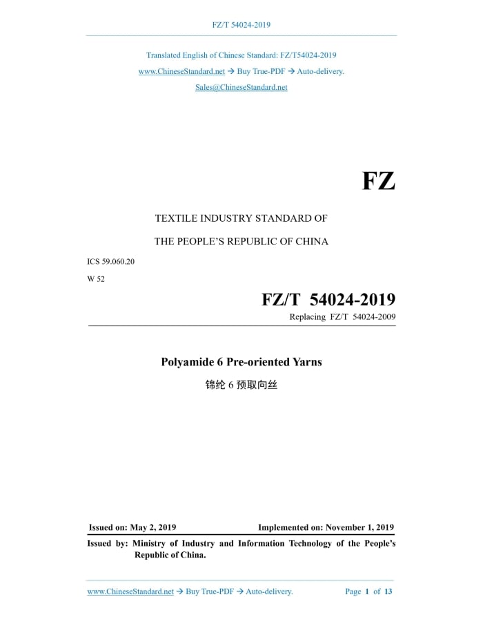 FZ/T 54024-2019: Polyamide 6 pre-oriented yarns Delivery: 9 seconds. True-PDF full-copy in English & invoice will be downloaded + auto-delivered via email. See step-by-step procedure Status: Valid FZ/T 54024: Historical versions