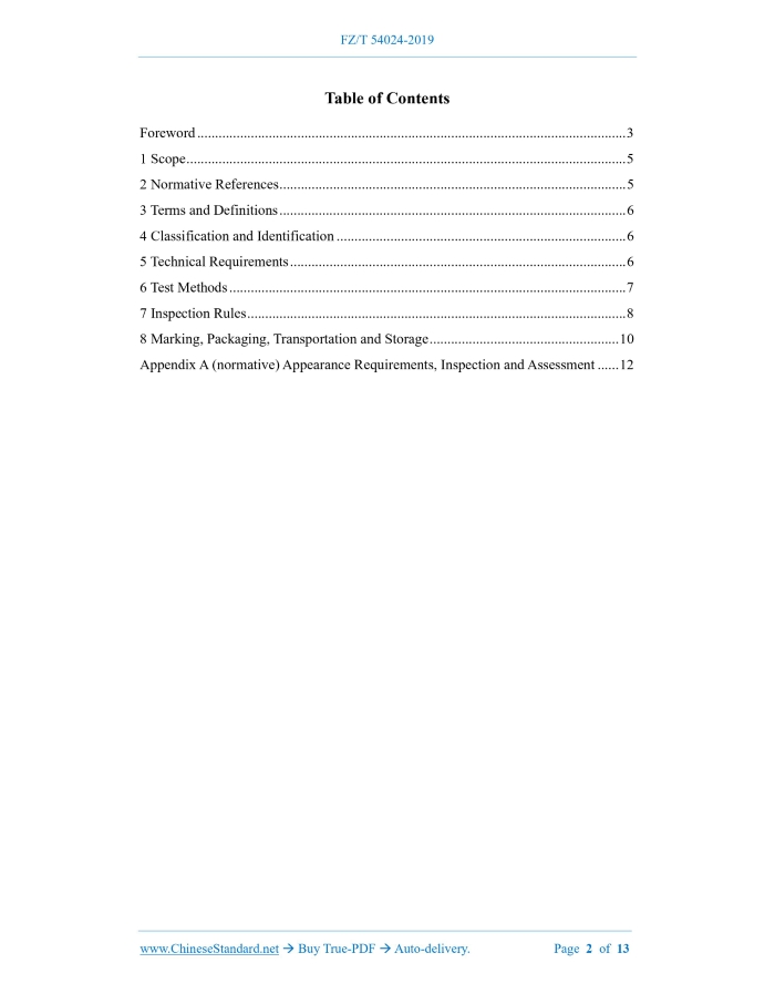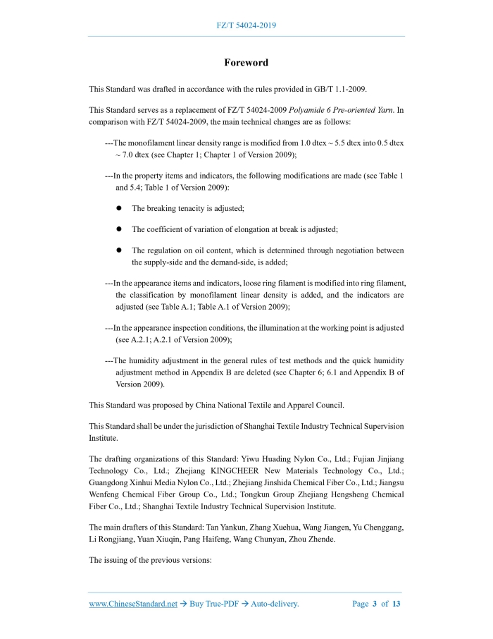 Similar standardsFZ/T 54024-2019: Polyamide 6 pre-oriented yarns---This is an excerpt. Full copy of true-PDF in English version (including equations, symbols, images, flow-chart, tables, and figures etc.), auto-downloaded/delivered in 9 seconds, can be purchased online: https://www.ChineseStandard.net/PDF.aspx/FZT54024-2019FZ TEXTILE INDUSTRY STANDARD OF THE PEOPLE’S REPUBLIC OF CHINA ICS 59.060.20 W 52 Replacing FZ/T 54024-2009 Polyamide 6 Pre-oriented Yarns 锦纶 6预取向丝 Issued on: MAY 2, 2019 Implemented on: NOVEMBER 1, 2019 Issued by. Ministry of Industry and Information Technology of the People’s Republic of China. Table of ContentsForeword... 3 1 Scope... 5 2 Normative References... 5 3 Terms and Definitions... 6 4 Classification and Identification... 6 5 Technical Requirements... 6 6 Test Methods... 7 7 Inspection Rules... 8 8 Marking, Packaging, Transportation and Storage... 10 Appendix A (normative) Appearance Requirements, Inspection and Assessment... 12ForewordThis Standard was drafted in accordance with the rules provided in GB/T 1.1-2009. This Standard serves as a replacement of FZ/T 54024-2009 Polyamide 6 Pre-oriented Yarn. In comparison with FZ/T 54024-2009, the main technical changes are as follows. ---The monofilament linear density range is modified from 1.0 dtex ~ 5.5 dtex into 0.5 dtex ~ 7.0 dtex (see Chapter 1; Chapter 1 of Version 2009); ---In the property items and indicators, the following modifications are made (see Table 1 and 5.4; Table 1 of Version 2009). The breaking tenacity is adjusted; The coefficient of variation of elongation at break is adjusted; The regulation on oil content, which is determined through negotiation between the supply-side and the demand-side, is added; ---In the appearance items and indicators, loose ring filament is modified into ring filament, the classification by monofilament linear density is added, and the indicators are adjusted (see Table A.1; Table A.1 of Version 2009); ---In the appearance inspection conditions, the illumination at the working point is adjusted (see A.2.1; A.2.1 of Version 2009); ---The humidity adjustment in the general rules of test methods and the quick humidity adjustment method in Appendix B are deleted (see Chapter 6; 6.1 and Appendix B of Version 2009). This Standard was proposed by China National Textile and Apparel Council. This Standard shall be under the jurisdiction of Shanghai Textile Industry Technical Supervision Institute. The drafting organizations of this Standard. Yiwu Huading Nylon Co., Ltd.; Fujian Jinjiang Technology Co., Ltd.; Zhejiang KINGCHEER New Materials Technology Co., Ltd.; Guangdong Xinhui Media Nylon Co., Ltd.; Zhejiang Jinshida Chemical Fiber Co., Ltd.; Jiangsu Wenfeng Chemical Fiber Group Co., Ltd.; Tongkun Group Zhejiang Hengsheng Chemical Fiber Co., Ltd.; Shanghai Textile Industry Technical Supervision Institute. The main drafters of this Standard. Tan Yankun, Zhang Xuehua, Wang Jiangen, Yu Chenggang, Li Rongjiang, Yuan Xiuqin, Pang Haifeng, Wang Chunyan, Zhou Zhende. The issuing of the previous versions. Polyamide 6 Pre-oriented Yarns1 ScopeThis Standard specifies the terms and definitions, classification and identification, technical requirements, test methods, inspection rules, and the requirements for marking, packaging, transportation and storage of polyamide 6 pre-oriented yarns. This Standard is applicable to pre-oriented yarns processed from polycaprolactam as the raw material (mainly used for processing drawn textured yarns), and with a nominal linear density range of 8 dtex ~ 444 dtex; glossy, semi-dull and full-dull natural-colored polyamide 6 pre- oriented yarns with a monofilament linear density of 0.5 dtex ~ 7.0 dtex, and a round cross section.2 Normative ReferencesThe following documents are indispensable to the application of this document. In terms of references with a specified date, only versions with a specified date are applicable to this document. In terms of references without a specified date, the latest version (including all the modifications) is applicable to this document. GB/T 250 Textiles - Tests for Color Fastness - Grey Scale for Assessing Change in Color GB/T 2828.1-2012 Sampling Procedures for Inspection by Attributes - Part 1.Sampling Schemes Indexed by Acceptance Quality Limit (AQL) for Lot-by-lot Inspection GB/T 3291.1 Textiles - Terms of Textile Material Properties and Test - Part 1.Fiber and Yarn GB/T 3291.3 Textiles - Terms of Textile Material Properties and Test - Part 3.General GB/T 4146 (all parts) Textiles - Man-made Fibers GB/T 6502 Sampling Method of Man-made Filament Yarns GB/T 6503 Man-made Fibers - Test Method of Moisture Regain GB/T 6504 Man-made Fiber - Test Method for Oil Content GB/T 8170-2008 Rules of Rounding off for Numerical Values & Expression and Judgement of Limiting Values GB/T 14343 Testing Method for Linear Density of Man-made Filament Yarns GB/T 14344 Testing Method for Tensile of Man-made Filament Yarns GB/T 14346 Man-made Fiber - Testing Method for Unevenness of Filament Yarns - Capacitance Method FZ/T 50027 Man-made Fibers - Test Method for Determination of the Titanium Dioxide Content3 Terms and DefinitionsThe terms and definitions defined in GB/T 3291.1, GB/T 3291.3 and GB/T 4146 (all parts) are applicable to this document.4 Classification and Identification4.1 In accordance with the amount of titanium dioxide added during production, the products can be classified into glossy, semi-dull and full-dull yarns. 4.2 Product specifications are identified by linear density (dtex) and the number of monofilaments (f), for example, if the linear density is 93 dtex and the number of monofilaments is 68, the product specifications are expressed as. 93 dtex/68 f. 4.3 Product identification shall include. product specifications, color, product name or batch No., which can be effectively distinguished.5 Technical Requirements5.1 Product Grading Products are divided into three grades. superior products, first-