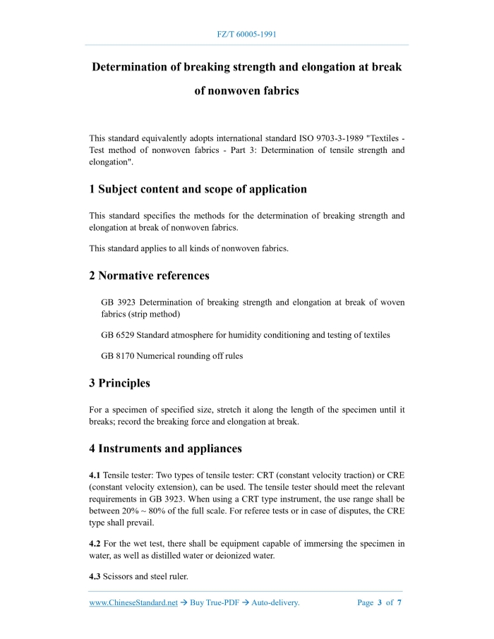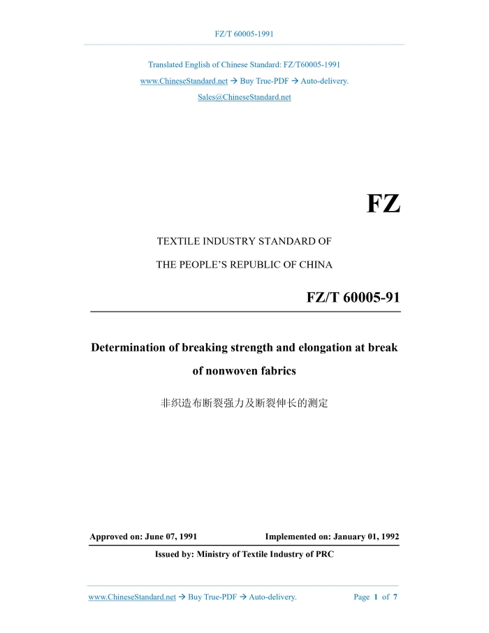 FZ/T 60005-1991: Determination of breaking strength and elongation at break of nonwoven fabrics Delivery: 9 seconds. True-PDF full-copy in English & invoice will be downloaded + auto-delivered via email. See step-by-step procedure Status: Obsolete