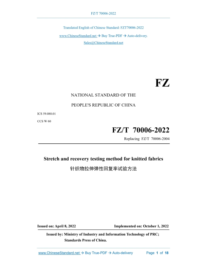 FZ/T 70006-2022: Stretch and recovery testing method for knitted fabrics Delivery: 9 seconds. True-PDF full-copy in English & invoice will be downloaded + auto-delivered via email. See step-by-step procedure Status: Valid FZ/T 70006: Historical versions