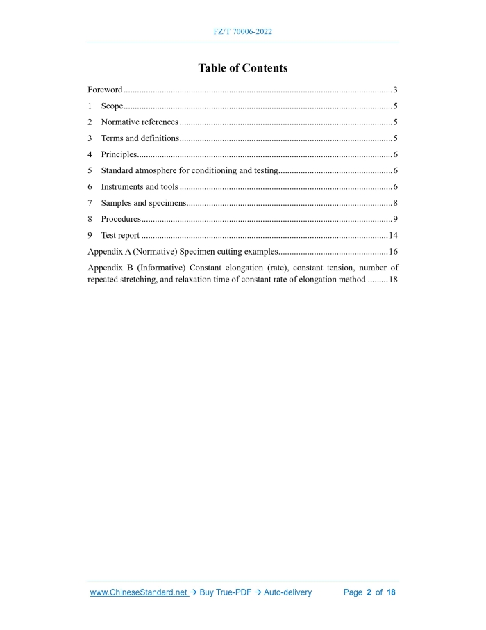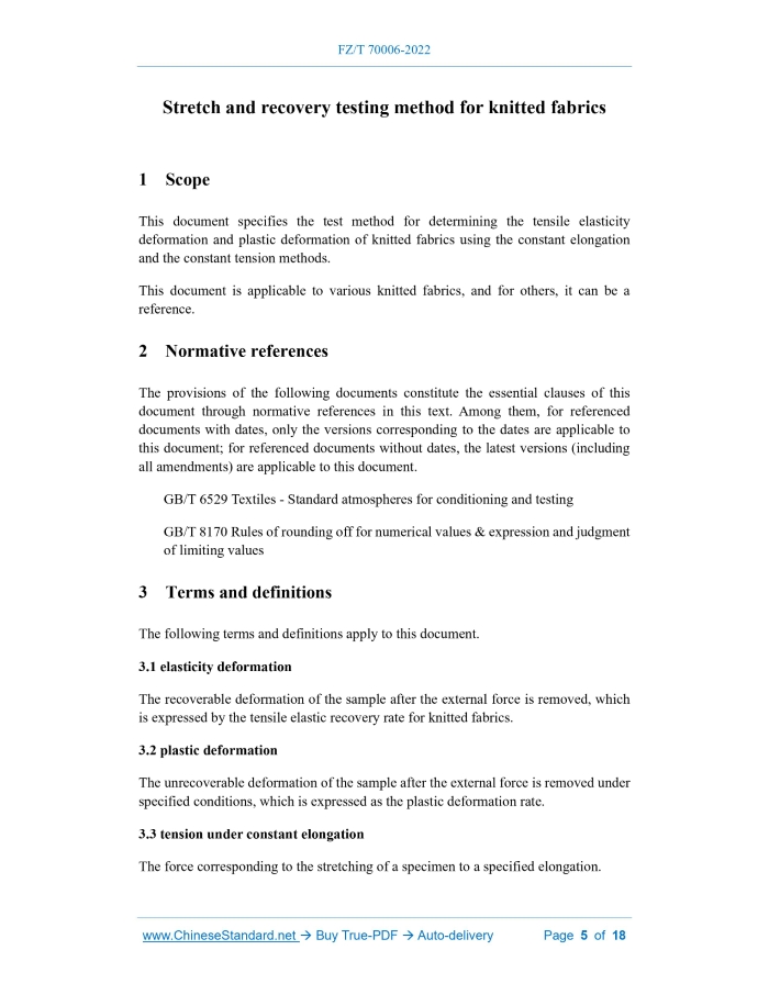 Similar standardsFZ/T 70006-2022: Stretch and recovery testing method for knitted fabrics---This is an excerpt. Full copy of true-PDF in English version (including equations, symbols, images, flow-chart, tables, and figures etc.), auto-downloaded/delivered in 9 seconds, can be purchased online: https://www.ChineseStandard.net/PDF.aspx/FZT70006-2022FZ NATIONAL STANDARD OF THE PEOPLE'S REPUBLIC OF CHINA ICS 59.080.01 CCS W 60 Replacing FZ/T 70006-2004 Stretch and recovery testing method for knitted fabrics ISSUED ON: APRIL 8, 2022 IMPLEMENTED ON: OCTOBER 1, 2022 Issued by: Ministry of Industry and Information Technology of PRC; Standards Press of China. Table of ContentsForeword ... 3 1 Scope ... 5 2 Normative references ... 5 3 Terms and definitions ... 5 4 Principles ... 6 5 Standard atmosphere for conditioning and testing ... 6 6 Instruments and tools ... 6 7 Samples and specimens ... 8 8 Procedures ... 9 9 Test report ... 14 Appendix A (Normative) Specimen cutting examples ... 16 Appendix B (Informative) Constant elongation (rate), constant tension, number of repeated stretching, and relaxation time of constant rate of elongation method ... 18 Stretch and recovery testing method for knitted fabrics1 ScopeThis document specifies the test method for determining the tensile elasticity deformation and plastic deformation of knitted fabrics using the constant elongation and the constant tension methods. This document is applicable to various knitted fabrics, and for others, it can be a reference.2 Normative referencesThe provisions of the following documents constitute the essential clauses of this document through normative references in this text. Among them, for referenced documents with dates, only the versions corresponding to the dates are applicable to this document; for referenced documents without dates, the latest versions (including all amendments) are applicable to this document. GB/T 6529 Textiles - Standard atmospheres for conditioning and testing GB/T 8170 Rules of rounding off for numerical values & expression and judgment of limiting values3 Terms and definitionsThe following terms and definitions apply to this document. 3.1 elasticity deformation The recoverable deformation of the sample after the external force is removed, which is expressed by the tensile elastic recovery rate for knitted fabrics. 3.2 plastic deformation The unrecoverable deformation of the sample after the external force is removed under specified conditions, which is expressed as the plastic deformation rate. 3.3 tension under constant elongation The force corresponding to the stretching of a specimen to a specified elongation. 3.4 elongation under constant tension The elongation of a specimen when it is subjected to a specified tensile force. 3.5 pre-tension The force applied to straighten a specimen before stretching without causing it to be stretched.4 Principles4.1 Constant rate of elongation method: The specimen is stretched at a constant speed by using special instruments and equipment to be deformed in length. After the load is released, the tensile elastic recovery rate and plastic deformation rate are calculated based on the deformation. 4.2 Delayed load stretching method: The specimen is stretched by using special instruments and equipment to be deformed in length, and the deformation state is maintained for a long time. After the load is released, the tensile elastic recovery rate is calculated based on the deformation.5 Standard atmosphere for conditioning and testing5.1 The standard atmosphere specified in GB/T 6529 shall be used for conditioning and testing. 5.2 After pre-conditioning, the samples are placed in the conditioning atmosphere to allow them to absorb moisture in equilibrium. Cotton and blended fabrics should be conditioned for 24 hours, and pure chemical fabrics should be conditioned for 4 hours.6 Instruments and tools6.1 The testing instrument for the constant rate of elongation method shall meet the following requirements (using CRE type tensile tester): a) Clamping distance length: 100 mm±1 mm; b) The instrument shall be able to set the stretching speed within the range of 50 mm/min~300 mm/min with an accuracy of ±2%; c) The maximum error of strength indication shall not exceed 1%, and the maximum error of elongation indication shall not exceed 1%; d) The instrument shall be able to set the pre-tension; specimen flat on the table and make a pair of marks at the center of one side of the ring specimen along the length direction of the specimen. The distance between the two marking lines is 125 mm±3 mm. 7.6 The specimens shall be arranged in accordance with the method given in Appendix A. In general, method B (parallel method) shall be used for cutting. In arbitration, method A (step-shaped) cutting shall be used, and one side of the length direction shall be parallel to the longitudinal coil (or horizontal coil) of the sample.8 Procedures8.1 Instrument calibration and preparation 8.1.1 Constant-rate of elongation method 8.1.1.1 Adjust the clamp gauge and check that the jaws are accurately aligned and parallel to ensure that the applied force does not cause angular deviation. 8.1.1.2 Set up the test procedure according to the test requirements. The stretching speed shall be selected within the range of 50 mm/min~300 mm/min according to the product standard or the agreement between the relevant parties. If the stretching speed is not specified, it can be set to 300 mm/min. The stretching speed when applying pre-tension can be set at a speed that supports reading the elongation value accurately when applying pre-tension according to the specific situation of the test instrument, and it shall be stated in the test report. The pre-tension can generally be set to 0.1 N. For specimens that will elongate when a very small force is applied, the pre-tension should be set to 0.05 N. 8.1.2 Delayed load stretching method Check whether the stand is stable to ensure the smooth progress 