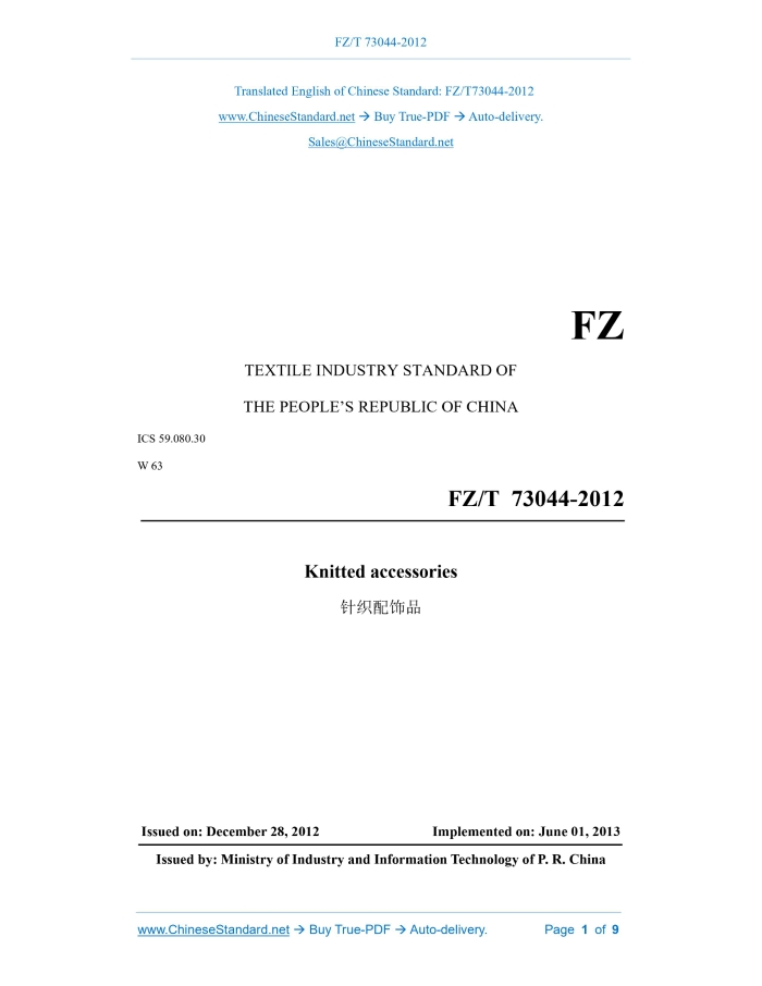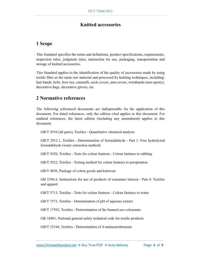 FZ/T 73044-2012: Knitted accessories Delivery: 9 seconds. True-PDF full-copy in English & invoice will be downloaded + auto-delivered via email. See step-by-step procedure Status: Valid