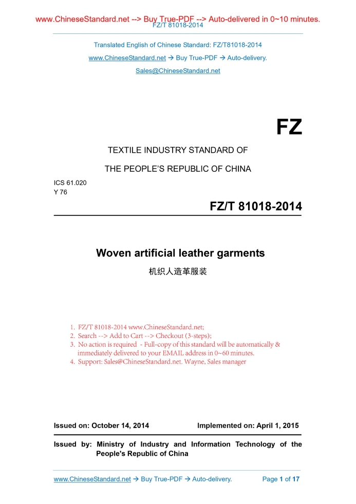 FZ/T 81018-2014: Woven artificial leather garments Delivery: 9 seconds. True-PDF full-copy in English & invoice will be downloaded + auto-delivered via email. See step-by-step procedure Status: Valid FZ/T 81018: Historical versions