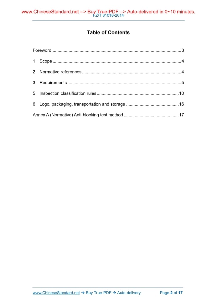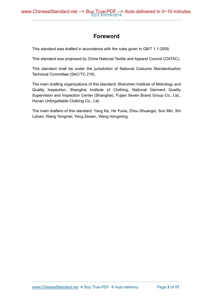 Similar standardsFZ/T 81018-2014: Woven artificial leather garments---This is an excerpt. Full copy of true-PDF in English version (including equations, symbols, images, flow-chart, tables, and figures etc.), auto-downloaded/delivered in 9 seconds, can be purchased online: https://www.ChineseStandard.net/PDF.aspx/FZT81018-2014FZ TEXTILE INDUSTRY STANDARD OF THE PEOPLE’S REPUBLIC OF CHINA ICS 61.020 Y 76 Woven artificial leather garments Issued on: OCTOBER 14, 2014 Implemented on: APRIL 1, 2015 Issued by. Ministry of Industry and Information Technology of the People's Republic of China Table of ContentsForeword... 3 1 Scope... 4 2 Normative references... 4 3 Requirements... 5 5 Inspection classification rules... 10 6 Logo, packaging, transportation and storage... 16 Annex A (Normative) Anti-blocking test method... 17ForewordThis standard was drafted in accordance with the rules given in GB/T 1.1-2009. This standard was proposed by China National Textile and Apparel Council (CNTAC). This standard shall be under the jurisdiction of National Costume Standardization Technical Committee (SAC/TC 219). The main drafting organizations of this standard. Shenzhen Institute of Metrology and Quality Inspection, Shanghai Institute of Clothing, National Garment Quality Supervision and Inspection Center (Shanghai), Fujian Seven Brand Group Co., Ltd., Hunan Unforgettable Clothing Co., Ltd. The main drafters of this standard. Yang Ke, He Yuxia, Zhou Shuangxi, Sun Min, Shi Lizhen, Wang Yongmei, Yang Zewen, Wang Hongming. Woven artificial leather garment1 ScopeThis standard specifies products requirements, testing methods and test classification rules of woven artificial leather garments, as well as logo, packaging, transportation, storage and all other technical features. This standard applies to the clothing that is produced by artificial leather (textile machine fabric is the base cloth) as the main fabric. This standard does not apply to the clothing of infants aged 36 months and below.2 Normative referencesThe following documents for the application of this document are essential. For dated references, only those dated references apply to this document. For undated references, the latest edition (including all amendments) applies to this document. GB/T 250 Textiles - Tests for color fastness - Gray sample card for discoloration GB/T 251 Textiles - Tests for color fastness - Gray sample card for staining GB/T 1335 (all parts) Clothing size GB/T 4841.3 Color cards of standard depths for dyeing with dyestuffs 2/1, 1/3, 1/6, 1/12, 1/25 GB 5296.4 Instructions for use of products of consumer interest - Part 4.Textiles and apparel GB/T 6040 General rules for infrared analysis GB/T 8949 Polyurethane dry-processing artificial leather GB 18401 National general safety technical code for textile products GB/T 21294 Testing methods of physical and chemical performance of garments GB/T 21295 Requirements of physical and chemical performance of garments GB 21550 Restriction of hazardous materials in polyvinyl chloride artificial leather GB/T 29862 Textiles - Identification of fiber content GB/T 31907 Method of garment measurement QB/T 2714 Leather - Physical and mechanical tests - Determination of flex resistance FZ/T 80002 Marking, packaging, transportation and storage for garments FZ/T 80004 Rule for garments delivery inspection3 Requirements3.1 Instructions for use Leatherette fabric shall be marked with the main types of coating; the instructions of the rest of finished-product are according to the regulations of GB 5296.4. 3.2 Size specifications Size setting is chosen according to the provisions of GB/T 1335. 3.3 Raw materials 3.3.1 Fabric Select and use the artificial leather fabric to comply with the quality requirements of the standard according to national standards for artificial leather. 3.3.2 Lining Use the lining suitable for the fabric used and to comply with the quality requirements of the standard. 3.3.3 Accessories 3.3.3.1 Lining and shoulder pads Use the lining and the shoulder pads suitable for the performance and the color of the fabric used, and the quality shall be consistent with the provisions of this standard. 3.3.3.2 Stitches Use the stitches suitable for the performance and the color of fabric and accessories; shrinkage of embroidery thread shall be compatible with the fabric. 3.3.3.3 Buttons, zippers and accessories Use buttons, zippers and other accessories suitable for the fabric used. The surface of buttons shall be smooth and defect-free; accessories shall be free from scratches, sharp points and sharp edges; moreover, after washing and/or ironing they have no deformation, discoloration, staining and rusting. Zippers’ mesh is well, smooth and easy. Perspiration resistance Water resistance Seam slippage degree/cm Conform to the provisions of GB/T 21295 3.10.2 According to the provisions of GB/T 4841.3, if the color is darker than 1/12, then the dyeing standard depth is dark color; if the color is lighter than or equal to 1/12, then the dyeing standard depth is light-color. 3.10.3 Limit for hazardous substances of PVC artificial leather only checks PVC artificial leather. 3.10.4 Anti-yellowing only checks light-colored and white leatherette fabric. 3.10.5 Seam slippage degree only checks woven fabric lining. 4 Test methods 4.1 Inspection tools 4.1.1 Steel tape or steel ruler, indexing value is 1mm. 4.1.2 Use gray sample card (GB/T 250) to test and assess the coloration of textile color fastness. 4.1.3 Use gray sample card (GB/T 251) to test and assess the staining of textile color fastness. 4.1.4 1/12 Color cards of standard depths for dyeing with dyestuffs (GB/T 4841.3). 4.2 Finished-product specification determination 4.2.1 The specification of the main parts of finished-product is according to 3.2 regulations. 4.2.2 The measurement of the main parts of finished-product is according to GB/T 31907; allowed specification deviation is according to 3.8 regulations. 4.3 Appearance dete