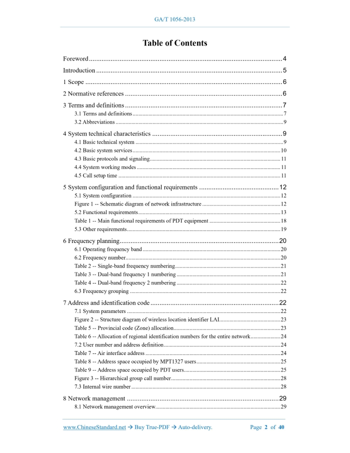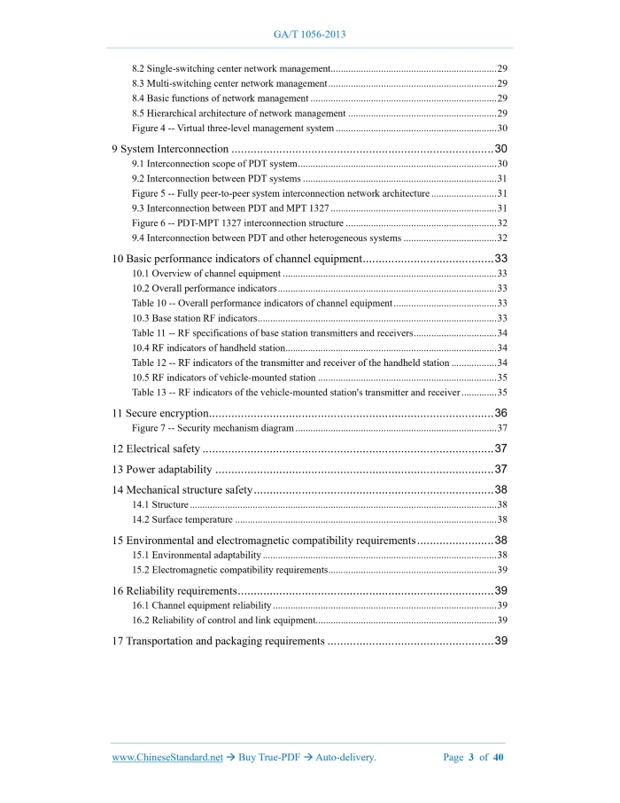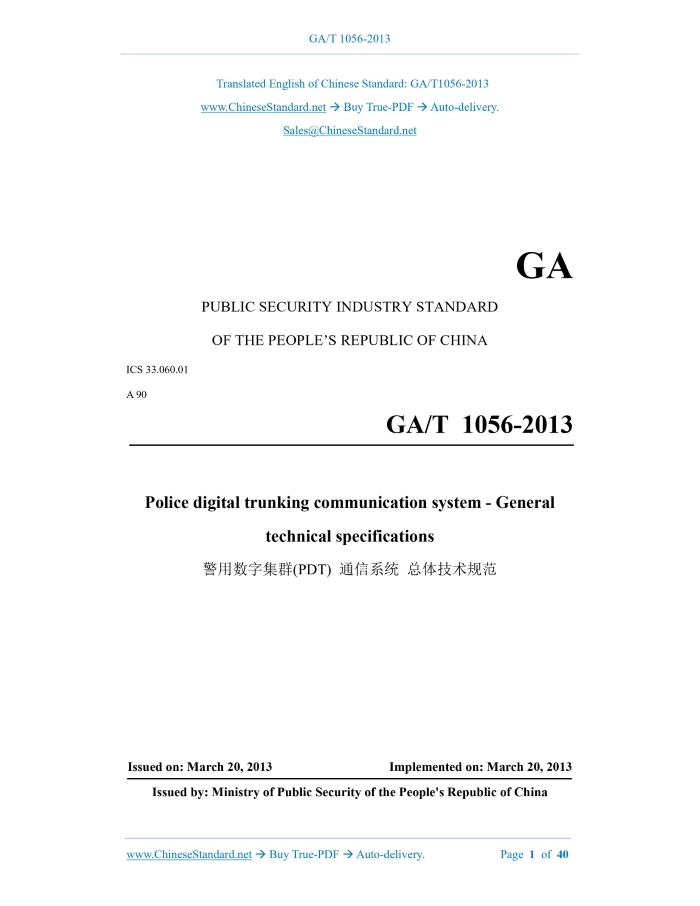 Similar standardsGA/T 1056-2013: Police digital trunking communication system-General technical specifications---This is an excerpt. Full copy of true-PDF in English version (including equations, symbols, images, flow-chart, tables, and figures etc.), auto-downloaded/delivered in 9 seconds, can be purchased online: https://www.ChineseStandard.net/PDF.aspx/GAT1056-2013GA PUBLIC SECURITY INDUSTRY STANDARD ICS 33.060.01 A 90 Police digital trunking communication system - General technical specifications Issued on. MARCH 20, 2013 Implemented on. MARCH 20, 2013 Issued by. Ministry of Public Security of the People's Republic of China Table of ContentsForeword... 4 Introduction... 5 1 Scope... 6 2 Normative references... 6 3 Terms and definitions... 7 3.1 Terms and definitions... 7 3.2 Abbreviations... 9 4 System technical characteristics... 9 5 System configuration and functional requirements... 12 6 Frequency planning... 20 Table 2 -- Single-band frequency numbering... 21 Table 3 -- Dual-band frequency 1 numbering... 21 Table 4 -- Dual-band frequency 2 numbering... 22 7 Address and identification code... 22 8 Network management... 29 9 System Interconnection... 30 10 Basic performance indicators of channel equipment... 33 11 Secure encryption... 36 Figure 7 -- Security mechanism diagram... 37 12 Electrical safety... 37 13 Power adaptability... 37 14 Mechanical structure safety... 38 15 Environmental and electromagnetic compatibility requirements... 38 16 Reliability requirements... 39 17 Transportation and packaging requirements... 391 ScopeThis Standard specifies the technical characteristics, system composition and functional requirements, operating frequency band, address and identification code, network management, basic performance indicators of channel equipment, AC power supply system, information security and confidentiality, environment and electromagnetic compatibility, reliability and other general requirements of the police digital trunking (PDT) communication system. This Standard applies to the overall planning, network design, equipment development, production, engineering construction and acceptance of the police digital trunking (PDT) communication system.2 Normative referencesThe following referenced documents are indispensable for the application of this document. For dated references, only the edition cited applies. For undated references, the latest edition of the referenced document (including any amendments) applies. GB/T 7610-1987, Characteristics of pulse code modulation for voice-frequencies GB/T 13426-1992, Reliability requirements and test methods for digital communication equipment GB/T 14013-1992, Mobile communication equipment -- Transport package GB/T 15540-2006, EMC specification and test methods for land mobile communication equipment GB/T 15844.3-1995, Reliability requirements and test methods for radio transceiver employing F3E emission used in the mobile services GB/T 17626.2-2006, Electromagnetic compatibility (EMC) -- Testing and measurement techniques -- Electrostatic discharge immunity test3 Terms and definitions3.1 Terms and definitions The following terms and definitions apply to this document. 3.2 Abbreviations The following abbreviations apply to this document. BS. Base Station DMO. Direct Mode FGN. Fleet Group Number FIN. Fleet Individual Number GN. Group Number4 System technical characteristics4.1 Basic technical system 4.1.1 Technical system 4.1.2 RF modulation method The RF modulation method uses four-level frequency shift keying (4FSK). 4.1.3 Modulation rate The modulation is transmitted at 4800 symbols/s. Each symbol consists of two bits of information. 4.1.4 Speech coding The speech coding rate shall be greater than or equal to 2 kbps. The rate after speech coding plus channel coding shall be 3.6 kbps. 4.2 Basic system services 4.2.1 User terminal services User terminal services are services that provide complete communication capabilities between user terminals. 4.2.2 Carrying services Carrying services are telecommunication services that provide signal transmission capabilities between user terminals and network interfaces. 4.3 Basic protocols and signaling The basic protocols and signaling of the air interface shall comply with the provisions of GA/T 1057-2013 and GA/T 1058-2013. 4.4 System working modes 4.5 Call setup time The time to establish a group call within the same exchange shall be less than or equal to 300 ms.5 System configuration and functional requirements5.1 System configuration 5.1.1 Network infrastructure Network infrastructure equipment includes switches, gateways, network management equipment, base station control equipment and access points, as shown in Figure 1. 5.1.2 User terminal equipment 5.2 Functional requirements 5.2.1 Functional definition 5.2.1.1 Registration Registration is the process of a mobile station initiating a network access request and confirming it to the trunking system. Authentication may be required during registration. 5.2.1.5 Voice private call A voice private call is a point-to-point two-way voice call established between a mobile station and other user terminals. The participants of a call are only the caller and the called party. There are two types of voice private calls between mobile stations. FOACSU and OACSU. 5.2.1.10 Emergency call An emergency call is a special call initiated by a user in an emergency situation. It has the highest priority. When there are no channel resources, the system will release channel resources of other low-level calls for emergency calls. 5.2.1.11 Priority call Priority calls are calls that are given priority to obtain resources when the system is busy. The way to obtain resources can be to seize the channel of low-priority calls or to jump the queue in the queue. 5.2.1.12 Alarm An alarm is when a user presses a special button on a mobile station device in an emergency, sending a predefined status message to a pre-set destination (mobile station or dispatch st