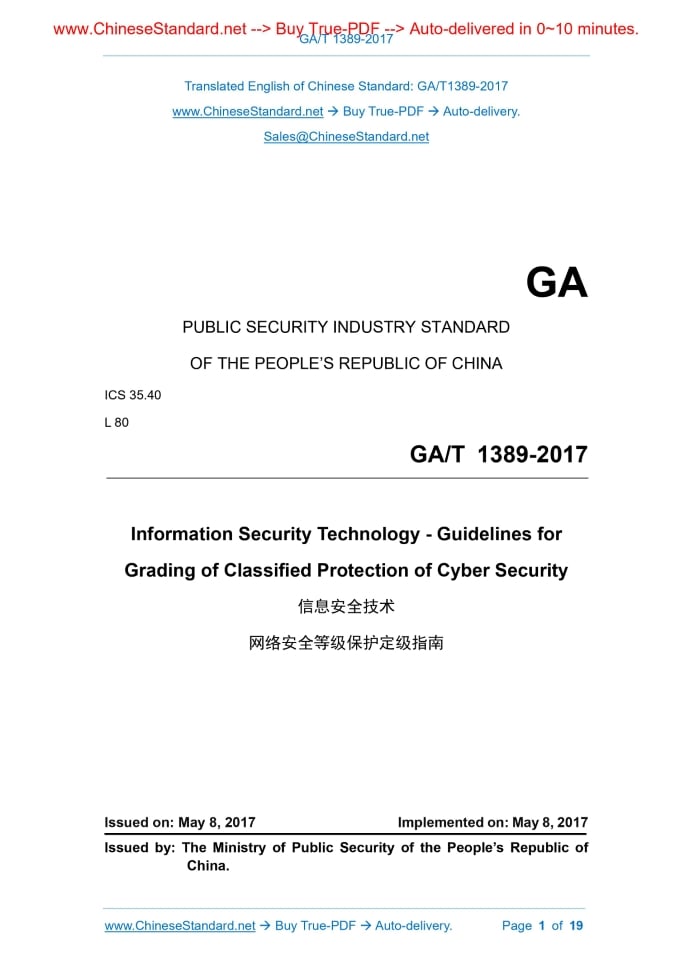 GA/T 1389-2017: Information Security Technology - Guidelines for Grading of Classified Protection of Cyber Security Delivery: 9 seconds. True-PDF full-copy in English & invoice will be downloaded + auto-delivered via email. See step-by-step procedure Status: Valid