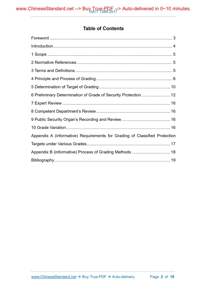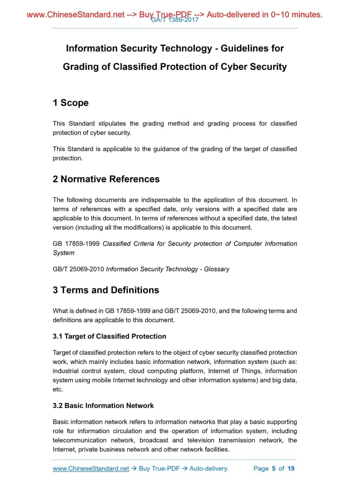 Similar standardsGA/T 1389-2017: Information Security Technology - Guidelines for Grading of Classified Protection of Cyber Security---This is an excerpt. Full copy of true-PDF in English version (including equations, symbols, images, flow-chart, tables, and figures etc.), auto-downloaded/delivered in 9 seconds, can be purchased online: https://www.ChineseStandard.net/PDF.aspx/GAT1389-2017 PUBLIC SECURITY INDUSTRY STANDARD OF THE PEOPLE’S REPUBLIC OF CHINA ICS 35.40 L 80 Information Security Technology - Guidelines for Grading of Classified Protection of Cyber Security ISSUED ON: MAY 8, 2017 IMPLEMENTED ON: MAY 8, 2017 Issued by: The Ministry of Public Security of the People’s Republic of China. Table of ContentsForeword ... 3 Introduction ... 4 1 Scope ... 5 2 Normative References ... 5 3 Terms and Definitions ... 5 4 Principle and Process of Grading ... 6 5 Determination of Target of Grading ... 10 6 Preliminary Determination of Grade of Security Protection ... 12 7 Expert Review ... 16 8 Competent Department’s Review ... 16 9 Public Security Organ’s Recording and Review ... 16 10 Grade Variation ... 16 Appendix A (informative) Requirements for Grading of Classified Protection Targets under Various Grades ... 17 Appendix B (informative) Process of Grading Methods ... 18 Bibliography ... 19 Information Security Technology - Guidelines for Grading of Classified Protection of Cyber Security1 ScopeThis Standard stipulates the grading method and grading process for classified protection of cyber security. This Standard is applicable to the guidance of the grading of the target of classified protection.2 Normative ReferencesThe following documents are indispensable to the application of this document. In terms of references with a specified date, only versions with a specified date are applicable to this document. In terms of references without a specified date, the latest version (including all the modifications) is applicable to this document. GB 17859-1999 Classified Criteria for Security protection of Computer Information System GB/T 25069-2010 Information Security Technology - Glossary3 Terms and DefinitionsWhat is defined in GB 17859-1999 and GB/T 25069-2010, and the following terms and definitions are applicable to this document. 3.1 Target of Classified Protection Target of classified protection refers to the object of cyber security classified protection work, which mainly includes basic information network, information system (such as: industrial control system, cloud computing platform, Internet of Things, information system using mobile Internet technology and other information systems) and big data, etc. 3.2 Basic Information Network Basic information network refers to information networks that play a basic supporting role for information circulation and the operation of information system, including telecommunication network, broadcast and television transmission network, the Internet, private business network and other network facilities. c) Grade-3: after the target of classified protection is damaged, it would cause extremely severe damage to the legitimate rights and interests of citizens, juridical persons and other organizations, or cause severe damage to the social order and public interests, or cause damage to the national security; d) Grade-4: after the target of classified protection is damaged, it would cause extremely severe damage to the social order and public interests, or cause severe damage to the national security; e) Grade-5: after the target of classified protection is damaged, it would cause extremely severe damage to the national security. 4.2 Grading Elements 4.2.1 An overview of grading elements The grade of the target of classified protection is determined by two grading elements: a) The object being infringed; b) The degree of infringement on the object. 4.2.2 The object being infringed When the target of classified protection is damaged, the object being infringed includes the following three aspects: a) Legitimate rights and interests of citizens, juridical persons and other organizations; b) Social order and public interests; c) National security. The infringement of the legitimate rights and interests of citizens, juridical persons and other organizations means certain social rights and interests enjoyed by citizens, juridical persons and other organizations confirmed and protected by law are impaired. The infringement of the social order includes the following aspects: a) Affect the work order of social management and public services of state organs; b) Affect the order of various types of economic activities; c) Affect the order of scientific research and production in various industries; d) Affect the normal life of the public under legal constraints and ethics; e) Other effects on the social order. The infringement of the public interests includes the following aspects: a) Affect social members’ use of public facilities; b) Affect social members’ acquisition of public information resources; c) Affect social members’ reception of public services; d) Other effects on the public interests. The infringement of the national security includes the following aspects: a) Affect the steadiness of state power and national defense strength; b) Affect national unity, ethnic unity and social stability; c) Affect national political and economic interests in foreign activities; d) Affect important national security defense work; e) Affect national economic competitiveness and technological strength; f) Other effects on the national security. 4.2.3 The degree of infringement on the object The degree of infringement on the object is comprehensively determined by different external manifestations of the objective aspects. Since the infringement on the object is implemented by destroying the target of classified protection, the external manifestation of the infringement on the object is the damage to the target of classified protection, which is desc