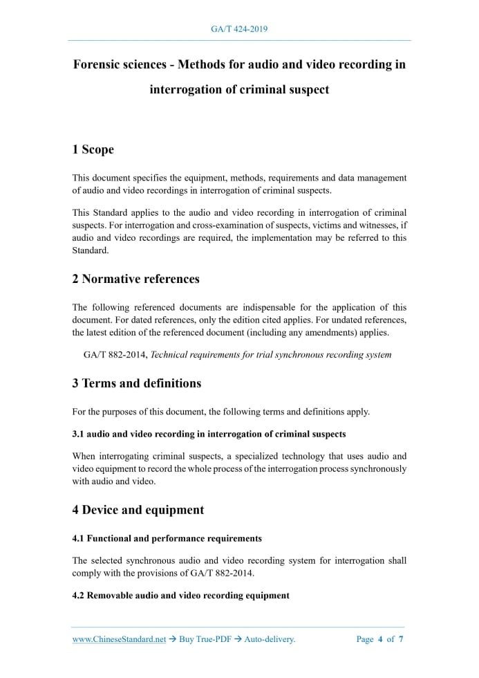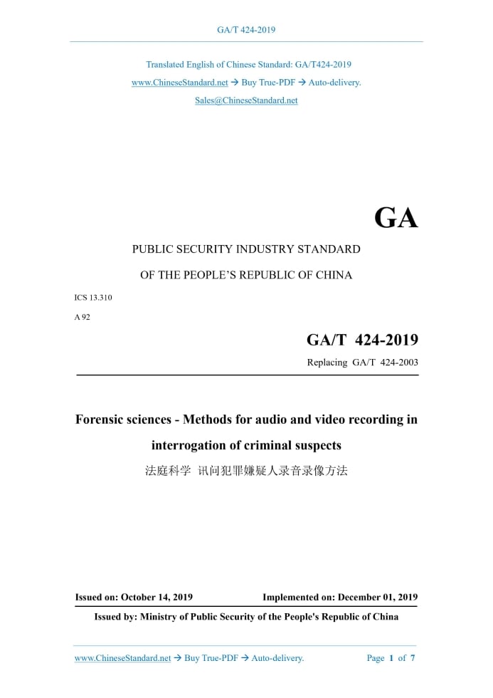 GA/T 424-2019: Forensic sciences--Methods for audio and video recording in interrogation of criminal suspects Delivery: 9 seconds. True-PDF full-copy in English & invoice will be downloaded + auto-delivered via email. See step-by-step procedure Status: Valid GA/T 424: Historical versions