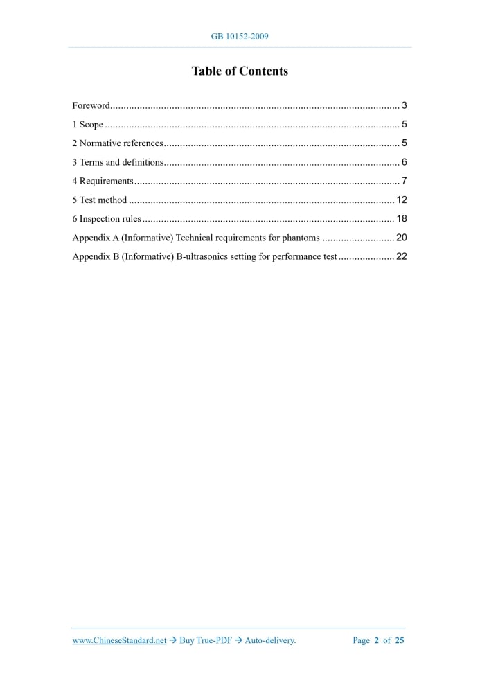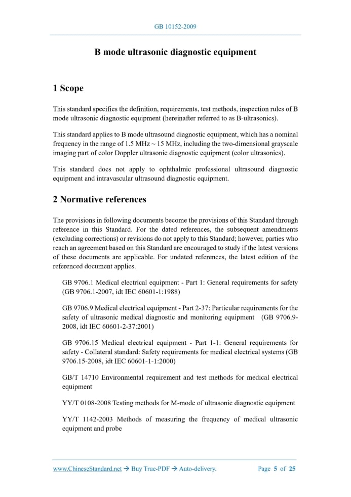 Similar standardsGB 10152-2009: B mode ultrasonic diagnostic equipment---This is an excerpt. Full copy of true-PDF in English version (including equations, symbols, images, flow-chart, tables, and figures etc.), auto-downloaded/delivered in 9 seconds, can be purchased online: https://www.ChineseStandard.net/PDF.aspx/GB10152-2009NATIONAL STANDARD OF THE PEOPLE’S REPUBLIC OF CHINA ICS 11.40.55; 11.040.50 C 41 Replacing GB 10152-1997 B mode ultrasonic diagnostic equipment Issued on. NOVEMBER 15, 2009 Implemented on. DECEMBER 01, 2010 Issued by. General Administration of Quality Supervision, Inspection and Quarantine of PRC; Standardization Administration of PRC. Table of ContentsForeword... 3 1 Scope... 5 2 Normative references... 5 3 Terms and definitions... 6 4 Requirements... 7 5 Test method... 12 6 Inspection rules... 18 Appendix A (Informative) Technical requirements for phantoms... 20 Appendix B (Informative) B-ultrasonics setting for performance test... 22ForewordAll technical content of this standard is mandatory. This standard replaces GB 10152-1997 "B mode ultrasonic diagnostic equipment". The main changes of this standard, as compared with GB 10152-1997, are as follows. - ADD 8 new definitions; - In Chapter 4 "Requirements", ADD 5 technical index, including slice thickness, perimeter and area measurement deviation, M-mode time display error, 3D reconstruction volume calculation deviation, use functional requirements; - The technical requirements in Table 1 are the minimum requirements for the technical performance of the equipment, according to the probe type and nominal frequency; the manufacturer can publish the requirements, which are better than the above index, in the accompanying document; - In Chapter 5 "Test methods", SPECIFY the corresponding test methods, for the added technical index; - SIMPLIFY Chapter 6 "Inspection rules"; DELETE the content of exit-factory inspection; - DELETE the contents of Chapter 7 "Marking and instructions for use", from the original standard; - Fully IMPLEMENT the general safety standard GB 9706.1; DELETE the original normative appendix A "Safety"; CHANGE the original informative appendix C "Technical requirements for phantoms" to appendix A, making certain modifications; - DELETE the original normative appendix B "Grading and performance requirements of B mode ultrasonic diagnostic equipment". ADD the informative appendix B "B-ultrasound settings during performance testing". Appendix A and Appendix B of this standard are informative appendixes. This standard was proposed by the State Food and Drug Administration. This standard shall be under the jurisdiction of the National Standardization Technical Committee of Medical Electrical Appliances (SAC/TC 10). Drafting organization of this standard. National Wuhan Medical Ultrasonic Instrument Quality Supervision and Testing Center. The main drafters of this standard. Wang Zhijian, busy Anshi. This standard replaces the standard previously issued as follows. - GB 10152-1988, GB 10153-1988; - GB 10152-1997. B mode ultrasonic diagnostic equipment1 ScopeThis standard specifies the definition, requirements, test methods, inspection rules of B mode ultrasonic diagnostic equipment (hereinafter referred to as B-ultrasonics). This standard applies to B mode ultrasound diagnostic equipment, which has a nominal frequency in the range of 1.5 MHz ~ 15 MHz, including the two-dimensional grayscale imaging part of color Doppler ultrasonic diagnostic equipment (color ultrasonics).2 Normative referencesThe provisions in following documents become the provisions of this Standard through reference in this Standard. For the dated references, the subsequent amendments (excluding corrections) or revisions do not apply to this Standard; however, parties who reach an agreement based on this Standard are encouraged to study if the latest versions of these documents are applicable. For undated references, the latest edition of the referenced document applies. GB 9706.1 Medical electrical equipment - Part 1.General requirements for safety (GB 9706.1-2007, idt IEC 60601-1.1988)3 Terms and definitionsThe following terms and definitions apply to this standard. The distance, between the phantom scanning surface (acoustic window) and the nearest clearly imaged phantom target line.4 RequirementsThe deviation, between the acoustic operating frequency and the nominal frequency, shall be within ±15%.5 Test methodFor variable frequency probes or broadband probes, if the manufacturer has special requirements in the instruction manual, the probe frequency can also be set to the optimum state for testing, according to the requirements of the instruction manual. The measurement of the acoustic operating frequency and frequency range shall be carried out, in accordance with the provisions of YY/T 1142.6 Inspection rulesProduct inspection is divided into exit-factory inspection and type inspection. The inspection items and judgment rules of the exit-factory inspection are stipulated by the manufacturer.Appendix A(Informative) Technical requirements for phantoms When carrying out the test of B-ultrasonics dead zone, penetration depth, axial resolution, lateral resolution, accuracy of longitudinal and lateral geometrical position, the technical parameters of the phantom, which is used in the test, are as follows.Appendix B(Informative) B-ultrasonics setting for performance test Various combinations of B-ultrasonics settings and probes make it impossible to test in all combinations. Therefore, for each probe, it is only tested at the specified settings. ......Source: Above contents are excerpted from the full-copy PDF -- translated/reviewed by: www.ChineseStandard.net / Wayne Zheng et al. Tips & Frequently Asked Questions:Question 1: How long will the true-PDF of English version of GB 10152-2009 be delivered?Answer: The full copy PDF of English version of GB 10152-2009 can be downloaded in 9 seconds, and it will also be emailed to you in 9 