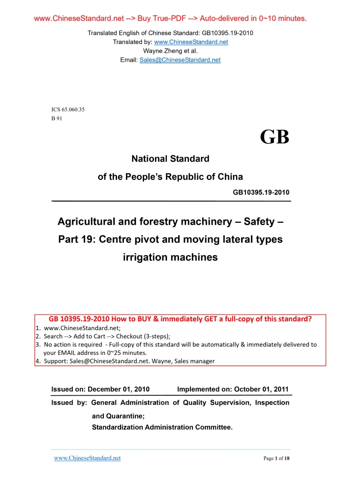 GB 10395.19-2010: Agricultural and forestry machinery -- Safety -- Part 19: Centre pivot and moving lateral types irrigation machines Delivery: 9 seconds. True-PDF full-copy in English & invoice will be downloaded + auto-delivered via email. See step-by-step procedure Status: Valid