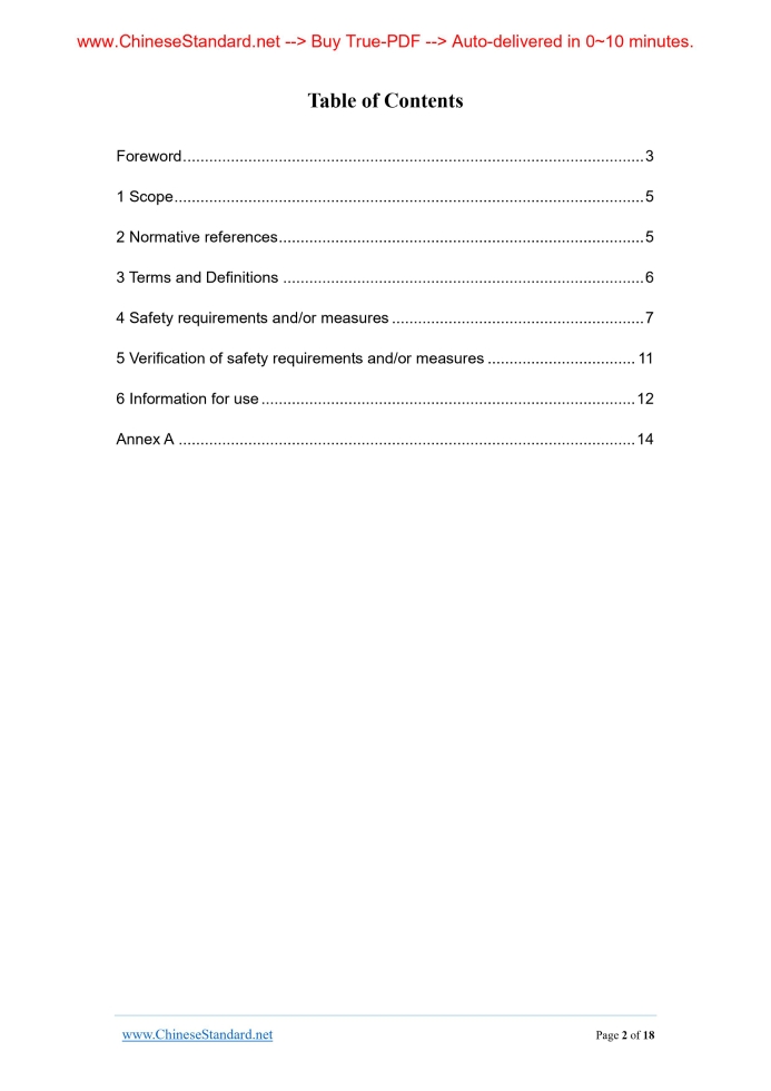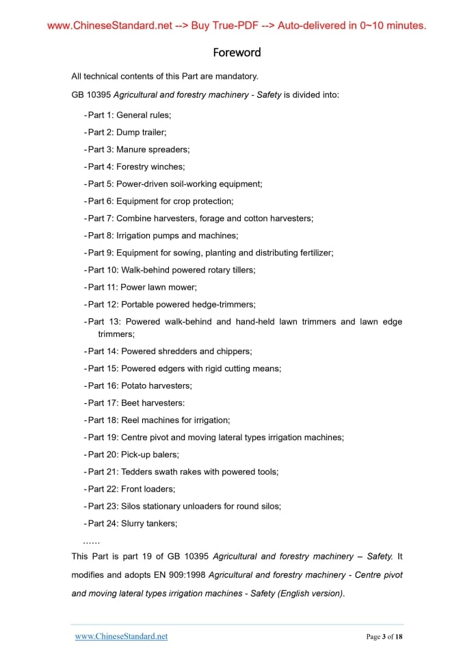 Similar standardsGB 10395.19-2010: Agricultural and forestry machinery -- Safety -- Part 19: Centre pivot and moving lateral types irrigation machines---This is an excerpt. Full copy of true-PDF in English version (including equations, symbols, images, flow-chart, tables, and figures etc.), auto-downloaded/delivered in 9 seconds, can be purchased online: https://www.ChineseStandard.net/PDF.aspx/GB10395.19-2010 ICS 65.060.35 B 91 GB National Standard of the People’s Republic of China Agricultural and forestry machinery – Safety – Part 19. Centre pivot and moving lateral types irrigation machines Issued on: DECEMBER 01, 2010 Implemented on: OCTOBER 01, 2011 Issued by. General Administration of Quality Supervision, Inspection and Quarantine; Standardization Administration Committee. Table of ContentsForeword ... 3 1 Scope ... 5 2 Normative references ... 5 3 Terms and Definitions ... 6 4 Safety requirements and/or measures ... 7 5 Verification of safety requirements and/or measures ... 11 6 Information for use ... 12 Annex A ... 14ForewordAll technical contents of this Part are mandatory. GB 10395 Agricultural and forestry machinery - Safety is divided into. - Part 1. General rules; - Part 2. Dump trailer; - Part 3. Manure spreaders; - Part 4. Forestry winches; - Part 5. Power-driven soil-working equipment; - Part 6. Equipment for crop protection; - Part 7. Combine harvesters, forage and cotton harvesters; - Part 8. Irrigation pumps and machines; - Part 9. Equipment for sowing, planting and distributing fertilizer; - Part 10. Walk-behind powered rotary tillers; - Part 11. Power lawn mower; - Part 12. Portable powered hedge-trimmers; - Part 13. Powered walk-behind and hand-held lawn trimmers and lawn edge trimmers; - Part 14. Powered shredders and chippers; - Part 15. Powered edgers with rigid cutting means; - Part 16. Potato harvesters; - Part 17. Beet harvesters. - Part 18. Reel machines for irrigation; - Part 19. Centre pivot and moving lateral types irrigation machines; - Part 20. Pick-up balers; - Part 21. Tedders swath rakes with powered tools; - Part 22. Front loaders; - Part 23. Silos stationary unloaders for round silos; - Part 24. Slurry tankers; ... This Part is part 19 of GB 10395 Agricultural and forestry machinery – Safety. It modifies and adopts EN 909.1998 Agricultural and forestry machinery - Centre pivot and moving lateral types irrigation machines - Safety (English version). This Part is redrafted in accordance with EN 909.1998. The technical differences with EN 909.1998 are. -QUOTE those national standards which adopt international standards or European standards, and which do not equivalently adopt international standards or European standards. To use it easily, there are some editorial changes to EN 909.1999 as follows. a) CHANGE “this European standard” to “this Part”; b) DELETE the foreword and introduction of EN 909.1999; c) MODIFY the scope of EN 909.1999; d) USE decimal point “.” to replace comma “,” at where it is regard as decimal point; e) DELETE Annex ZA “Relationship between this standard and European EC Directives” of EN 909.1999. Annex A of this Part is normative. This Part was proposed by China Machinery Industry Federation. This Part shall be centralized by National Technical Committee on Agricultural Machinery of Standardization Administration of China (SAC/TC 201). Drafting organizations of this Part. Chinese Academy of Agricultural Mechanization Sciences, and Research Center of Fluid Machinery Engineering and Technology. The main drafters of this Part. Zhang Xiansheng, Wang Yang, Zhang Jinfeng, Huang Caijin, Tang Yue, Zhang Qi, Yuan Jianping, and Cao Weidong. Agricultural and forestry machinery - Safety - Part 19. Centre pivot and moving lateral types irrigation machines1 ScopeThis Part of GB 10395 specifies the safety requirements and their verification for the design and manufacture of center pivot and moving lateral types irrigation machines that are electrically powered. It also specifies that the manufacturer shall provide safety operation information. NOTE Figures 1 to 5 give illustrations of these machines. This Part applies primarily to centre pivot and moving lateral types irrigation machines. Hazards due to the use of the pump associated with center pivot and moving lateral types irrigation machines (Hereafter referred to as irrigation machines) are not dealt with. Hazards induced by the use of these machines for pesticide products and liquid fertilizer application are also not dealt with. Environmental aspects have not been considered in this Part.2 Normative referencesThe provisions in following documents become the provisions of this Part through reference in this Part of GB 10395. For dated references, the subsequent amendments (excluding corrections) or revisions do not apply to this Part. However, parties who reach an agreement based on this Part are encouraged to study if the latest versions of these documents are applicable. For undated references, the latest edition of the referenced document applies. GB 4208 Degrees of protection provided by enclosure (IP code)(GB 4208-2008, IEC 60529.2001, IDT) GB 5226.1 Electrical safety of machinery - Electrical equipment of machines - Part 1. General requirements (GB 5226.1-2008, IEC 60204-1.2005, IDT) GB 10395.1-2009 Agricultural and forestry machinery - Safety - Part 1.General Table A.2 List of hazards due to mobility Hazards Solutions given by this Part A.12 Inadequate lighting of moving/working area not relevant A.13 Hazards due to sudden movement, instability, etc. not dealt with A.14 Inadequate/ unergonomic design of driving/ operating position A.14.1 Hazards due to dangerous environments (contact with moving parts, exhaust gases etc.) not relevant A.14.2 inadequate visibility from drivers/operators position not relevant A.14.3 inadequate seat/seating (SIP) not relevant A.14.4 Inadequate/unergonomic design/positioning of controls not relevant A.14.5 starting/movi