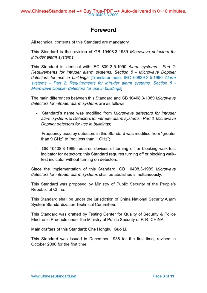 GB 10408.3-2000: Detectors for intruder alarm systems. Part 3: Microwave doppler detectors for use in building---This is an excerpt. Full copy of true-PDF in English version (including equations, symbols, images, flow-chart, tables, and figures etc.), auto-downloaded/delivered in 9 seconds, can be purchased online: https://www.ChineseStandard.net/PDF.aspx/GB10408.3-2000 GB NATIONAL STANDARD OF THE PEOPLE’S REPUBLIC OF CHINA ICS 13.310 A 91 Detectors for intruder alarm systems - Part 3. Microwave Doppler detectors for use in buildings (idt IEC 839-2-5.1990 / [Translator note. IEC 60839-2-5.1990]) Issued on: OCTOBER 17, 2000 Implemented on: JUNE 1, 2001 Issued by. China State Bureau of Quality and Technical Supervision Table of ContentsForeword ... 3 IEC Foreword ... 4 1 Scope ... 5 2 Normative references ... 5 3 Definitions ... 6 4 General considerations ... 6 5 Technical requirements ... 7 6 Test procedures ... 9ForewordAll technical contents of this Standard are mandatory. This Standard is the revision of GB 10408.3-1989 Microwave detectors for intruder alarm systems. This Standard is identical with IEC 839-2-5.1990 Alarm systems - Part 2. Requirements for intruder alarm systems. Section 5 - Microwave Doppler detectors for use in buildings [Translator note. IEC 60839-2-5.1990 Alarm systems – Part 2. Requirements for intruder alarm systems. Section 5 - Microwave Doppler detectors for use in buildings]. The main differences between this Standard and GB 10408.3-1989 Microwave detectors for intruder alarm systems are as follows. - Standard’s name was modified from Microwave detectors for intruder alarm systems to Detectors for intruder alarm systems - Part 3. Microwave Doppler detectors for use in buildings; - Frequency used by detectors in this Standard was modified from “greater than 9 GHz” to “not less than 1 GHz”; - GB 10408.3-1989 requires devices of turning off or blocking walk-test indicator for detectors; this Standard requires turning off or blocking walk- test indicator without turning on detectors. Since the implementation of this Standard, GB 10408.3-1989 Microwave detectors for intruder alarm systems shall be abolished simultaneously. This Standard was proposed by Ministry of Public Security of the People's Republic of China. This Standard shall be under the jurisdiction of China National Security Alarm System Standardization Technical Committee. This Standard was drafted by Testing Center for Quality of Security & Police Electronic Products under the Ministry of Public Security of P. R. CHINA. Main drafters of this Standard. Che Hongku, Guo Li. This Standard was issued in December 1988 for the first time, revised in October 2000 for the first time. Detectors for intruder alarm systems - Part 3. Microwave Doppler detectors for use in buildings1 ScopeThis Standard gives the specific requirements and test procedures for microwave Doppler detectors for use in intruder alarm systems installed in buildings. This Standard is an addition to the general requirements for detectors for use in intruder alarm systems as specified in GB 10408.1 Detectors for intruder alarm systems - Part 1. Requirements for detectors - General, and it shall also be used in conjunction with the standard for General requirements for alarm system, IEC Publication 839-1-1. The object of this Standard is to specify those requirements for microwave Doppler detectors which will ensure that they will perform satisfactorily and minimize false alarms.2 Normative referencesThe following standards contain the provisions which, through reference in this Standard, constitute the provisions of this Standard. At the time of publication, the editions indicated were valid. All standards are subject to revision, and parties to agreements based on this Standard are encouraged to investigate the possibility of applying the most recent editions of the standards indicated below. GB 10408.1-2000 Detectors for intruder alarm systems - Part 1. Requirements for detectors – General [idt IEC 839-2-2.1987] IEC 68-1.1988 Environmental testing - Part 1. General and guidance IEC 839-1-1.1988 Alarm systems - Part 1. General requirements, Section One - General IEC 839-1-3.1988 Section Three - Environmental testing The tests may be carried out at any range within the range adjustment of the detector. The range control shall not be altered during the environmental tests. The reference target shall move towards the detector from directly in front of the detector beyond the adjusted range at a speed of approximately 1 m/s. The distance from the detector when an alarm condition occurs shall be measure and recorded. The distance from the detector where an alarm condition occurs after each environmental test shall not vary by more than 10% of the initial distance. The tests may be simulated provided that it can be shown that the simulation gives the same results as the test procedure described. For the following tests the detector shall be set for maximum stated range. - electrical spikes; - electrostatic discharge; - electromagnetic fields. ......Source: Above contents are excerpted from the full-copy PDF -- translated/reviewed by: www.ChineseStandard.net / Wayne Zheng et al. Tips & Frequently Asked Questions:Question 1: How long will the true-PDF of English version of GB 10408.3-2000 be delivered?Answer: The full copy PDF of English version of GB 10408.3-2000 can be downloaded in 9 seconds, and it will also be emailed to you in 9 seconds (double mechanisms to ensure the delivery reliably), with PDF-invoice.Question 2: Can I share the purchased PDF of GB 10408.3-2000_English with my colleagues?Answer: Yes. The purchased PDF of GB 10408.3-2000_English will be deemed to be sold to your employer/organization who actually paid for it, including your colleagues and your employer's intranet.Question 3: Does the price include tax/VAT?Answer: Yes. Our tax invoice, downloaded/delivered in 9 seconds, includes all tax/VAT and complies with 10
