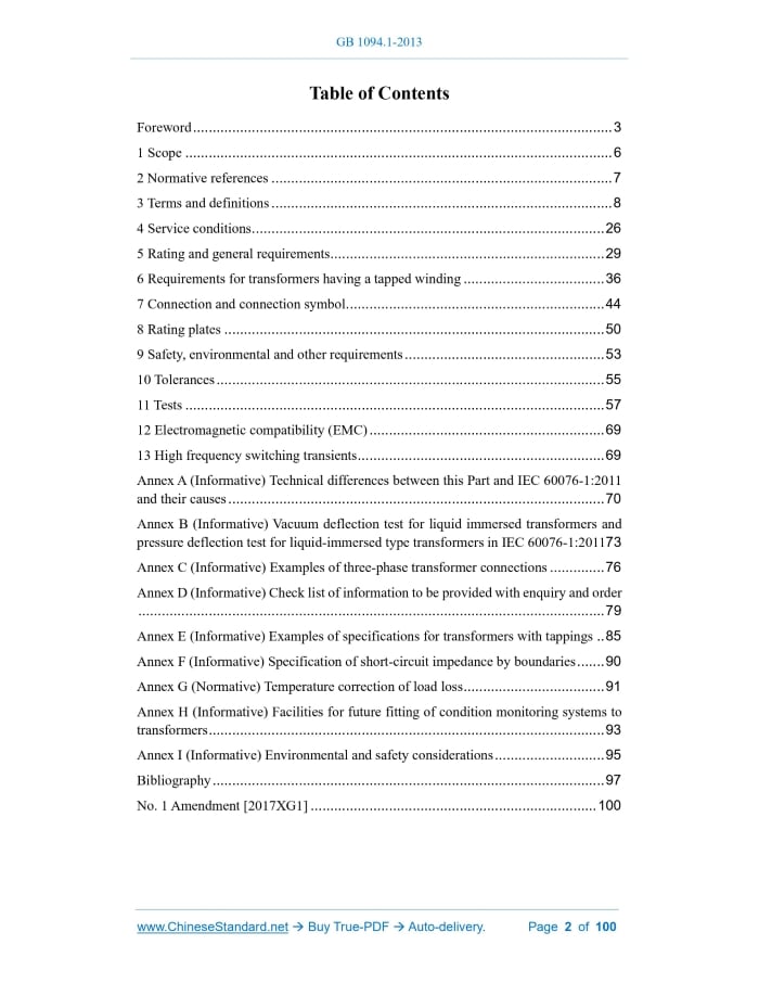 Similar standardsGB 1094.1-2013: [GB/T 1094.1-2013, Including 2017XG1] Power transformers -- Part 1: General---This is an excerpt. Full copy of true-PDF in English version (including equations, symbols, images, flow-chart, tables, and figures etc.), auto-downloaded/delivered in 9 seconds, can be purchased online: https://www.ChineseStandard.net/PDF.aspx/GB1094.1-2013GB NATIONAL STANDARD OF THE PEOPLE’S REPUBLIC OF CHINA ICS 29.180 K 41 Replacing GB 1094.1-1996 Power transformers - Part 1.General (IEC 60076-1.2011, MOD) Transferred to a recommended standard according to the Standardization Administration’s announcement No. 7, 2017 [Including 2017XG1] Issued on. DECEMBER 17, 2013 Implemented on. DECEMBER 14, 2014 Issued by. General Administration of Quality Supervision, Inspection and Quarantine; Standardization Administration of the People’s Republic of China. Table of ContentsForeword... 3 1 Scope... 6 2 Normative references... 7 3 Terms and definitions... 8 4 Service conditions... 26 5 Rating and general requirements... 29 6 Requirements for transformers having a tapped winding... 36 7 Connection and connection symbol... 44 8 Rating plates... 50 9 Safety, environmental and other requirements... 53 10 Tolerances... 55 11 Tests... 57 12 Electromagnetic compatibility (EMC)... 69 13 High frequency switching transients... 69 Annex A (Informative) Technical differences between this Part and IEC 60076-1.2011 and their causes... 70 Annex B (Informative) Vacuum deflection test for liquid immersed transformers and pressure deflection test for liquid-immersed type transformers in IEC 60076-1.201173 Annex C (Informative) Examples of three-phase transformer connections... 76 Annex D (Informative) Check list of information to be provided with enquiry and order ... 79 Annex E (Informative) Examples of specifications for transformers with tappings.. 85 Annex F (Informative) Specification of short-circuit impedance by boundaries... 90 Annex G (Normative) Temperature correction of load loss... 91 Annex H (Informative) Facilities for future fitting of condition monitoring systems to transformers... 93 Annex I (Informative) Environmental and safety considerations... 95 Bibliography... 97 No. 1 Amendment [2017XG1]... 100ForewordClause 2, Clause 3, 11.2 ~ 11.12, Clause 12, Clause 13, Annex A ~ Annex F, Annex H, and Annex I of this Part are recommended, and the rest are mandatory. GB 1094 Power transformers currently includes the following parts. -- Part 1.General; -- Part 2.Temperature rise for liquid-immersed transformers; -- Part 3.Insulation levels, dielectric tests and external clearances in air; -- Part 4.Guide to the lightning impulse and switching impulse testing - Power transformers and reactors; -- Part 5.Ability to withstand short circuit; -- Part 6.Reactors; -- Part 7.Loading guide for oil-immersed power transformers; -- Part 10.Determination of sound levels; -- Part 10.1.Determination of sound levels - Application guide; -- Part 11.Dry-type transformers; -- Part 12.Loading guide for dry-type power transformers; -- Part 14.Liquid-immersed power transformer using high-temperature insulation materials; -- Part 16.Transformers for wind turbine applications. This Part is Part 1 of GB 1094. This Part is drafted in accordance with the rules given in GB/T 1.1-2009. This Part replaces GB 1094.1-1996, Power transformers - Part 1.General. Compared with GB 1094.1-1996, the main technical changes are as follows. -- Add the definition of harmonic content; -- Add a subclause on transport; -- Add functional method of specification; -- Add connection symbols for single phase transformers; -- Add safety and environmental requirements; -- Add requirements for liquid preservation systems; -- Add a clause on DC currents in neutral circuits; -- Adjust the test items; -- Add contents such as leak testing with pressure for liquid-immersed type transformers (tightness test), vacuum deflection test for liquid immersed transformers, pressure deflection test for liquid-immersed type transformers, and vacuum tightness test on site for liquid-immersed type transformers; -- Add informative annexes on facilities for condition monitoring to transformers and environmental and safety considerations. This Part uses the re-drafting method to modify IEC 60076-1.2011 Power transformers - Part 1.General. There are technical differences between this Part and IEC 60076-1.2011.The terms which are involved in these differences have been marked by vertical single lines (|) on the outer page margins; Annex A gives a list of corresponding technical differences and their causes. This Part also makes the following editorial changes. -- Change “Ei” and “Ii” in the key of 3.13.3 in IEC 60076-2011 to “E2i” and “I2i” respectively; -- Combine Figure 1a), Figure 1b) and Figure 1c) in IEC 60076-1.2011 into one figure; -- Remove the content of “Note” of 7.1.2 in IEC 60076-1.2011; -- Make the example under 7.2.4 in IEC 60076-1.2011 the content of 7.2.5; -- Adjust the layout of Table 1 in IEC 60076-1.2011; -- Modify the tap-position in Table B.2 and Table B.3 in IEC 60076-1.2011; -- Add the informative Annex A, where the technical differences between this Part and IEC 60076-1.2011 and the causes are listed; -- Add the informative Annex B, where the contents – vacuum deflection test for liquid immersed transformers and pressure deflection test for liquid-immersed type transformers – not adopted from IEC 60076-1.2011, are listed; -- Modify Annex A, Annex B, Annex C, Annex D, Annex E, Annex F and Annex G in IEC 60076-1.2011 to Annex D, Annex E, Annex F, Annex C, Annex G, Annex H and Annex I. Please note that some of the contents of this document may involve patents. The issuing organization of this document is not responsible for identifying these patents. This Part was proposed by China Electrical Equipment Industry Association. This Part shall be under the jurisdiction of National Technical Committee on Transformer of Standar