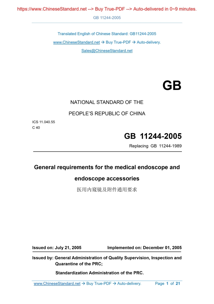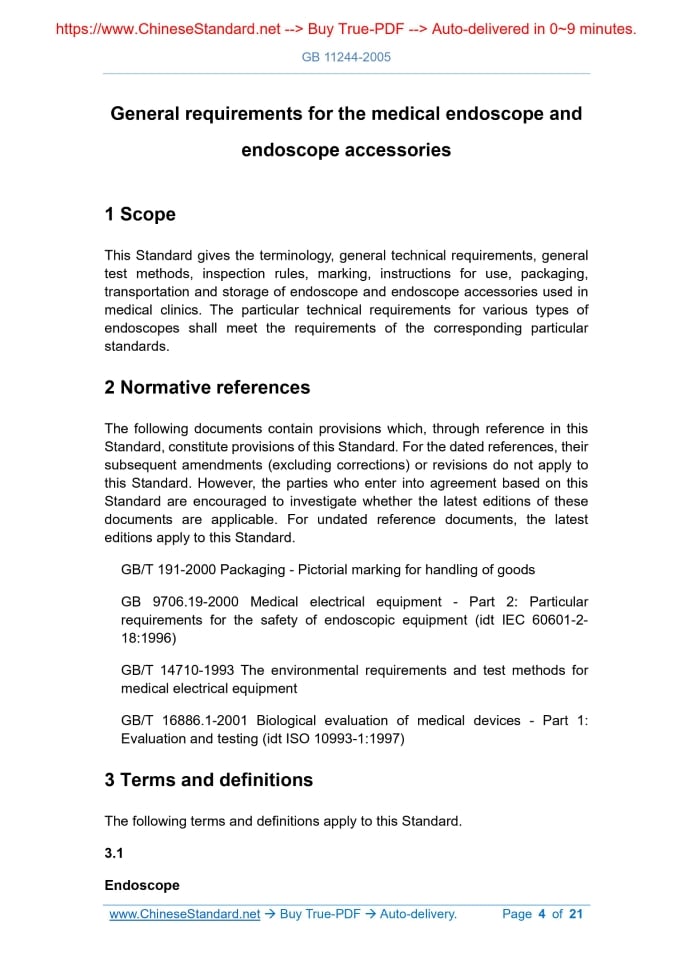 Similar standardsGB 11244-2005: General requirements for the medical endoscope and endoscope accessories---This is an excerpt. Full copy of true-PDF in English version (including equations, symbols, images, flow-chart, tables, and figures etc.), auto-downloaded/delivered in 9 seconds, can be purchased online: https://www.ChineseStandard.net/PDF.aspx/GB11244-2005GB NATIONAL STANDARD OF THE PEOPLE’S REPUBLIC OF CHINA ICS 11.040.55 C 40 Replacing GB 11244-1989 General requirements for the medical endoscope and endoscope accessories Issued on. JULY 21, 2005 Implemented on. DECEMBER 01, 2005 Issued by. General Administration of Quality Supervision, Inspection and Quarantine of the PRC; Standardization Administration of the PRC. Table of ContentsForeword... 3 1 Scope... 4 2 Normative references... 4 3 Terms and definitions... 4 4 Requirements... 8 5 Type inspection... 10 6 Inspection rules... 17 7 Marking... 18 8 Instructions for use... 18 9 Packaging, transportation and storage... 20ForewordThis Standard is developed in accordance with the international standard ISO 8600.1997 "Medical endoscopes and endoscopic accessories". In terms of technical content, it is not equivalent to ISO 8600.1997. Used in conjunction with this Standard is GB 9706.19-2000 "Medical electrical equipment - Part 2.Particular requirements for the safety of endoscopic equipment". The main technical differences between this Standard and ISO 8600 are as follows. - Incorporate all the inspection methods of ISO 8600-3 and ISO 8600-4 and the inspection provisions of ISO 8600-1 into this Standard. - According to the actual situation of China, the environmental test adopts the relevant regulations of GB/T 14710. - ADD the requirement of coincidence of lighting source and observation field of view. - The shape and size of the eyepiece are identical to the requirements of DIN58105 "Requirements and inspection of medical endoscopes". - ADD the requirements for inspection rules, packaging, transportation and storage. [Translator note. The original text is reformatted to items, for ease of reading] This Standard was proposed by China Food and Drug Administration. This Standard shall be under the jurisdiction of National Technical Subcommittee on Medical Optics and Instruments of Standardization Administration of China. Drafting organization of this Standard. Shanghai Medical Optical Instrument Co., Ltd. Main drafters of this Standard. Mai Xiuqin, Li Yafen, Xue Xiaoguo, Qian Xiaoyang. General requirements for the medical endoscope and endoscope accessories1 ScopeThis Standard gives the terminology, general technical requirements, general test methods, inspection rules, marking, instructions for use, packaging, transportation and storage of endoscope and endoscope accessories used in medical clinics. The particular technical requirements for various types of endoscopes shall meet the requirements of the corresponding particular standards.2 Normative referencesThe following documents contain provisions which, through reference in this Standard, constitute provisions of this Standard. For the dated references, their subsequent amendments (excluding corrections) or revisions do not apply to this Standard. However, the parties who enter into agreement based on this Standard are encouraged to investigate whether the latest editions of these documents are applicable. For undated reference documents, the latest editions apply to this Standard. GB/T 191-2000 Packaging - Pictorial marking for handling of goods GB 9706.19-2000 Medical electrical equipment - Part 2.Particular requirements for the safety of endoscopic equipment (idt IEC 60601-2- 18.1996)3 Terms and definitionsThe following terms and definitions apply to this Standard. 3.1 Endoscope Medical instruments for observation purposes, with or without lenses; medical devices which go deep into the natural or surgically opened pores of the human body for examination, diagnosis or treatment. 3.2 Endoscope accessory Medical devices which can penetrate the endoscope into the natural or surgically opened pores of the human body; or medical devices which can be used for inspection, treatment, or diagnosis with an endoscope. 3.3 Rigid endoscope The endoscope (endoscope accessory) of which the insertion portion cannot be bent into the human body's natural or surgically opened pore or instrument channel. 3.4 Flexible endoscope The endoscope (endoscope accessory) of which the insertion portion can freely bend into the human body's natural or surgically opened pore or instrument channel. 3.5 French; Fr The measurement method for the size of the endoscope with circular or non- circular cross-section, which is defined as.4 Requirements4.1 Surface and edge 4.2 Maximum insertion portion width The maximum insertion portion width must not be larger than the size specified in the instructions for use provided by the manufacturer. See 8.2 c). 4.3 Minimum insertion channel width The minimum insertion channel width must not be less than the size specified in the instructions for use provided by the manufacturer. See 8.2 h). 4.4 Field of view If the manufacturer has no other special regulations, the deviation of the field of view of optical endoscope from the nominal value provided by the manufacturer shall not exceed 15%. In the product catalog and manual materials, the description of the field of view is not mandatory. 4.7 Coincidence of lighting source and observation field of view At the working distance, the illumination spot shall fill the field of view, without obvious dividing line between bright and dark. 4.8 Safety Endoscopes and endoscope accessories shall meet the requirements of GB 9706.1. 4.9 Biocompatibility The outer surface material of the insertion portion is an external access device, which is in short-term contact with the tissue. Its biocompatibility shall be evaluated according to the requirements of GB/T 16886.1-2001.5 Type inspection5.1 Surface and edge Under sufficient lighting, use 